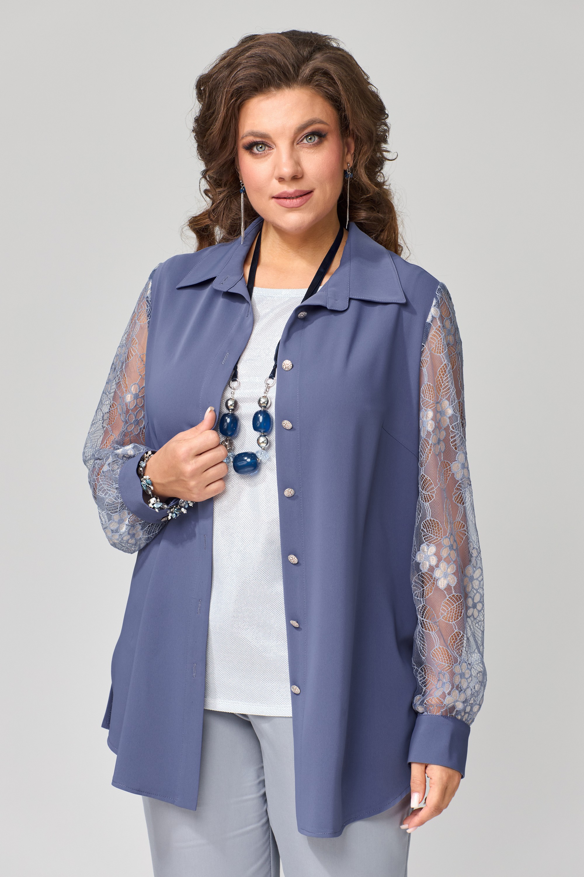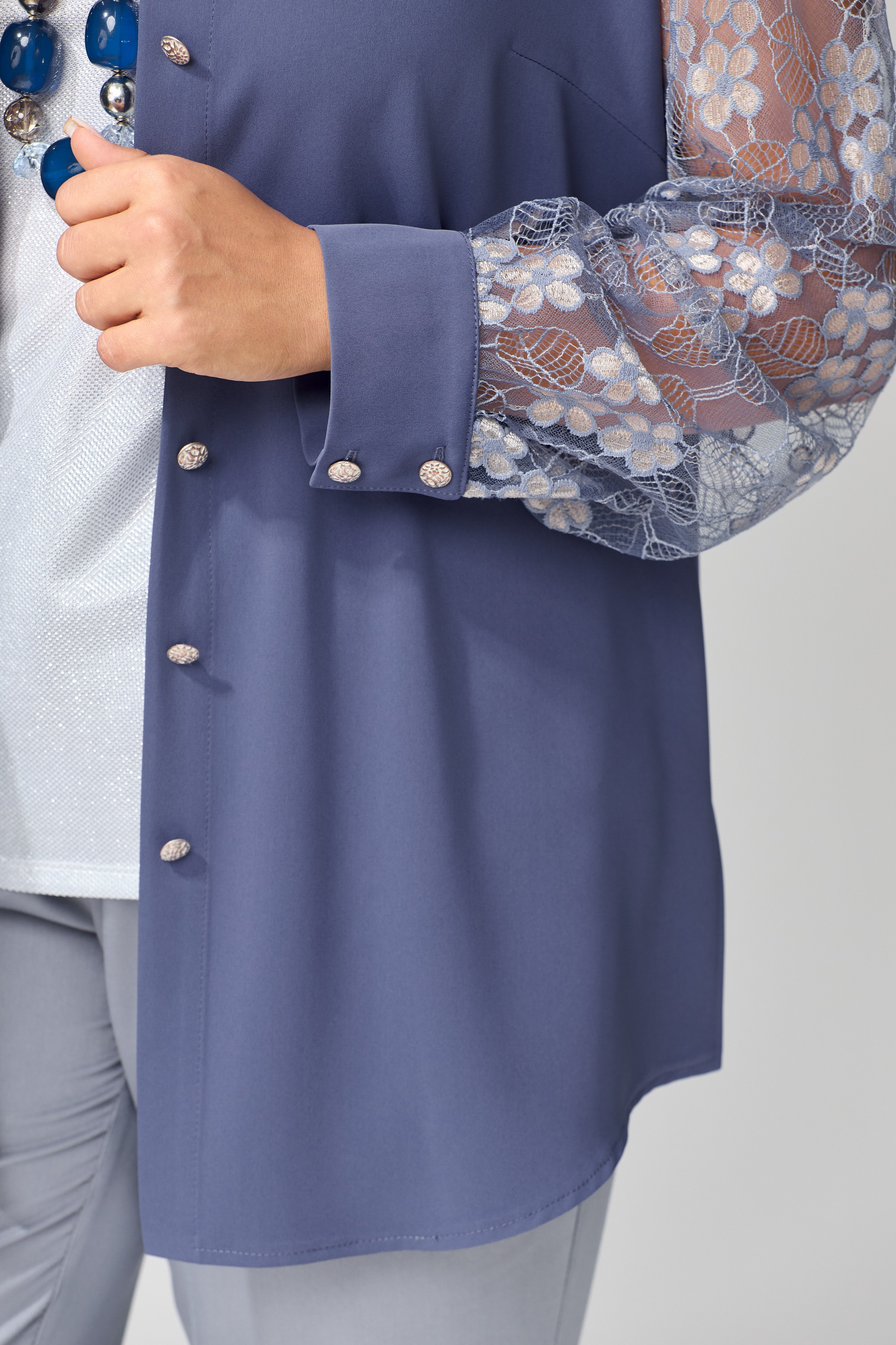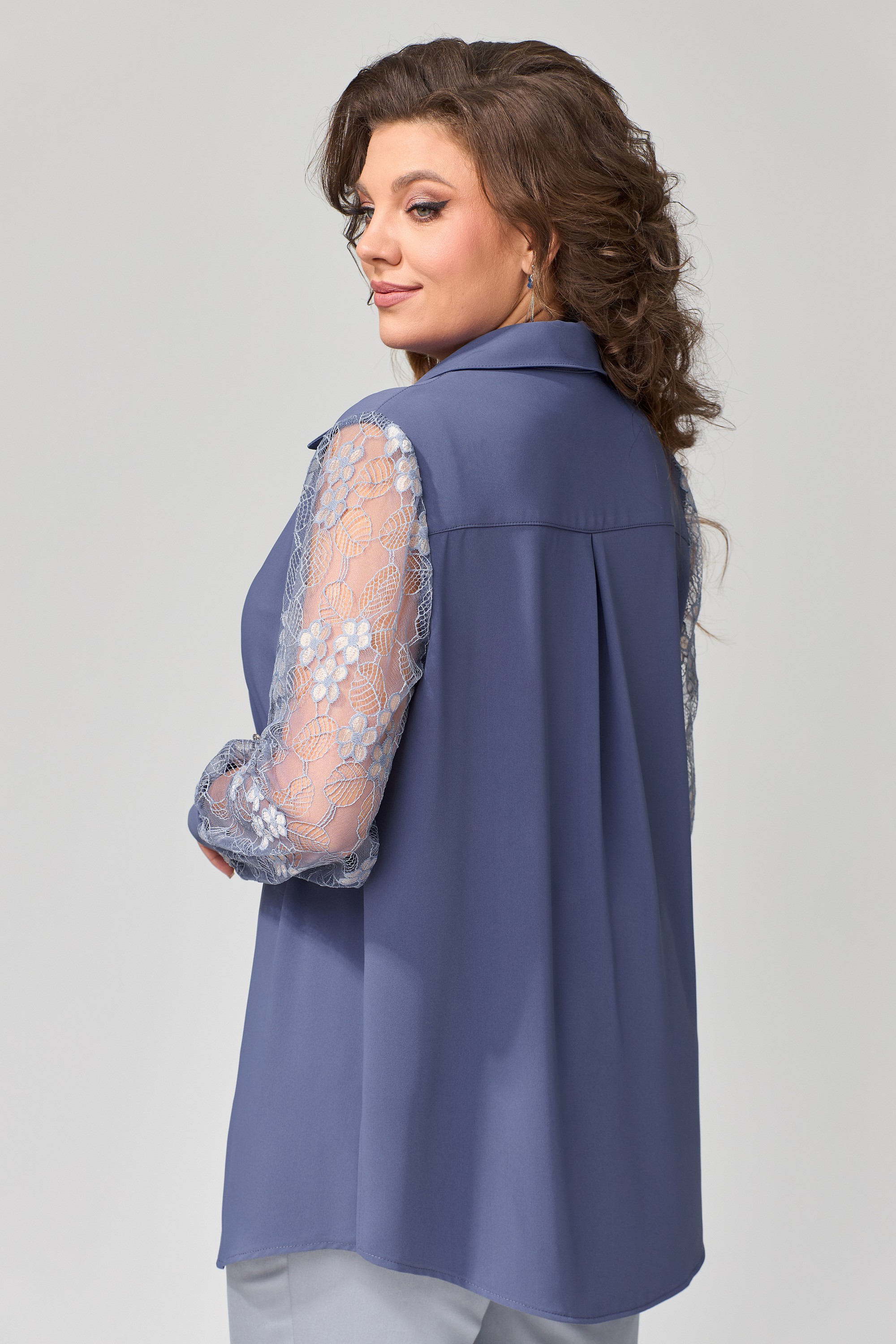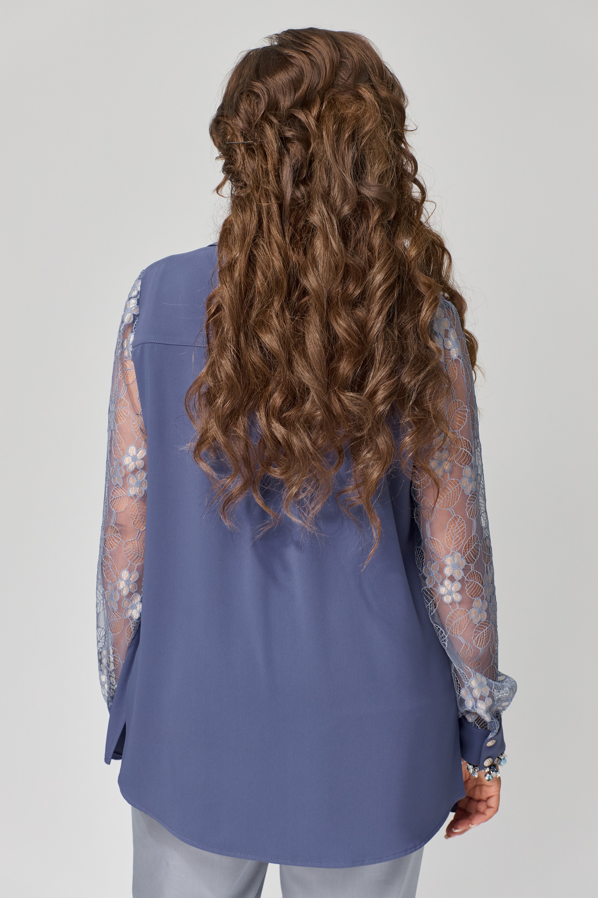 Блузка нарядная "СМЕДА" прямого силуэта. Полочка с застежкой на петли и пуговицы, на груди выточка, на спинке отрезная кокетка и бантовая складка. Воротник в блузке отложной рубашечного типа, на стойке. Низ рукава обработан манжеткой на застежку на петли и пуговицы. Рукав в блузке кружевной.