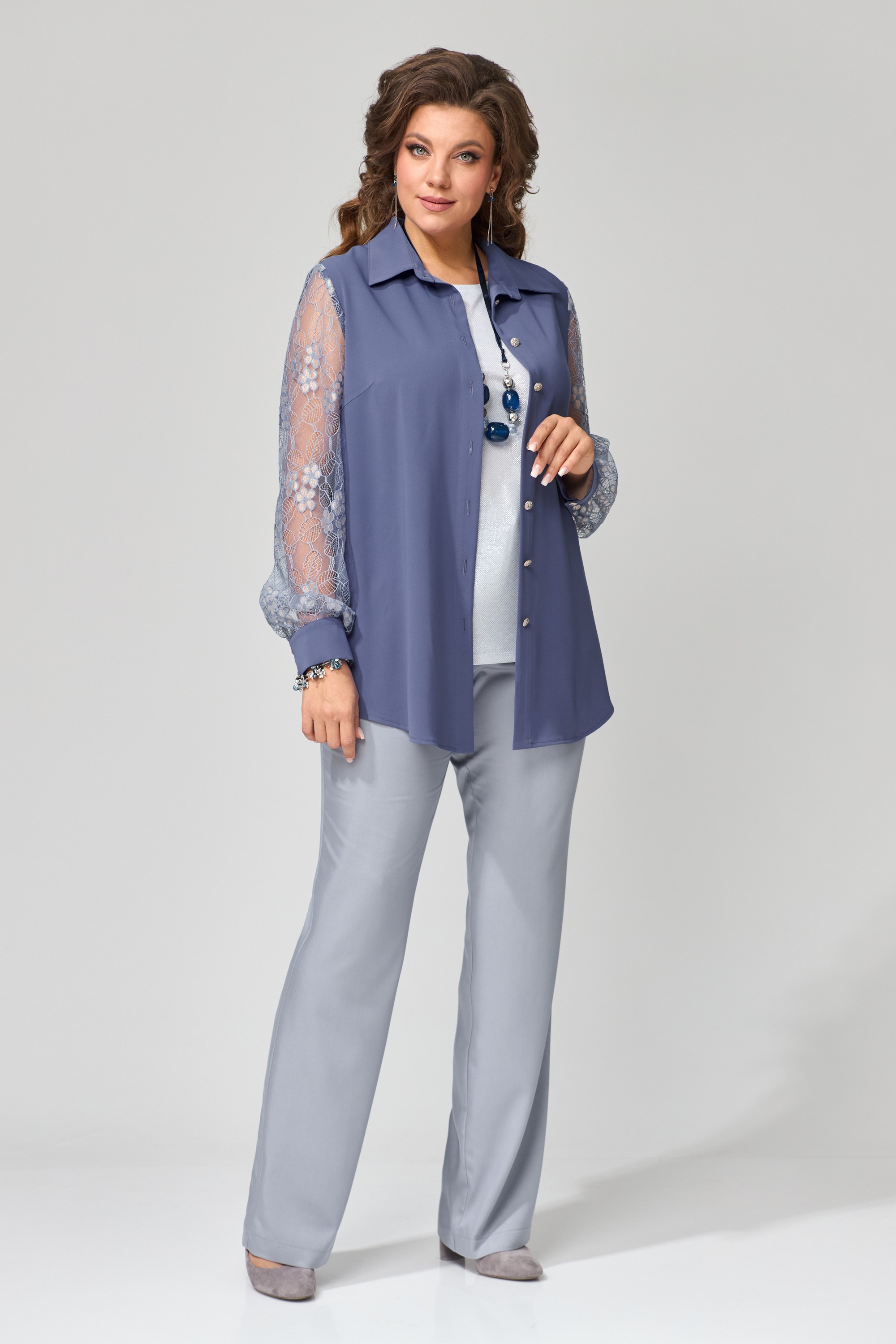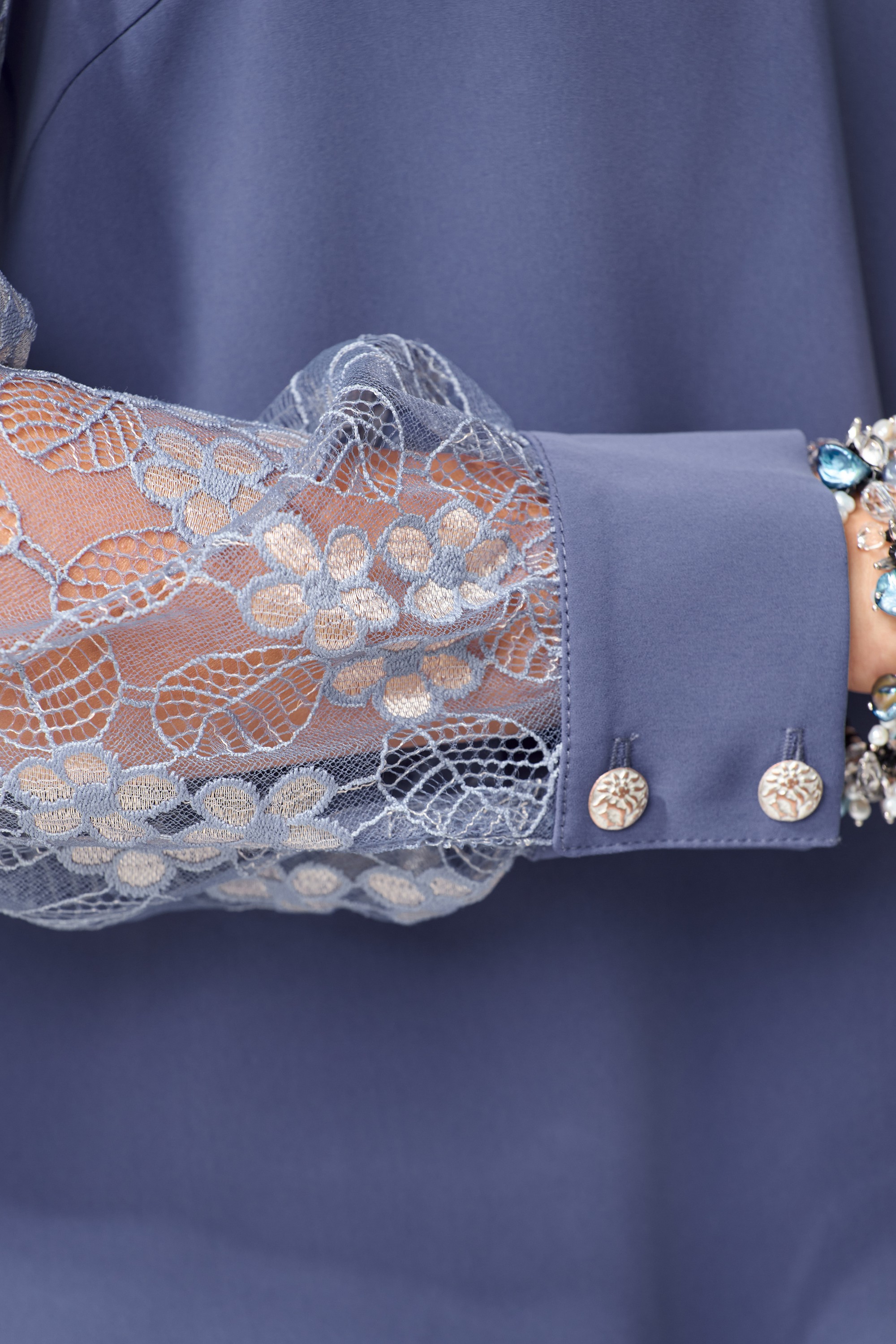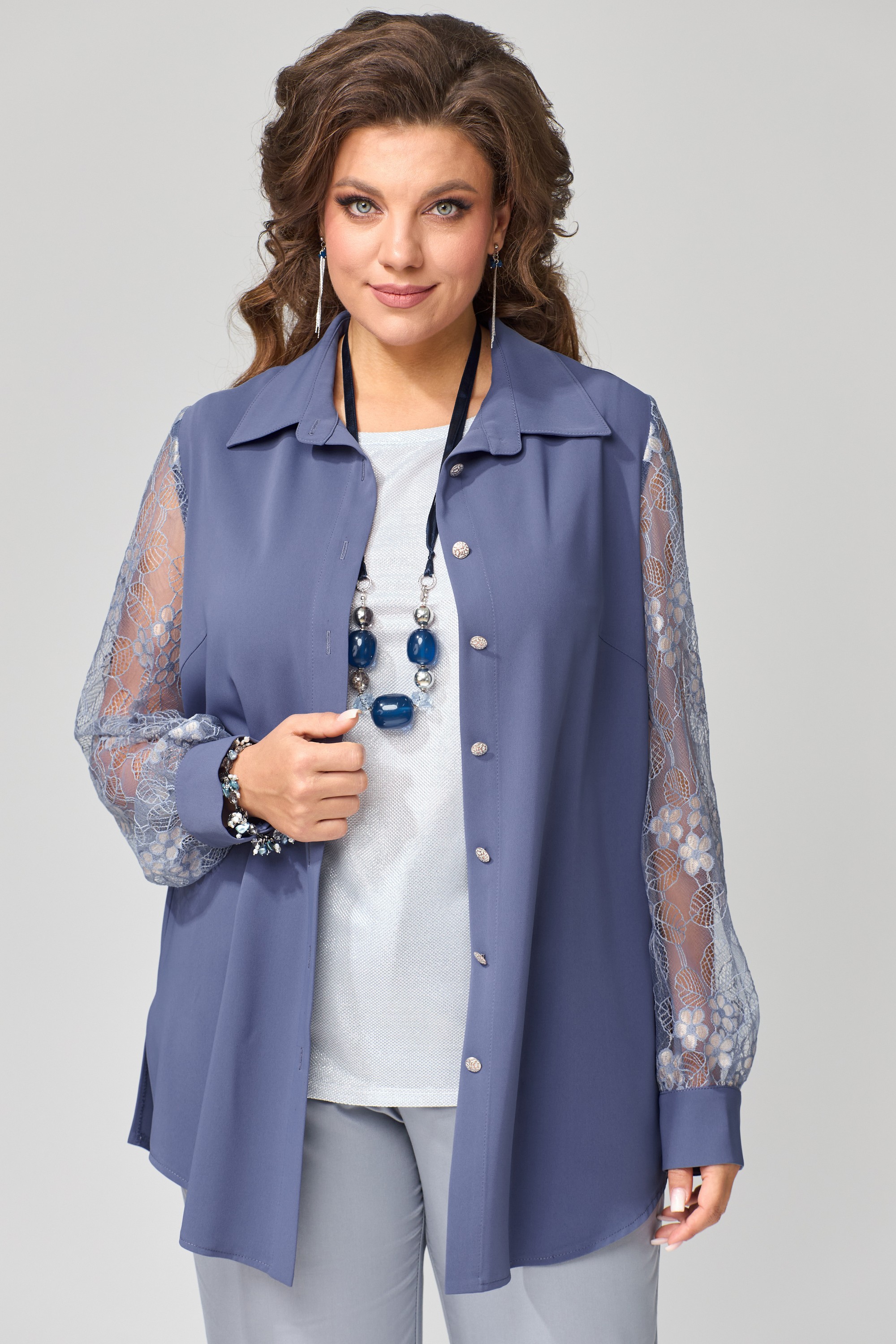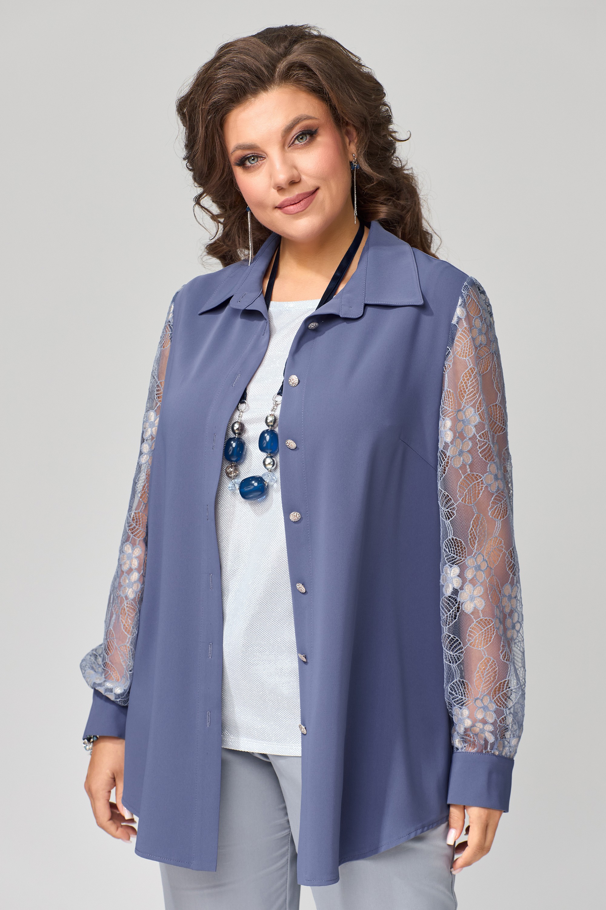 Блузка нарядная "СМЕДА" прямого силуэта. Полочка с застежкой на петли и пуговицы, на груди выточка, на спинке отрезная кокетка и бантовая складка. Воротник в блузке отложной рубашечного типа, на стойке. Низ рукава обработан манжеткой на застежку на петли и пуговицы. Рукав в блузке кружевной.