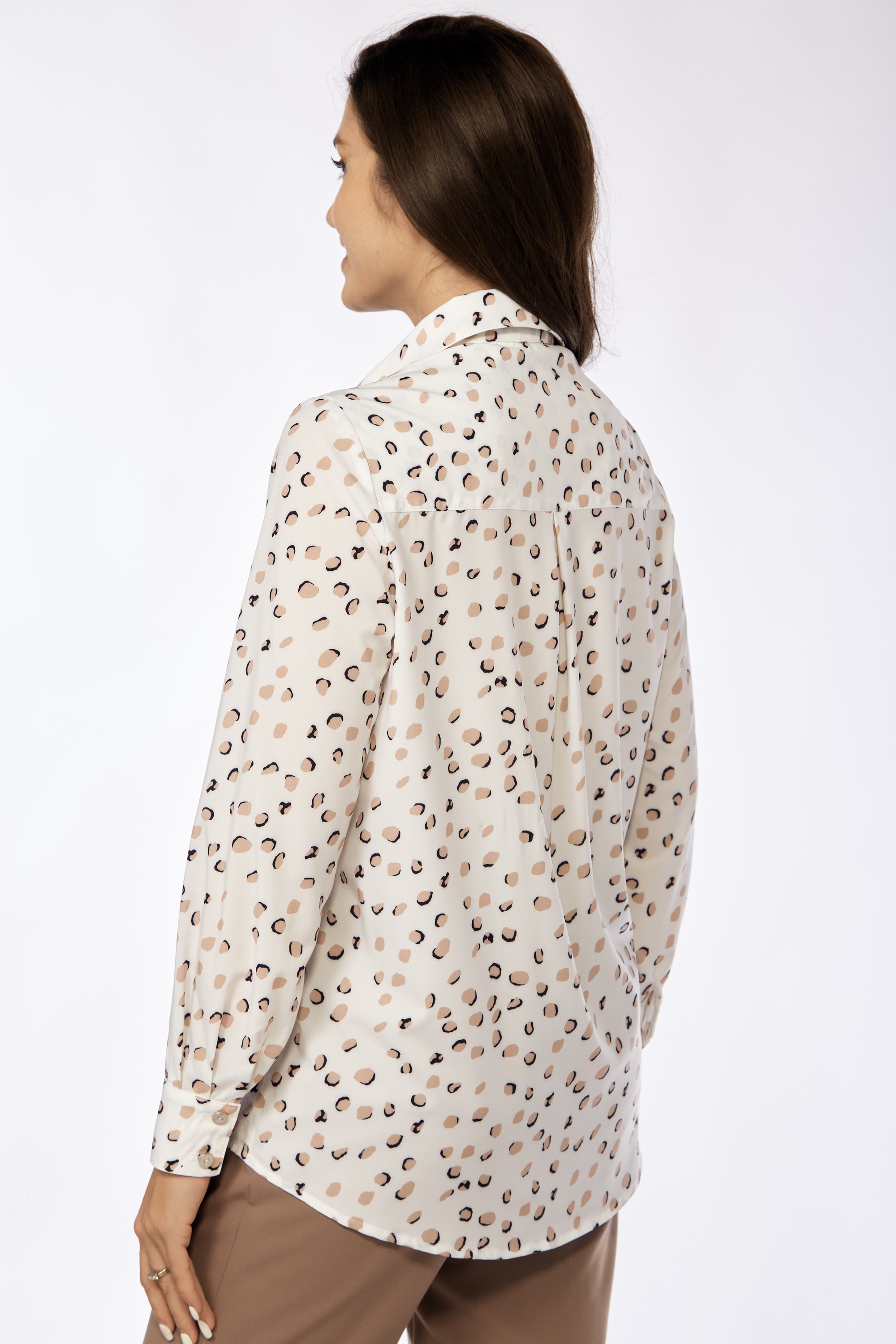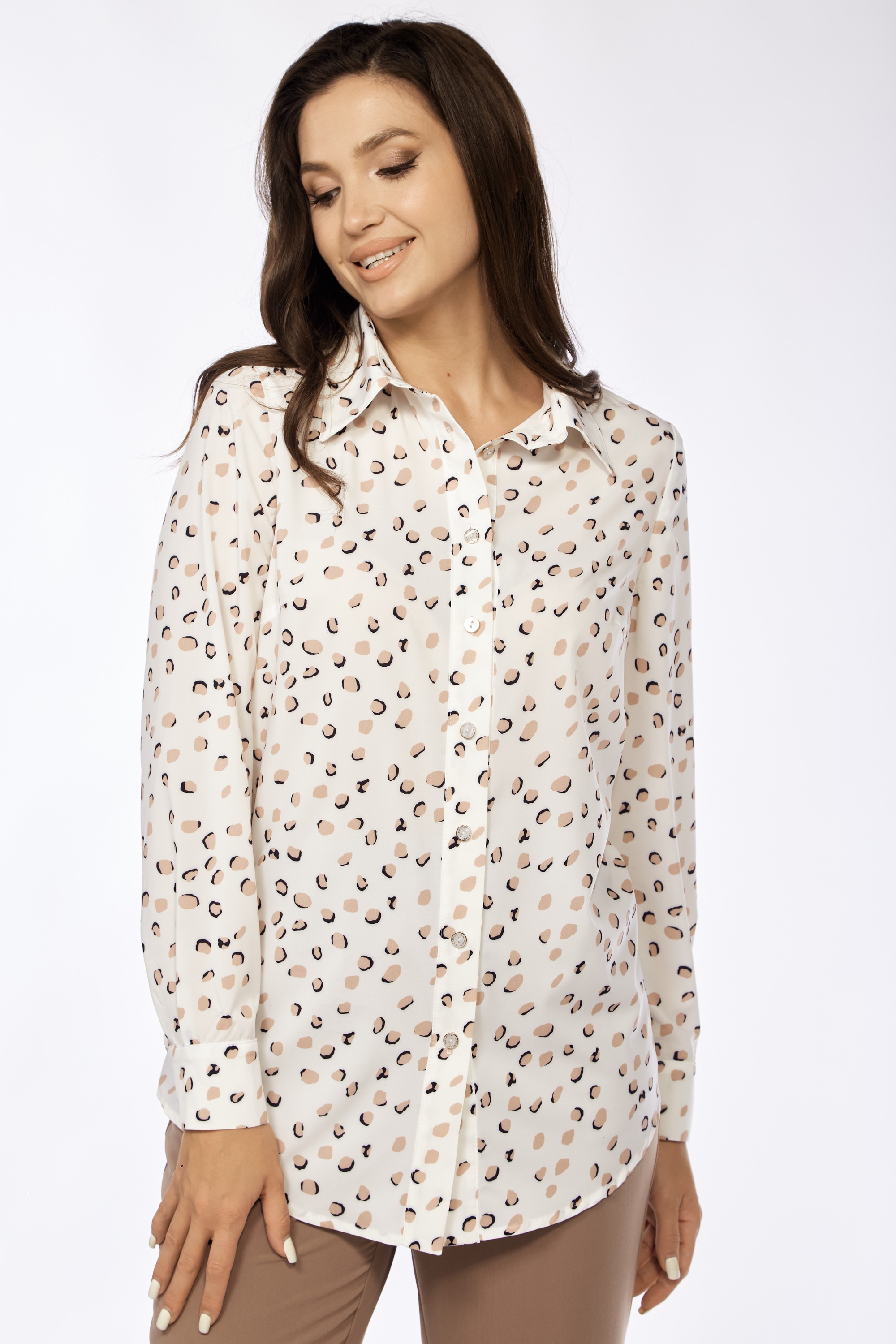 Блузка женская белорусского производителя Фита, прямого силуэта. Мультидизайн. Горловина в классической блузке круглая с отложным воротником на стойке. Застежка у белой блузки в камушки сквозная на петли и пуговицы. Рукав втачной, длинный с манжетом на застежку. Низ рукава оформлен манжетой на петли и пуговицы. Низ изделия фигурный.