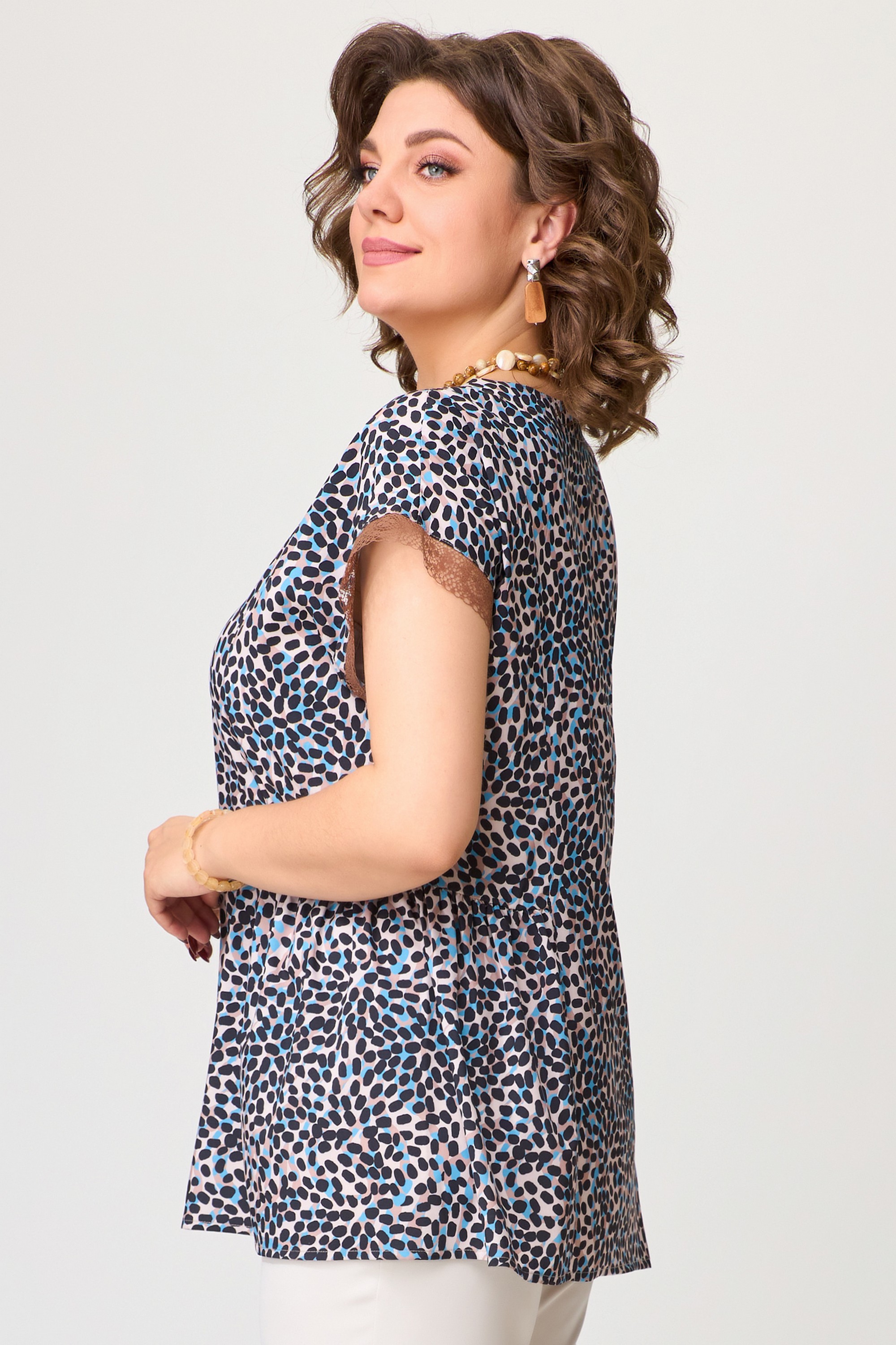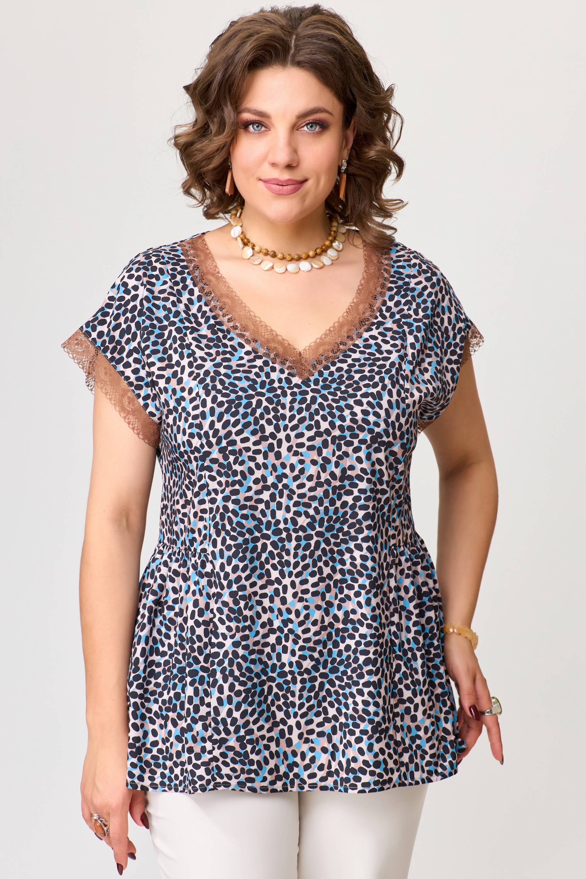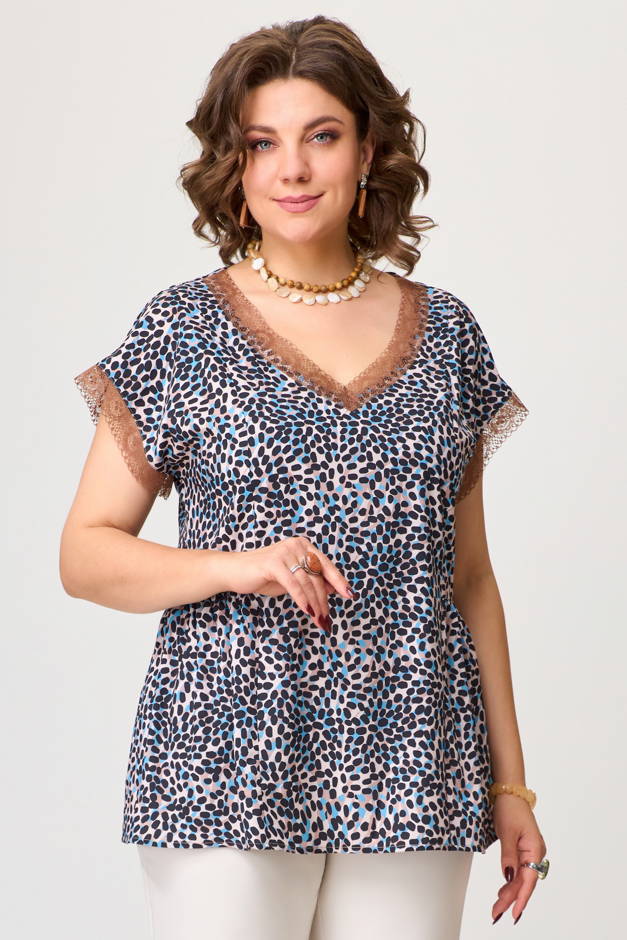 Блузка женская РУЖАНА изготовлена из легкой текстильной ткани (искусственный шелк). Блузка полуприлегающего силуэта со спущенным рукавом, по полочке и спинке рельефы, по талии подрезы со сборкой. По горловине блузки нашито тонкое кружево, низ рукава обработан кружевом. Низ изделия обработан швом в подгибку.