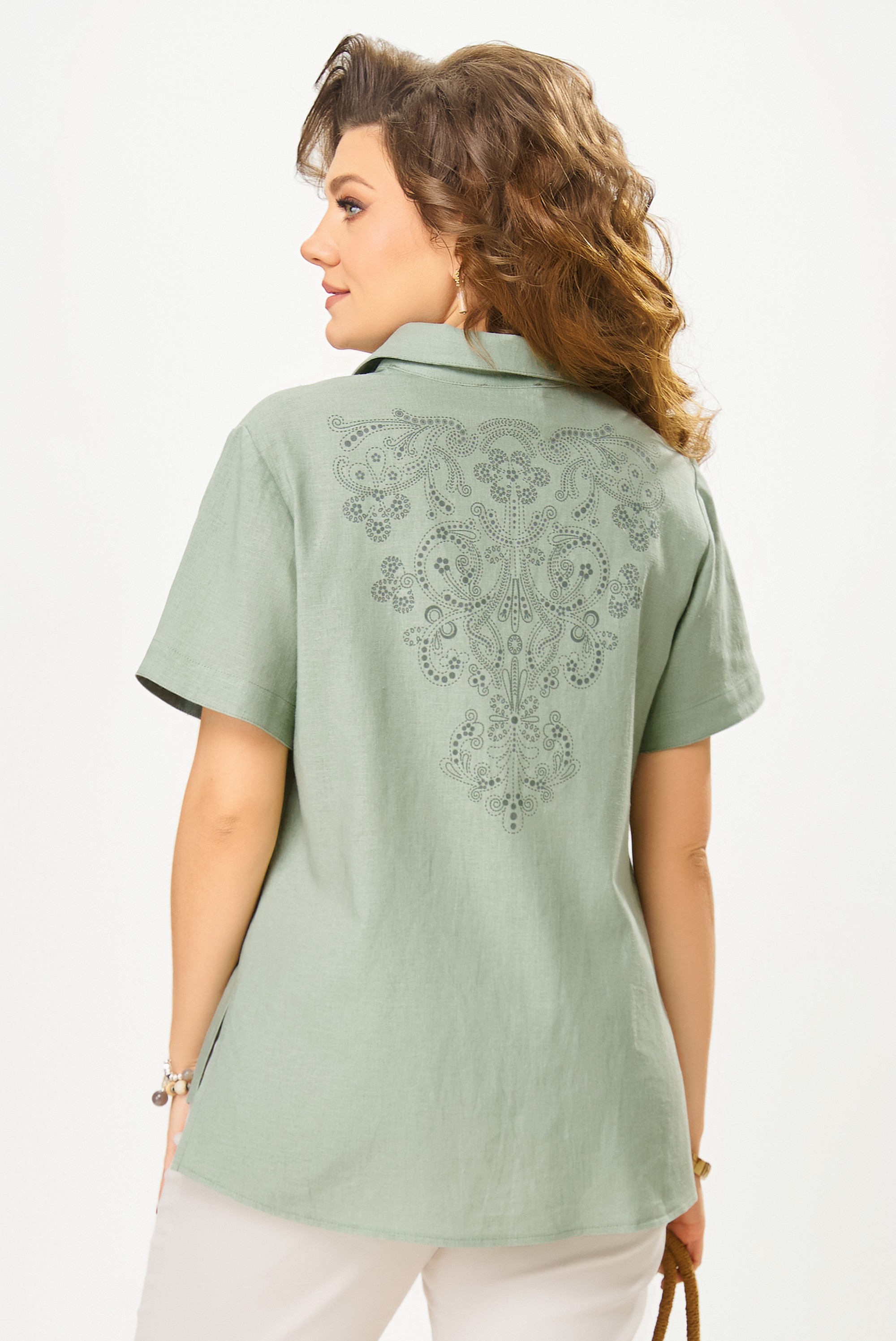 Эта блузка — отличный выбор для создания стильного, но ненавязчивого образа. Она прекрасно сочетается как с классическими брюками, так и с джинсами, что делает ее универсальной для любого случая — от повседневных прогулок до более официальных мероприятий.