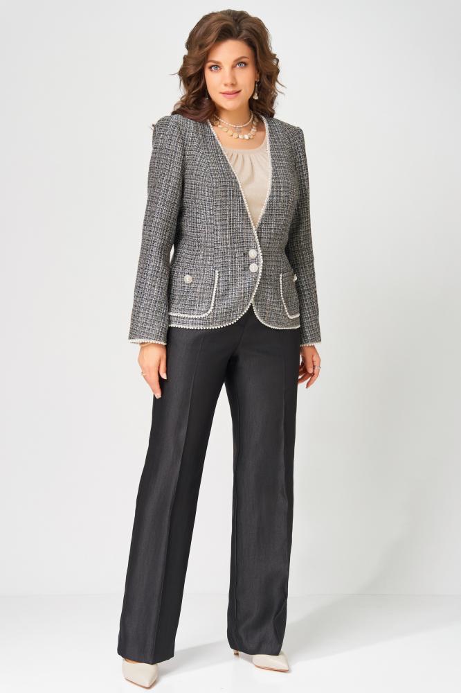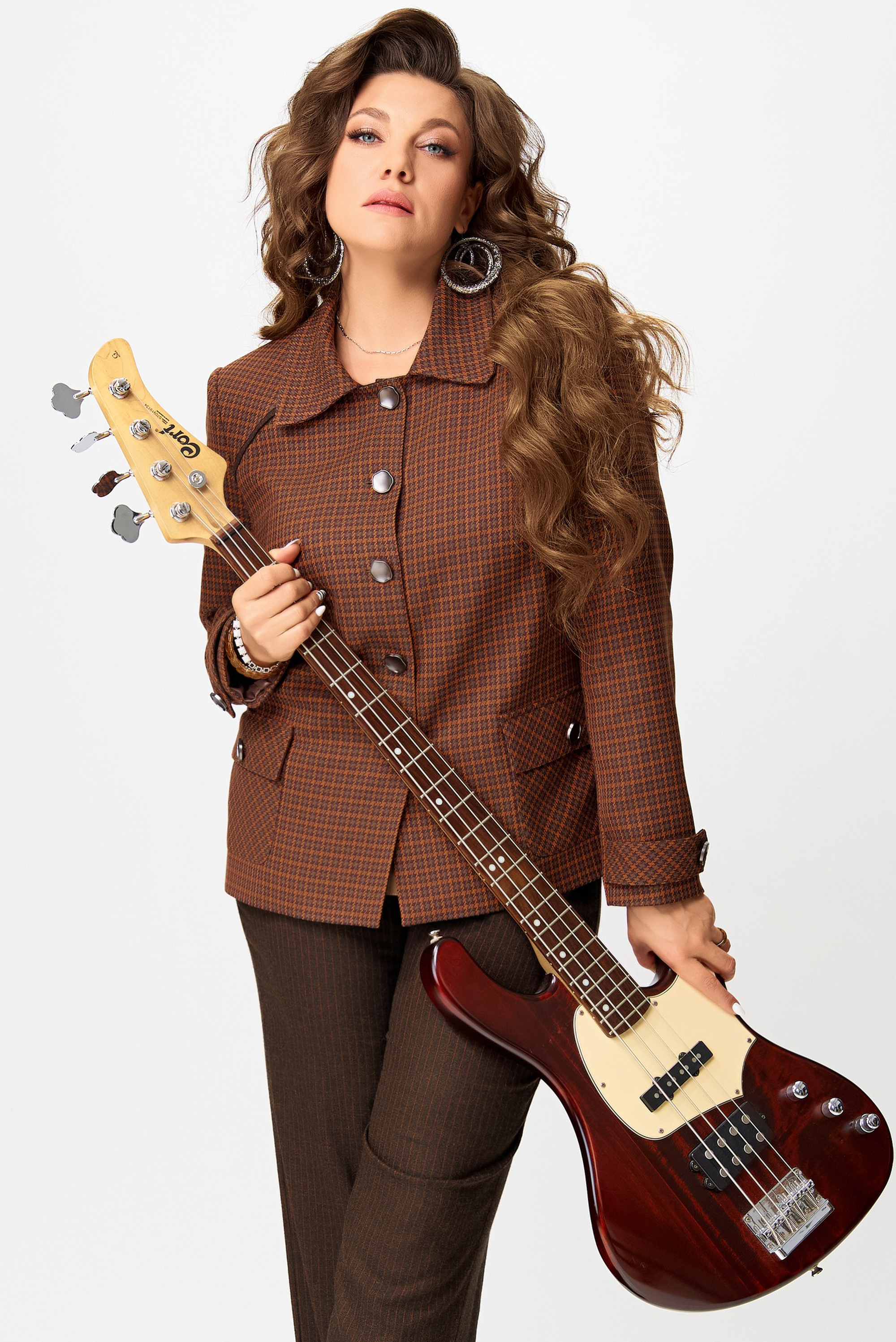 Женский стильный жакет "Венциана" из клетчатого текстиля, полностью на подкладке, с элегантным полуприлегающим силуэтом. Его дизайн отличает однобортная застежка на пуговицы и классический отложной воротник. Передняя часть изделия искусно оформлена нагрудными вытачками и отрезными бочками, а верхняя часть полочки украшена кокеткой с вшитым декоративным кантом. Функциональные накладные карманы с клапанами также застегиваются на пуговицы. Спинка имеет средний шов и отрезную кокетку сверху, также с декоративным кантом. Двухшовные втачные рукава завершаются декоративными патами на пуговицах.