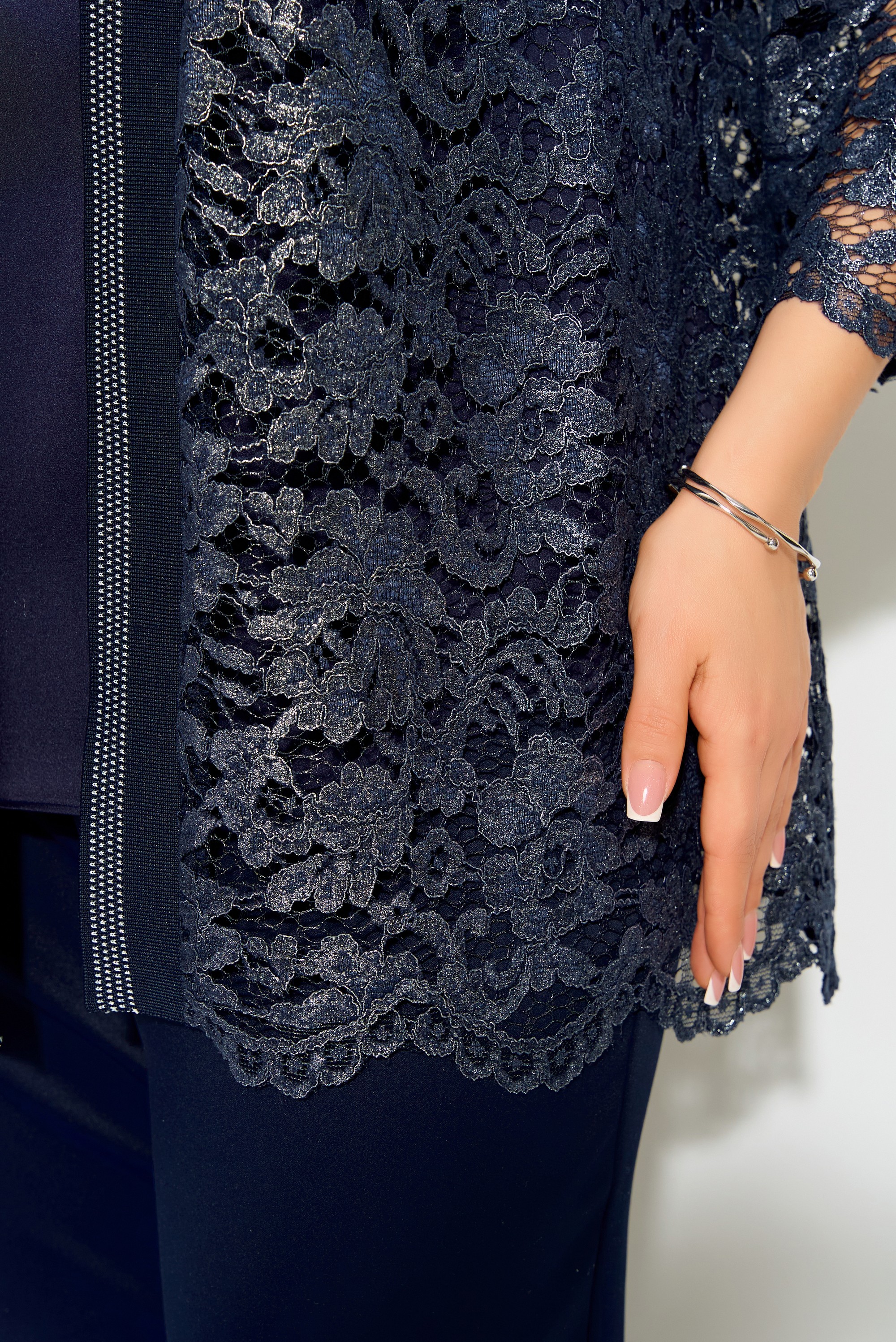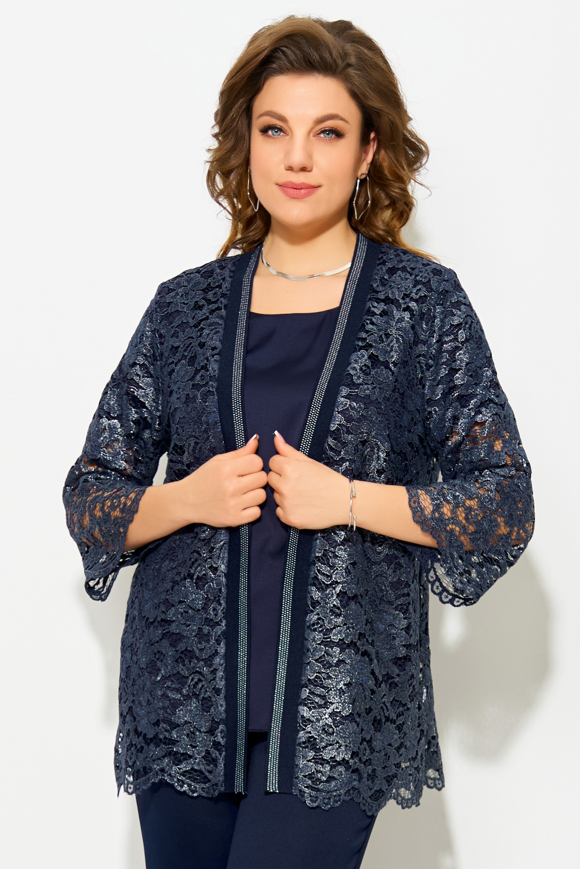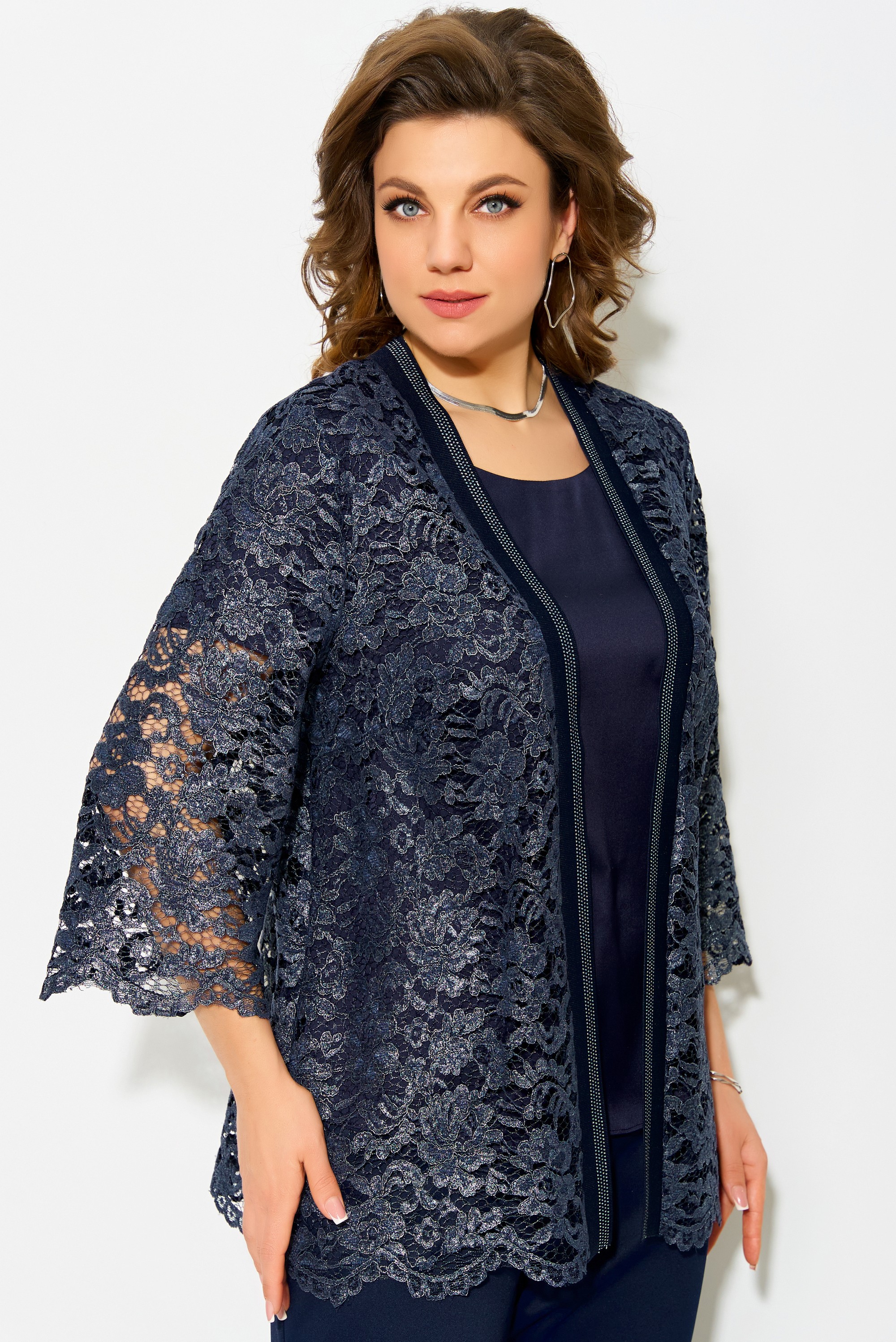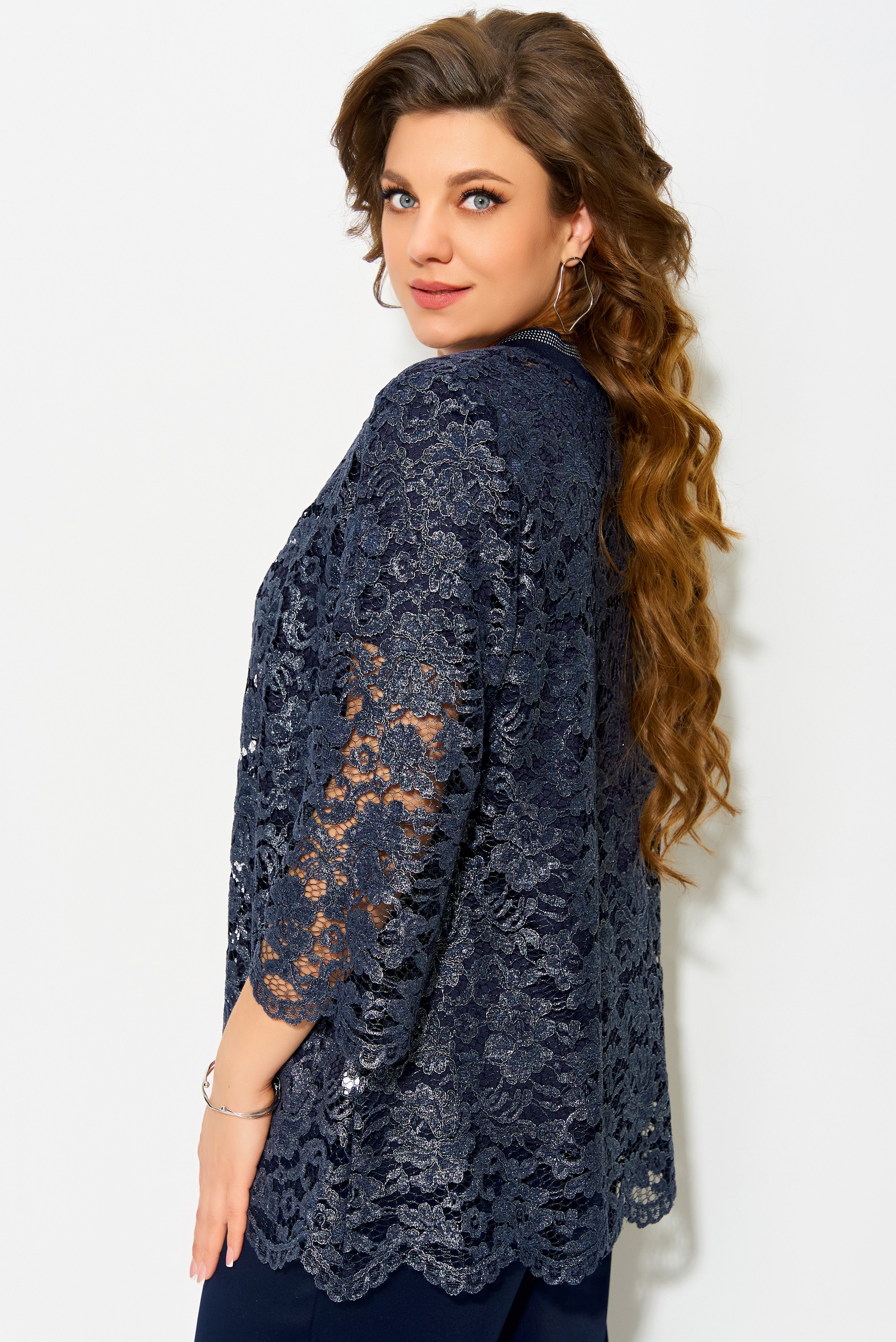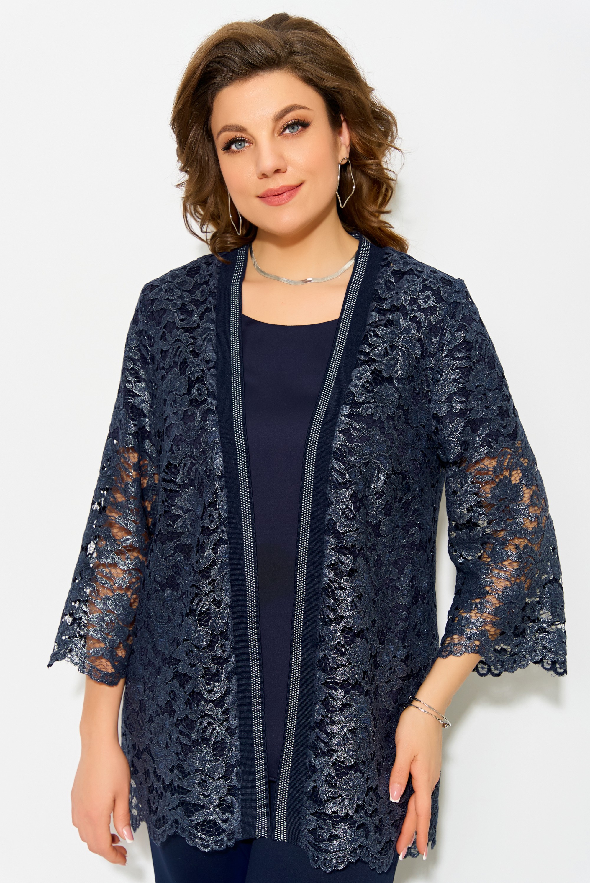 Кардиган "Вивея" выполнен из кружевной ткани прямого силуэта, без застёжки, край борта обработан довязом. Богатая и модная ткань, с легким переливом, придает изящности и модности. По груди кардигана выточка. По низу изделия и рукава - фистоны.