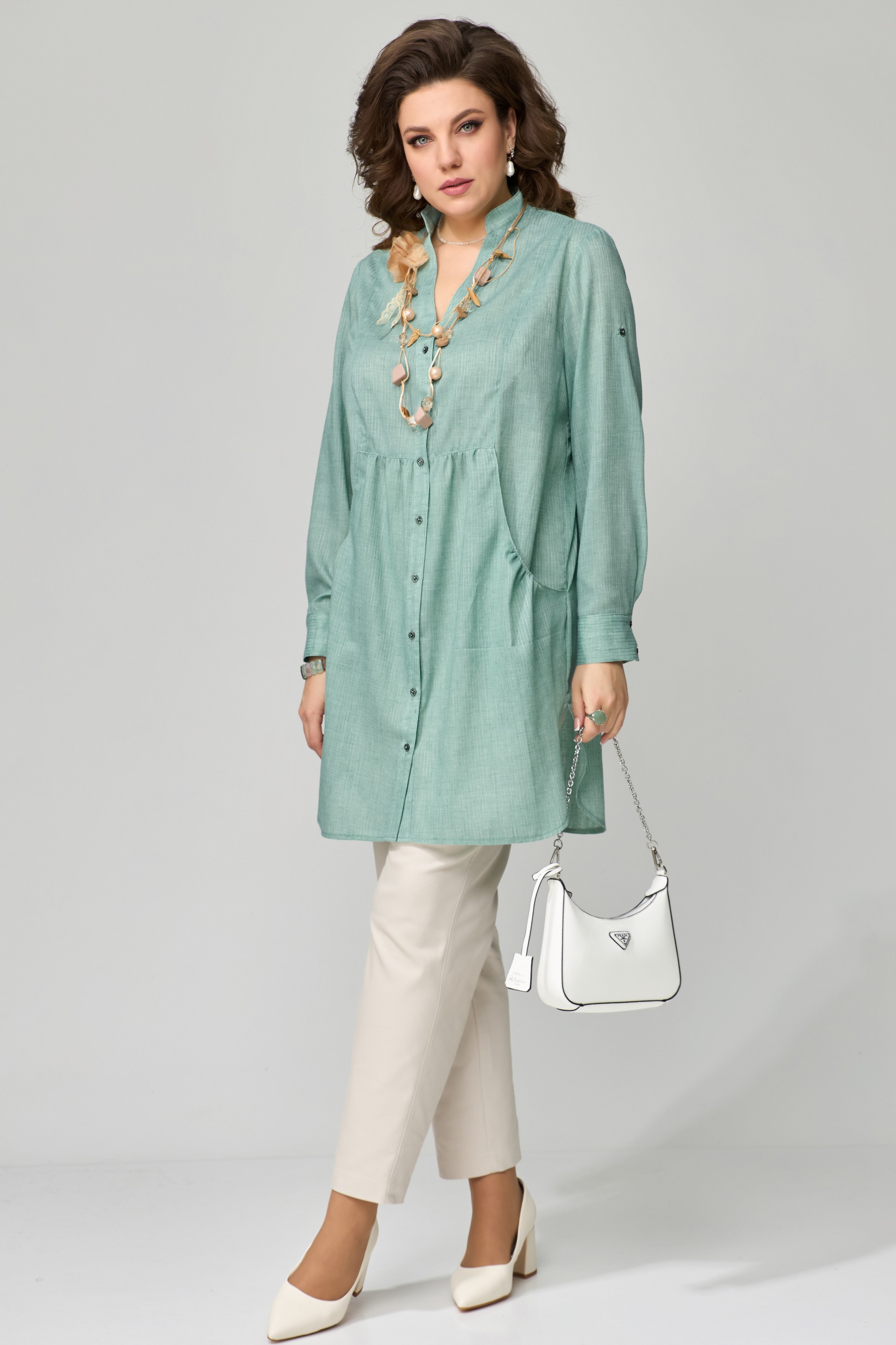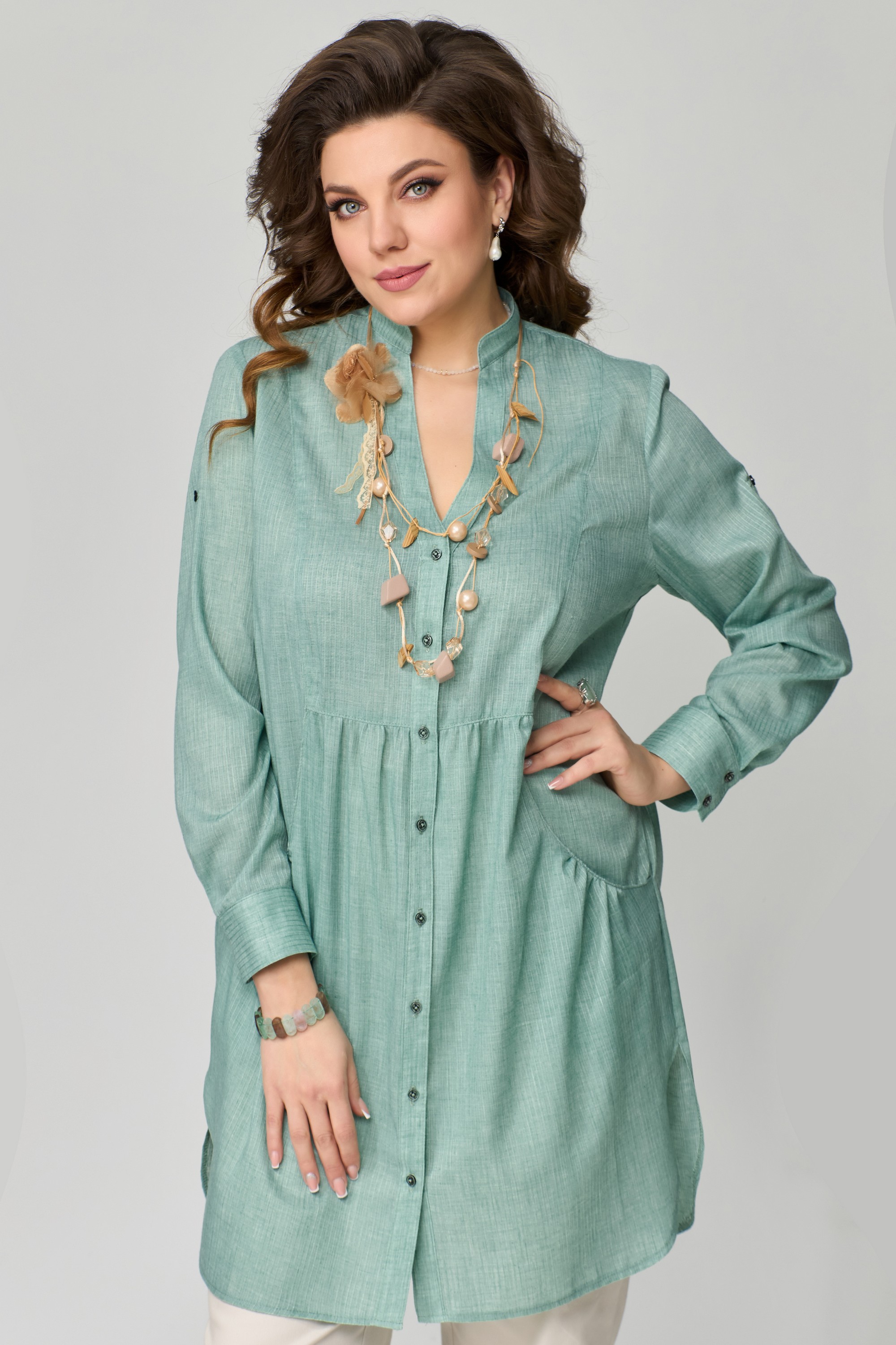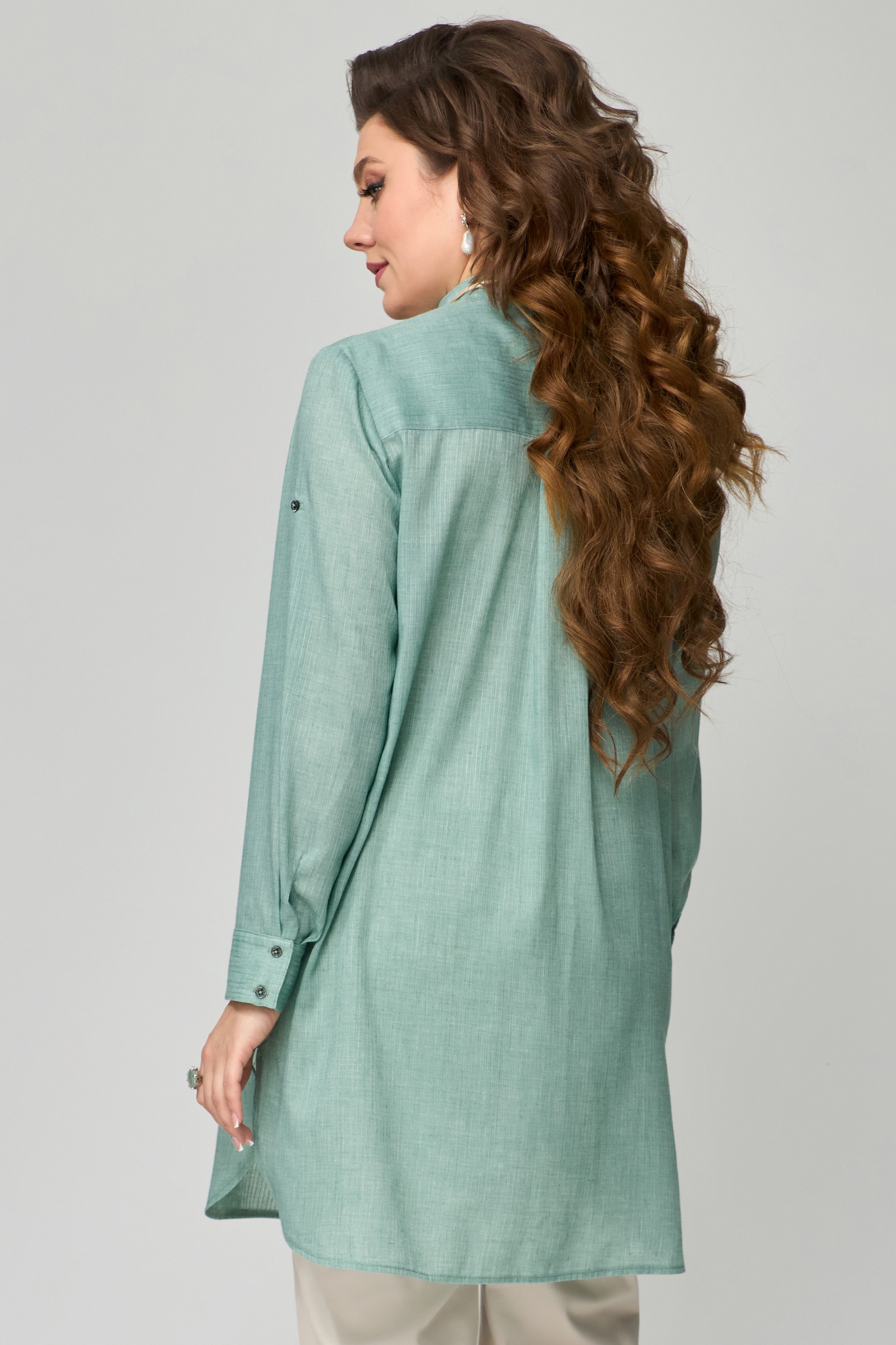 ТУНИКА "Медея". Туника женская, прямого силуэта. Выполнена из хлопковой ткани. Рукав втачной, длинный, по низу притачная манжета с застежкой на пуговицы. Длина рукава регулируется патой. Фигурный вырез горловины, оформленный отрезными планками. Застежка на пуговицах. Воротник стойка. По переду выполнены фигурные карманы с небольшой сборкой по верхнему краю. По линии талии подрез с небольшой сборкой. На спине изделия прямая кокетка, посередине бактовая складка. Низ изделия фигурный, по боковым швам выполнены разрезы.