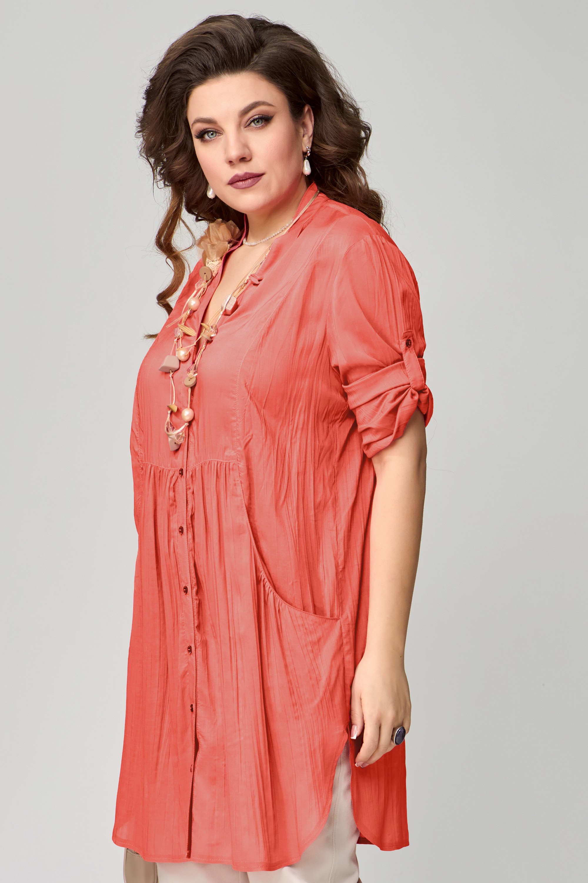 ТУНИКА "Медея". Туника женская, прямого силуэта. Выполнена из хлопковой ткани. Рукав втачной, длинный, по низу притачная манжета с застежкой на пуговицы. Длина рукава регулируется патой. Фигурный вырез горловины, оформленный отрезными планками. Застежка на пуговицах. Воротник стойка. По переду выполнены фигурные карманы с небольшой сборкой по верхнему краю. По линии талии подрез с небольшой сборкой. На спине изделия прямая кокетка, посередине бактовая складка. Низ изделия фигурный, по боковым швам выполнены разрезы.
