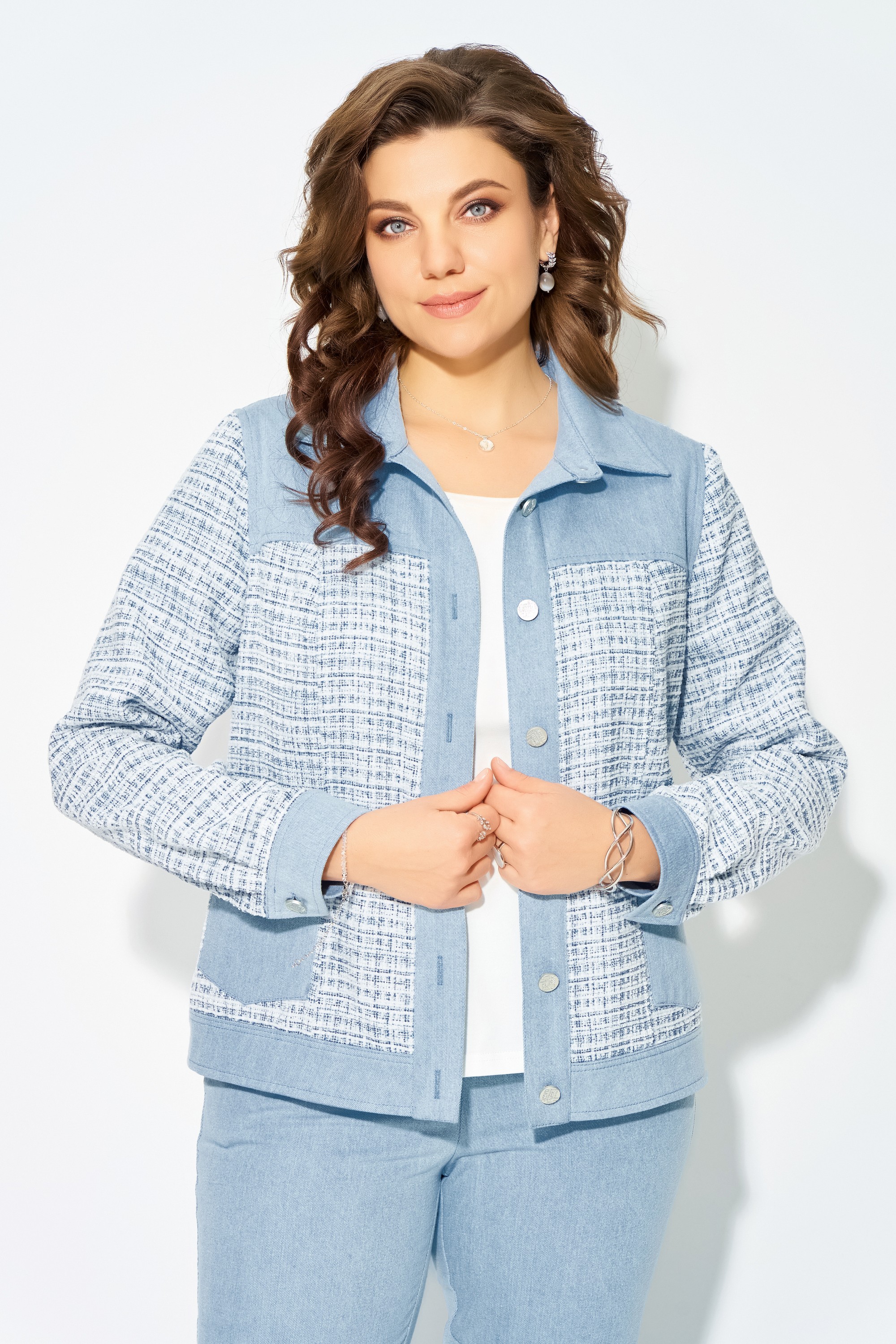 Бомбер полуприлегающего кроя изготовлен из сочетания хлопковой джинсовой и твидовой тканей, без подкладки. Его однобортная застежка выполнена на петли и пуговицы, а планка борта отделана декоративными строчками. На передней части изделия расположены кокетка и рельефные швы, а также накладные карманы с клапанами, закрывающиеся на петли с пуговицами. Сзади также присутствует кокетка и рельефы. Рукава имеют втачной двухшовный покрой и оснащены манжетами с застежкой на пуговицы и петли. Воротник рубашечного типа с отложной стойкой, низ бомбера дополнен отрезным поясом с декоративной прострочкой. На кокетке переда, с левой стороны, расположена стильная нашивка.
