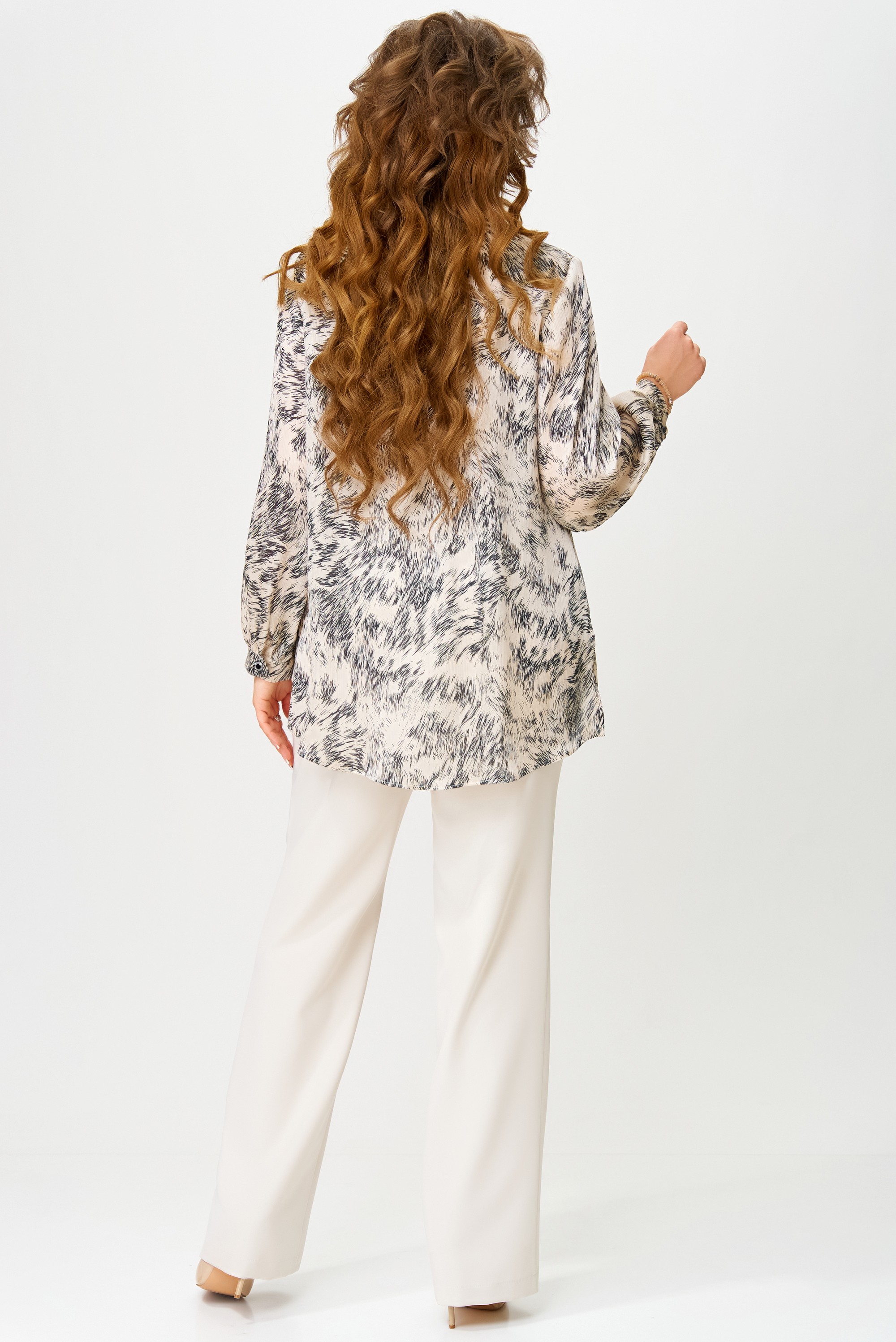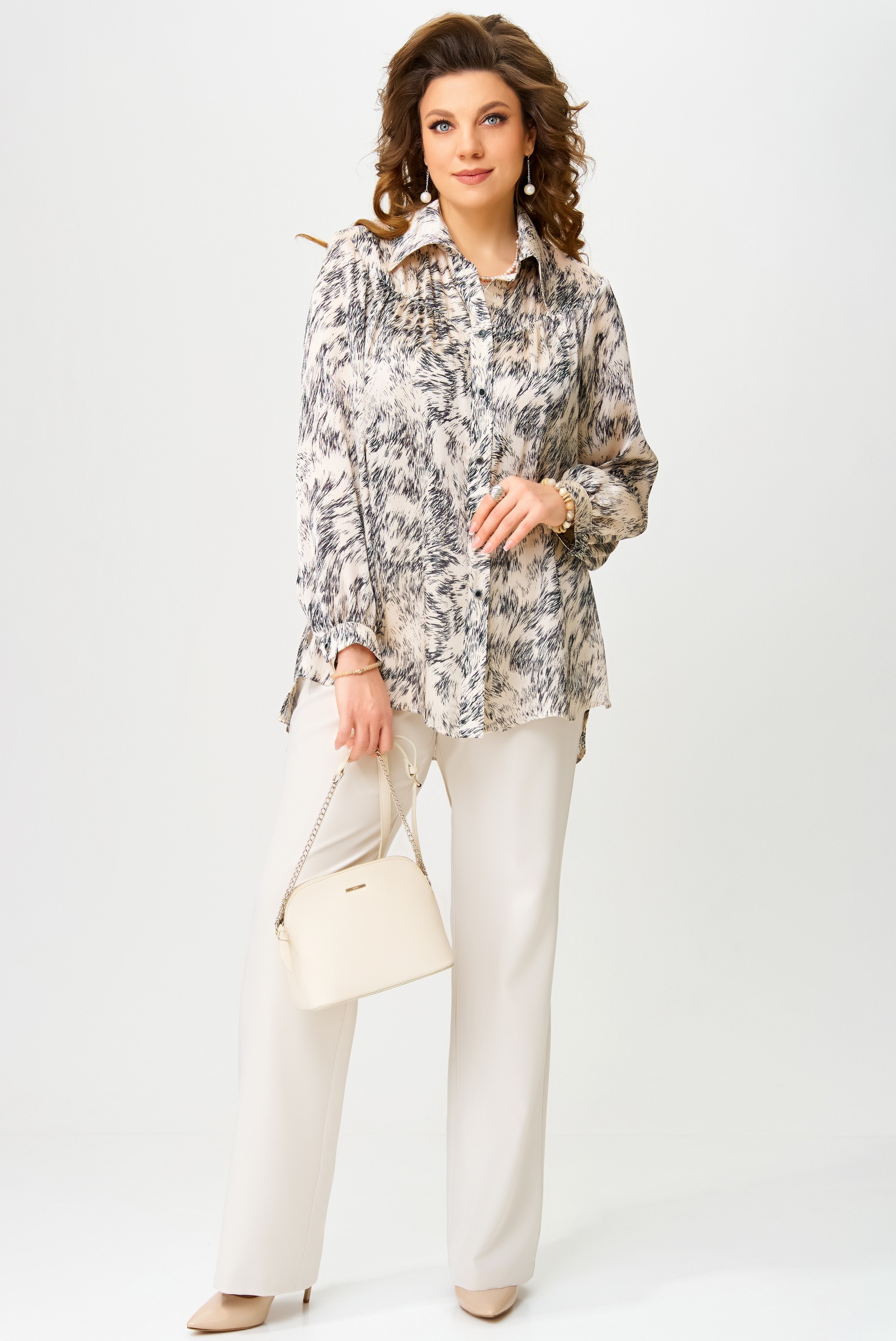 Женская блузка "Хариса" выполнена из текстильной ткани. Блузка прямого силуэта. Воротник отложной рубашечного типа на стойке, застежка на петли и пуговицы, планка отрезная. По спинке блузки кокетка, рукав в блузке втачной, по низку рукава манжет с застежкой на петлю и пуговицы. По полочке сборка и отрезная кокетка. Низ изделия обработан швом в подгибку с открытым срезом. В боковых швах блузки - разрезы.