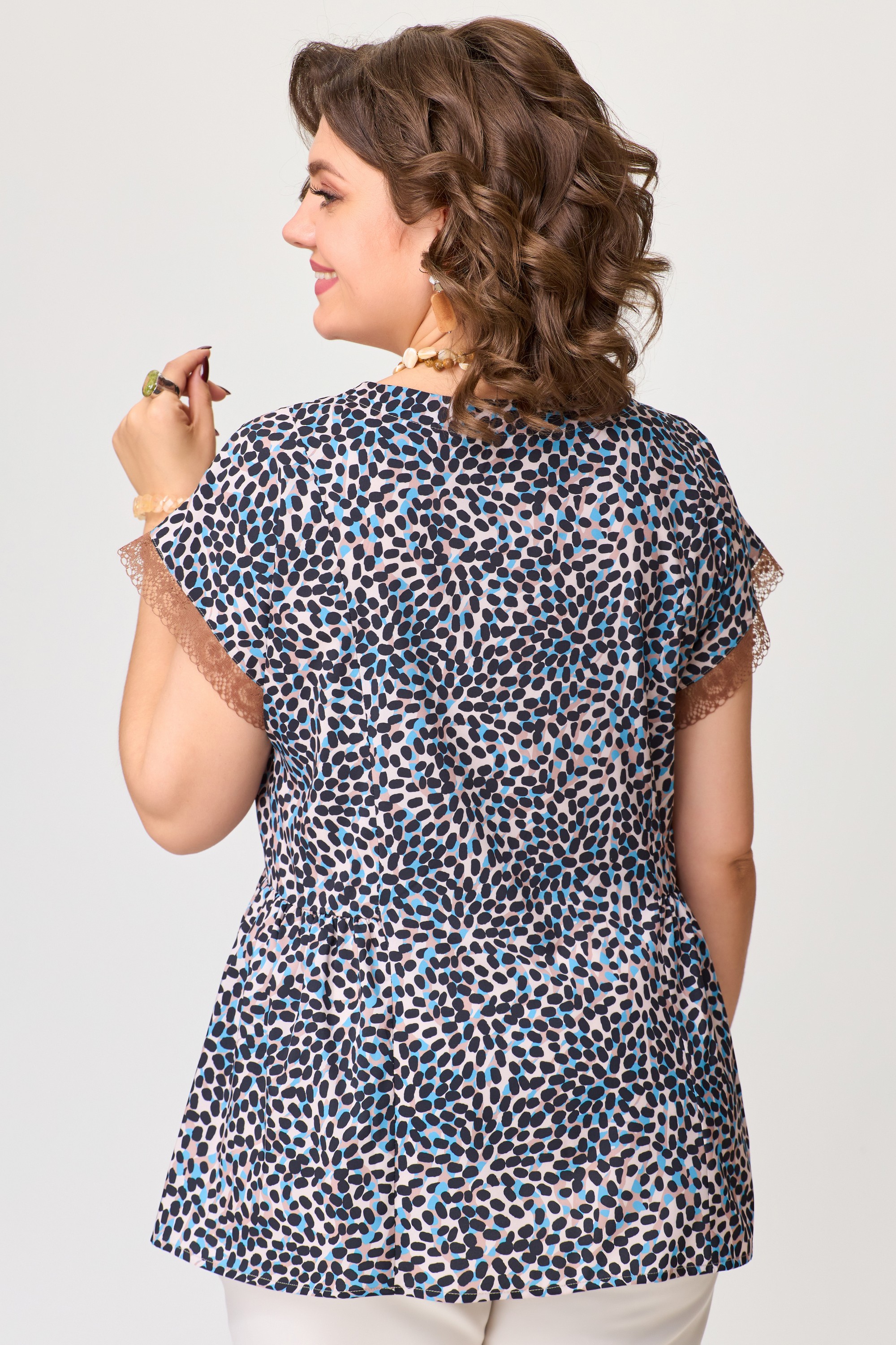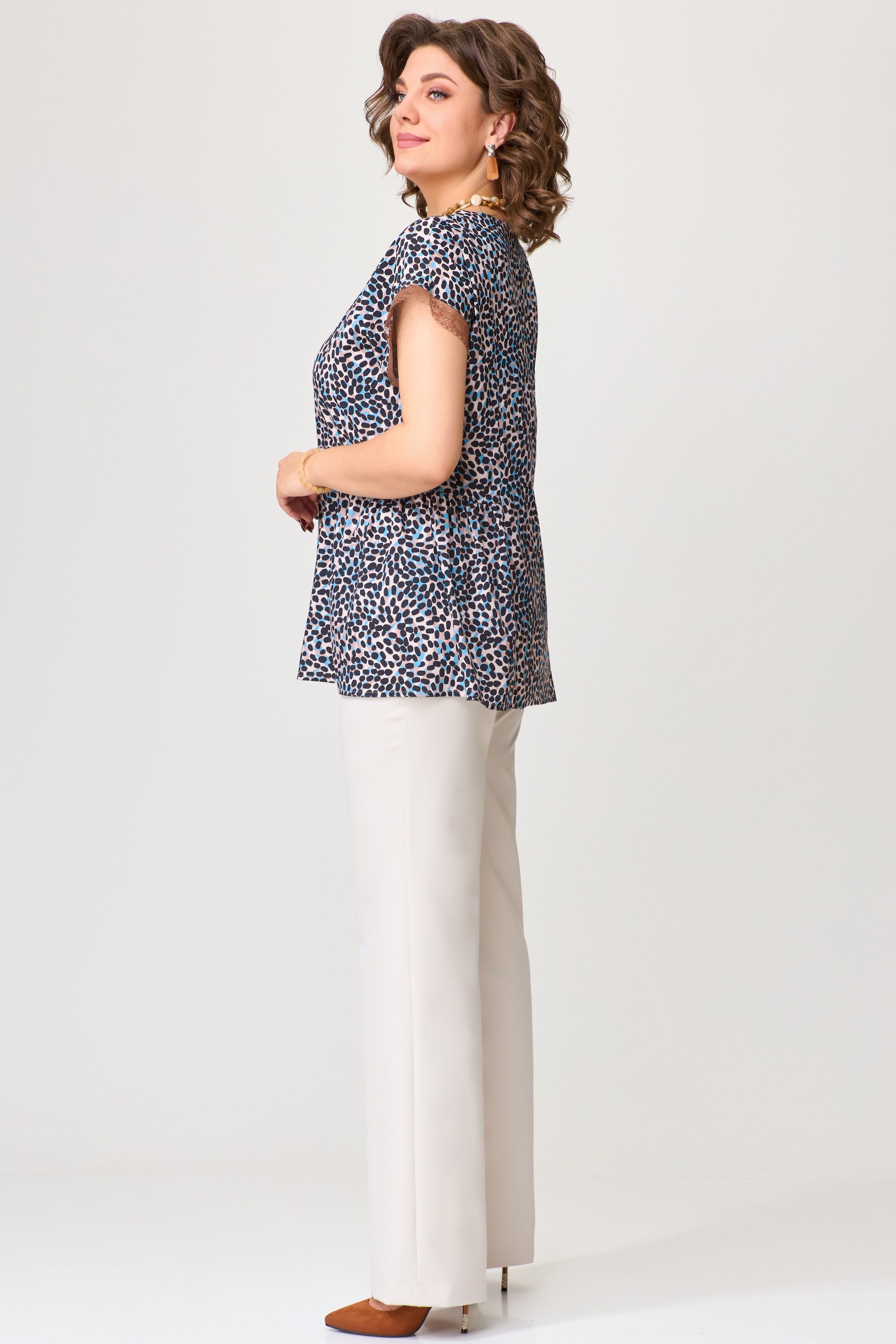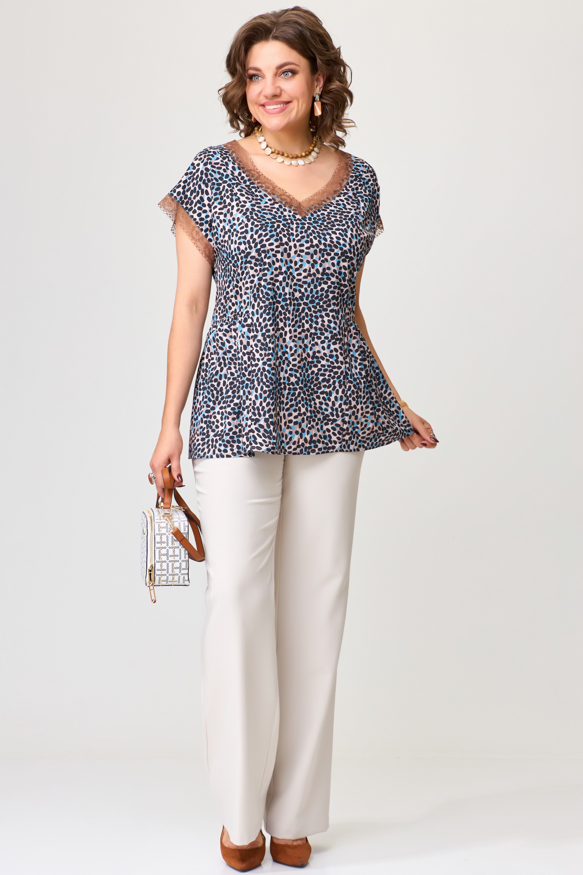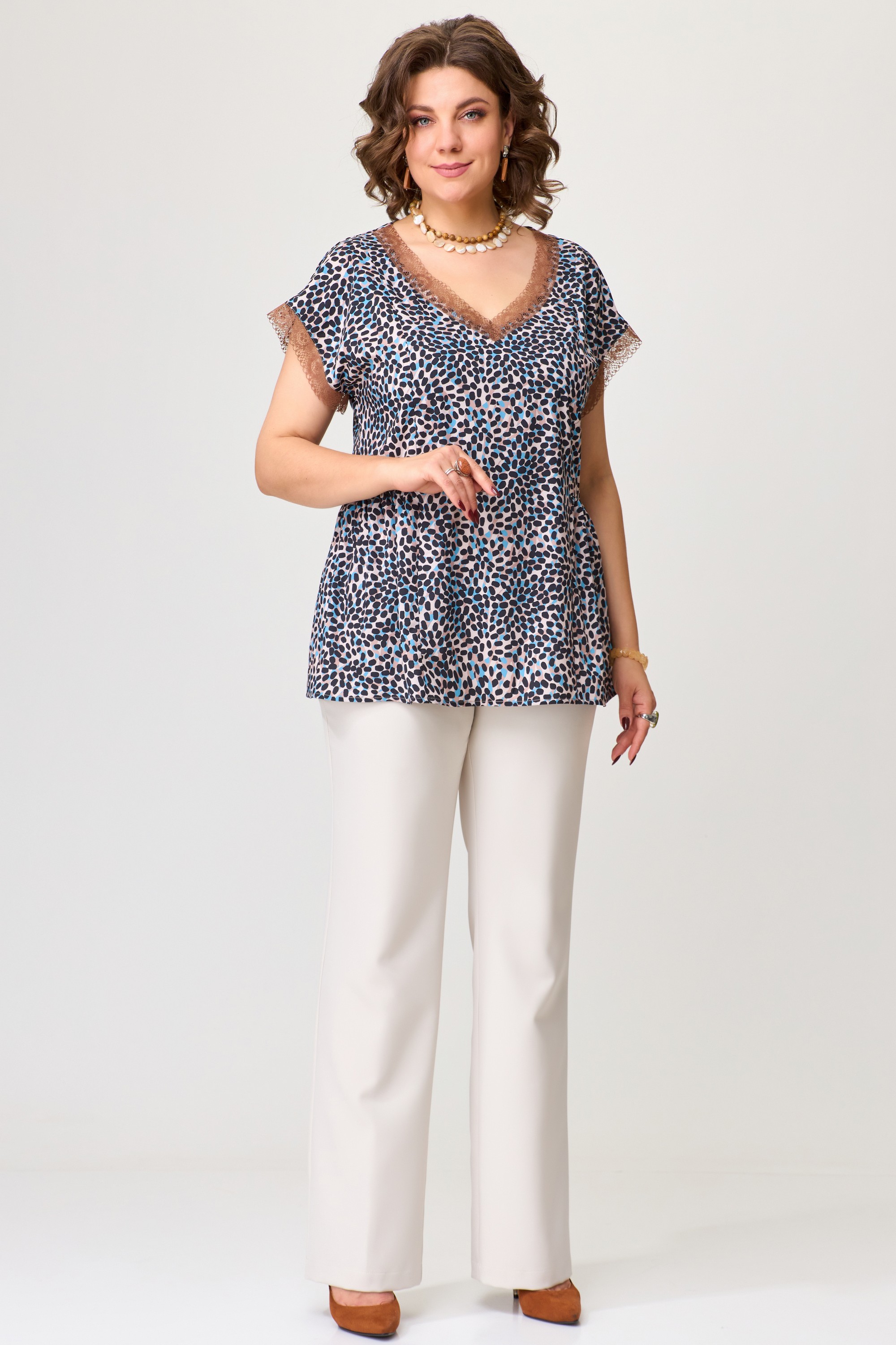 Женский комплект двойка РУЖАНА состоит из блузки и брюк. Блуза изготовлена из легкой текстильной ткани (искусственный шелк). Блузка полуприлегающего силуэта со спущенным рукавом, по полочке и спинке рельефы, по талии подрезы со сборкой. По горловине блузки нашито тонкое кружево, низ рукава обработан кружевом. Низ изделия обработан швом в подгибку. Брюки прямого силуэта с застежкой на молнию и пуговицу. По переду брюк карманы, верх брюк обработан поясом, по спинке резинка. Низ обработан в подгибку.