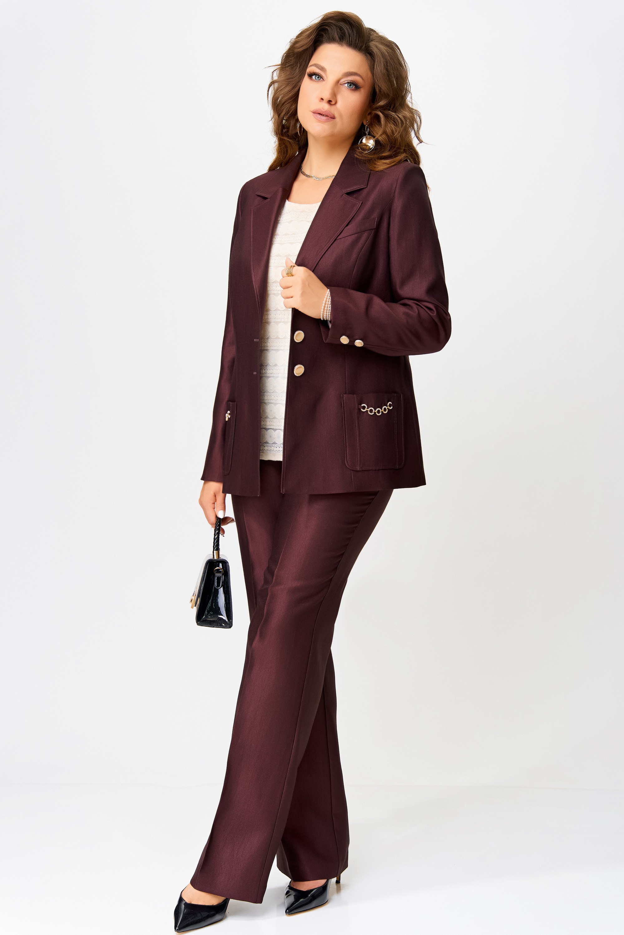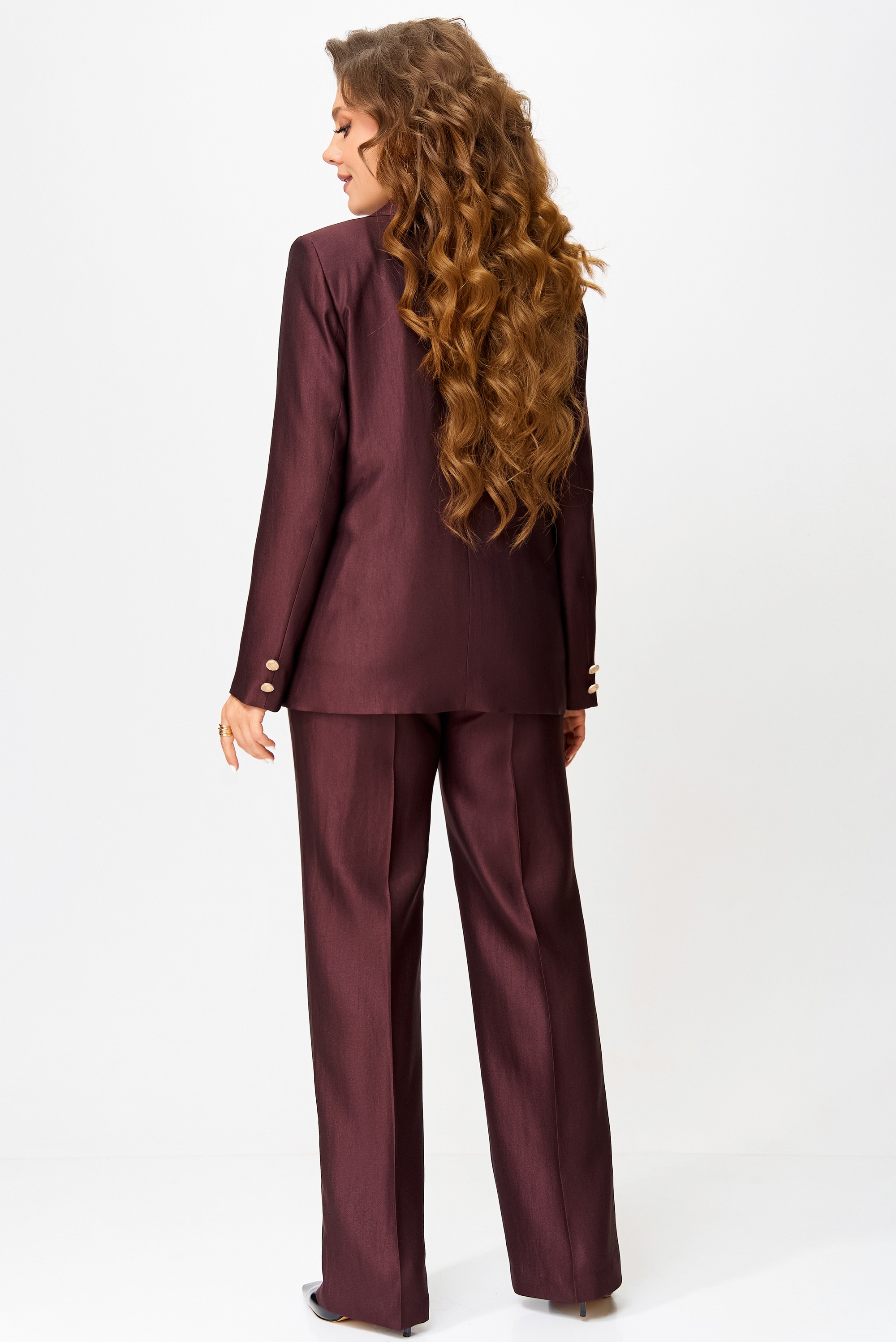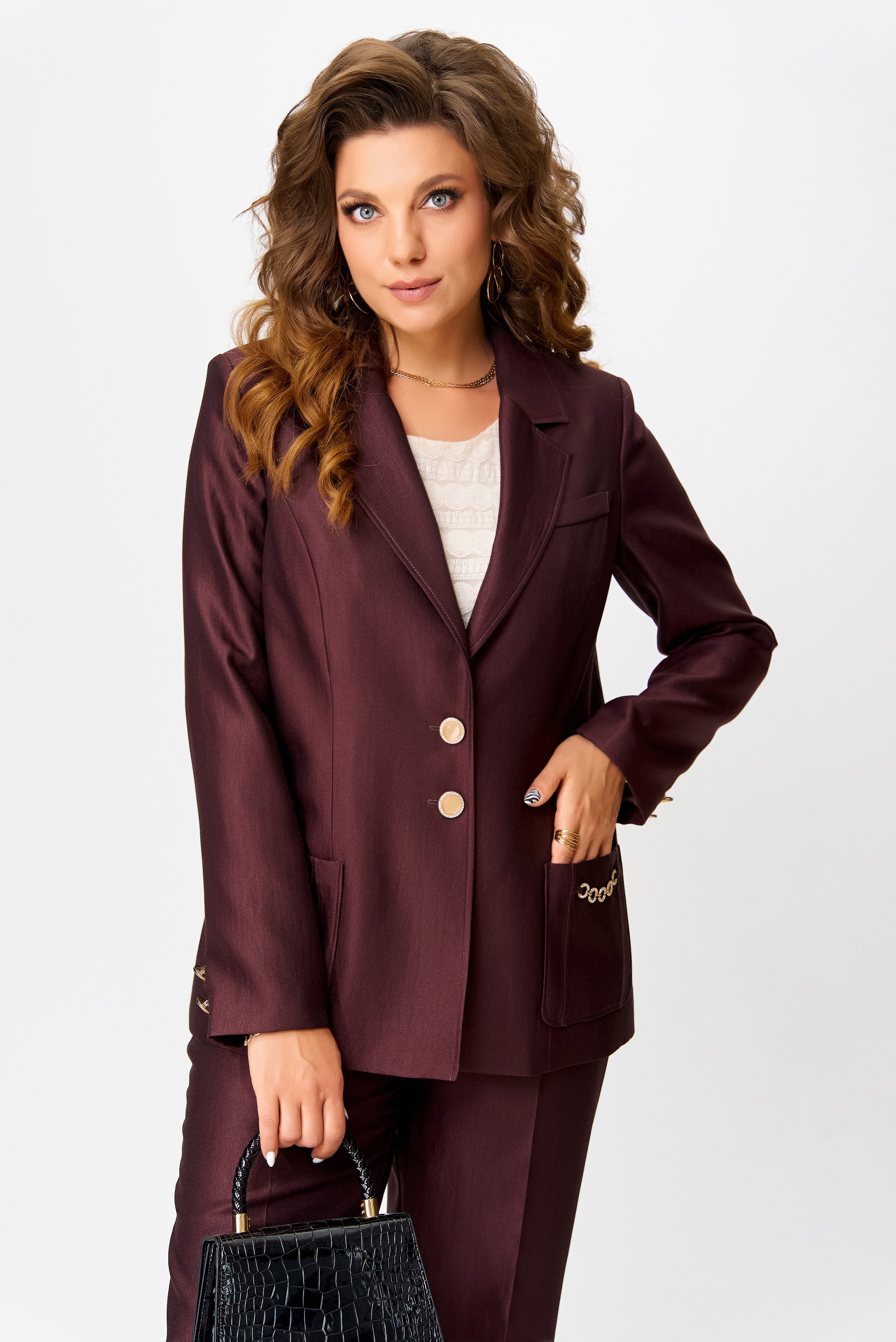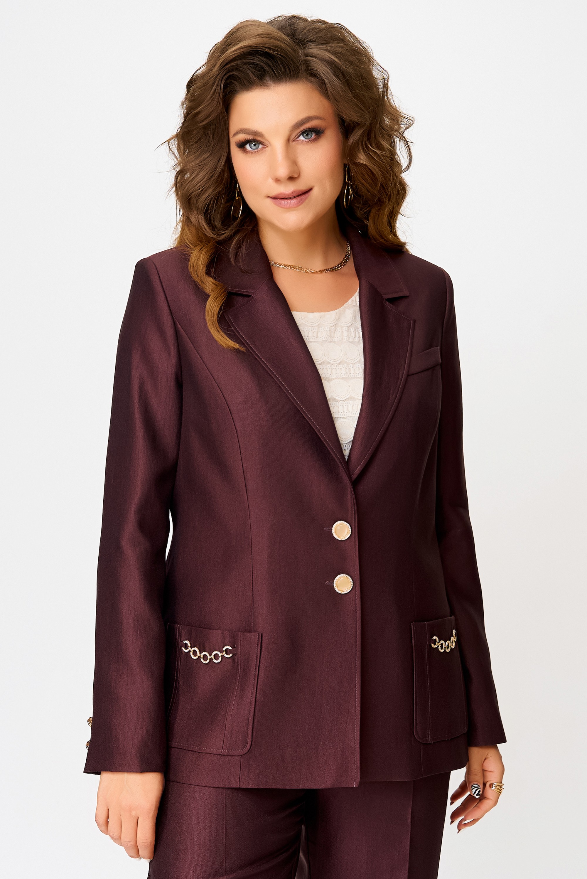 Полуприлегающий силуэт жакета на подкладке словно создан для того, чтобы подчеркнуть достоинство осанки и лёгкость движения. Ткань "Лумина" с вискозой в составе играет на свету мягким благородным блеском, словно отражая внутренний свет своей обладательницы. Однобортная застёжка на петли и пуговицы — классика, которая не нуждается в объяснениях. Воротник и лацканы пиджачного типа придают образу деликатную строгость, а рельефы на полочке и накладные карманы с декоративной цепочкой — изысканную игру фактур. Карман-обманка на левой полочке — как лёгкий намёк на тайну, а две декоративные пуговицы на рукавах — как изящные акценты, завершённые с ювелирной точностью. Средний шов по спинке — линия, соединяющая форму и содержание.