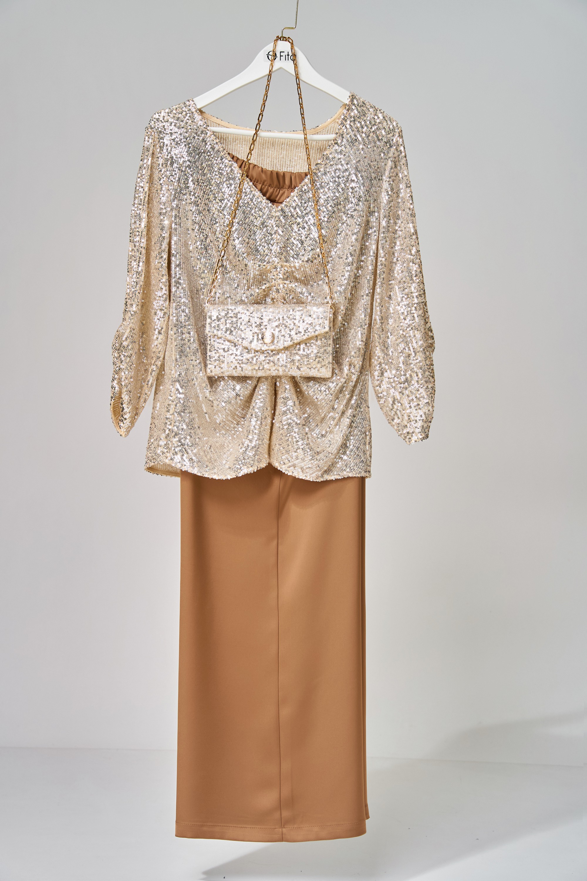 "Зария" — сияющий образ для особенных вечеров. Блузка, расшитая пайетками, ловит свет и восхищённые взгляды, а сатиновые брюки добавляют элегантности и свободы движения. Идеальный выбор для новогодней ночи, корпоративов и торжеств, где хочется блистать.