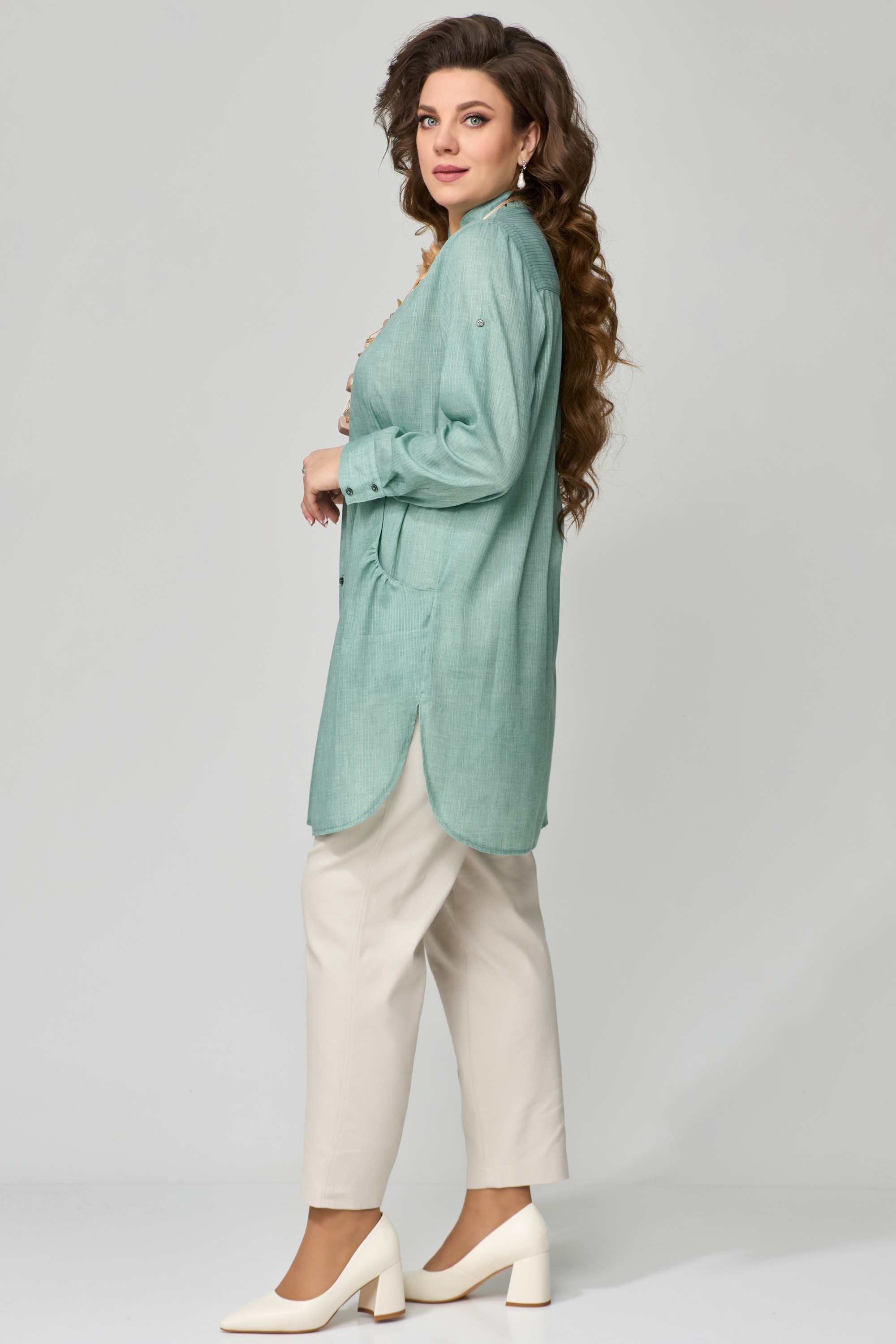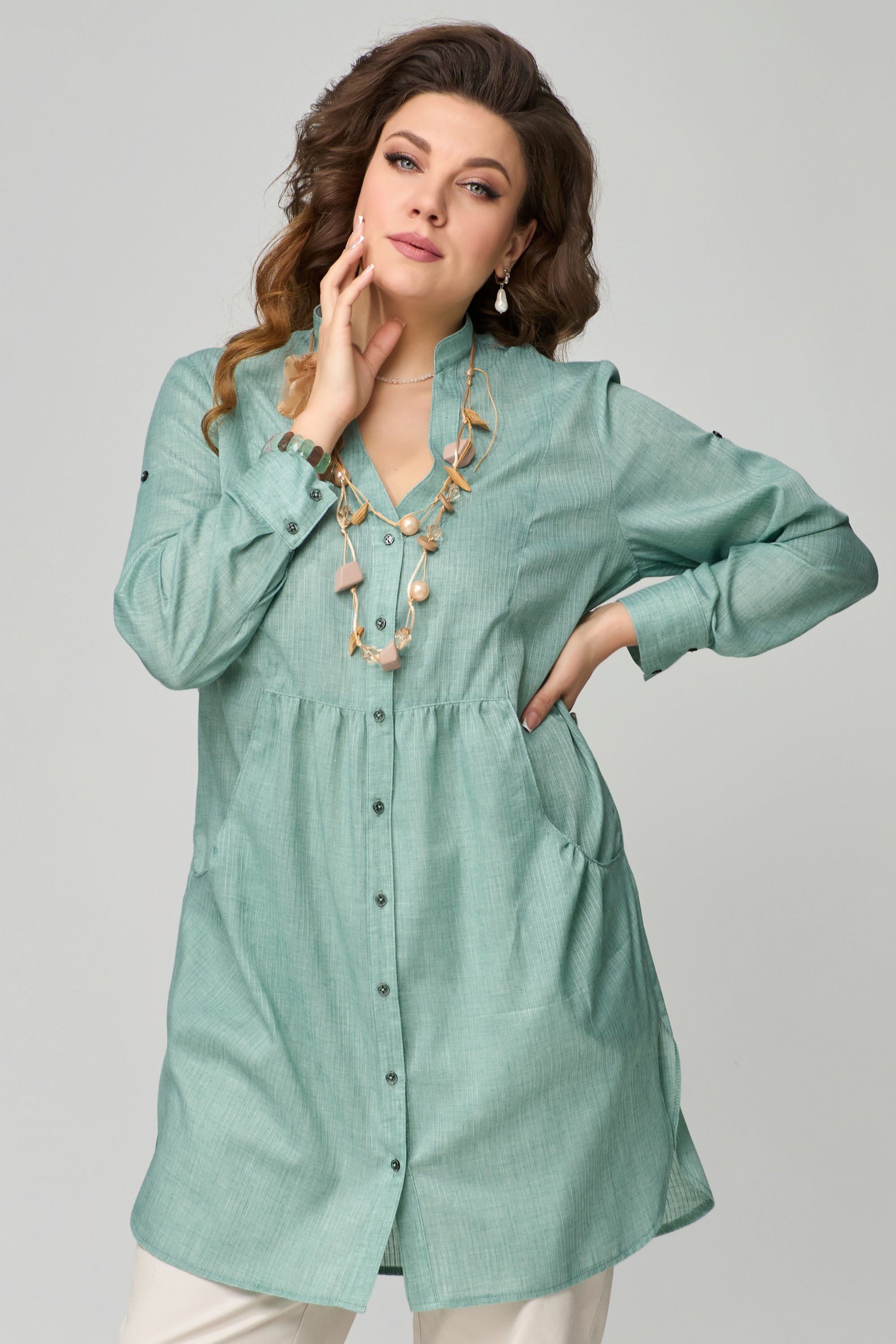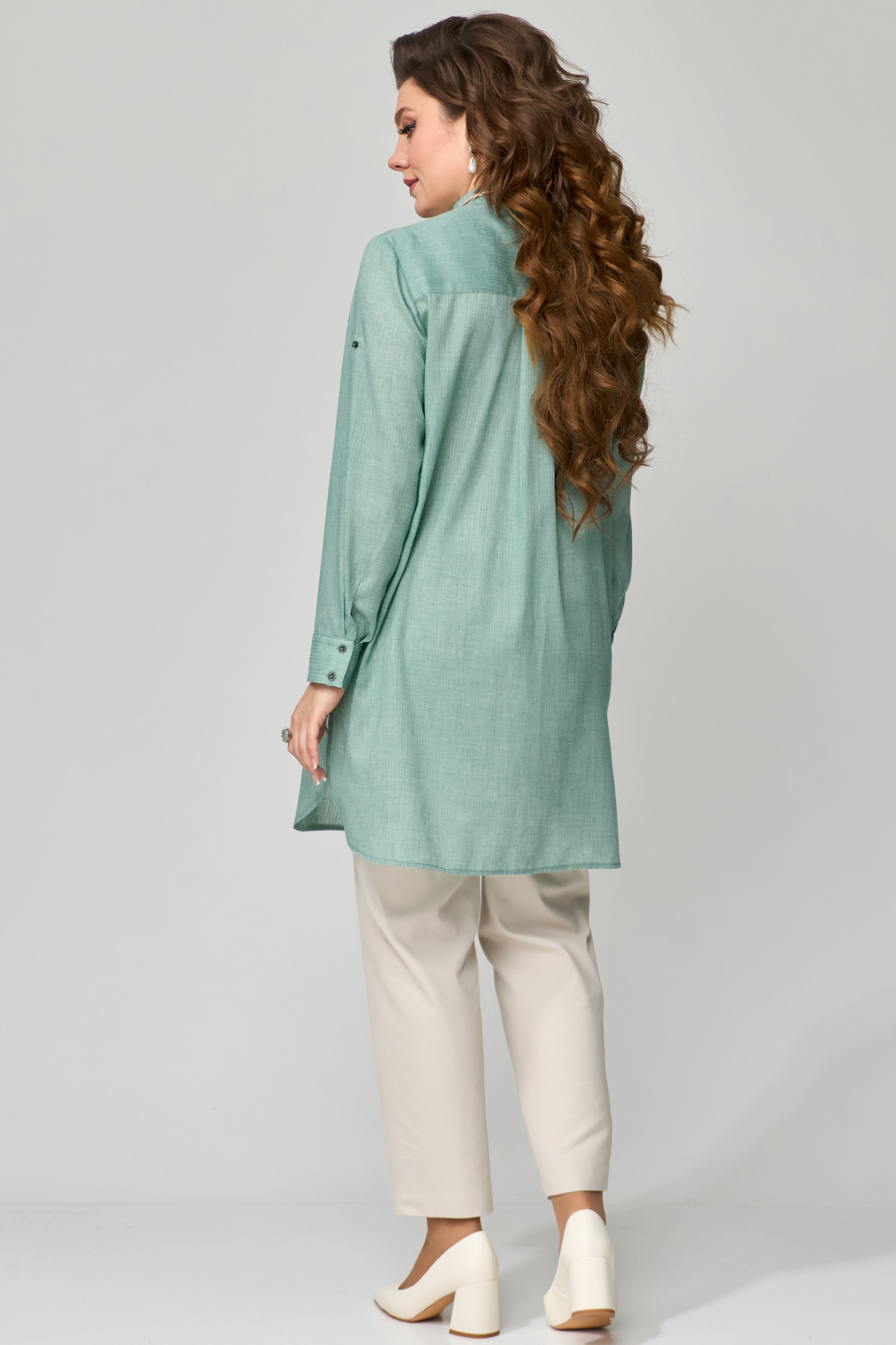 КОМПЛЕКТ ДВОЙКА "Медея". Туника женская, прямого силуэта. Выполнена из хлопковой ткани. Рукав втачной, длинный, по низу притачная манжета с застежкой на пуговицы. Длина рукава регулируется патой. Фигурный вырез горловины, оформленный отрезными планками. Застежка на пуговицах. Воротник стойка. По переду выполнены фигурные карманы с небольшой сборкой по верхнему краю. По линии талии подрез с небольшой сборкой. На спине изделия прямая кокетка, посередине бактовая складка. Низ изделия фигурный, по боковым швам выполнены разрезы. Джинсы - брюки, зауженные к низу, с застежкой на молнию и пуговицы, в боковом шве - карман, по спинке пояса - резинка. Брюки со стандартной посадкой (средней).