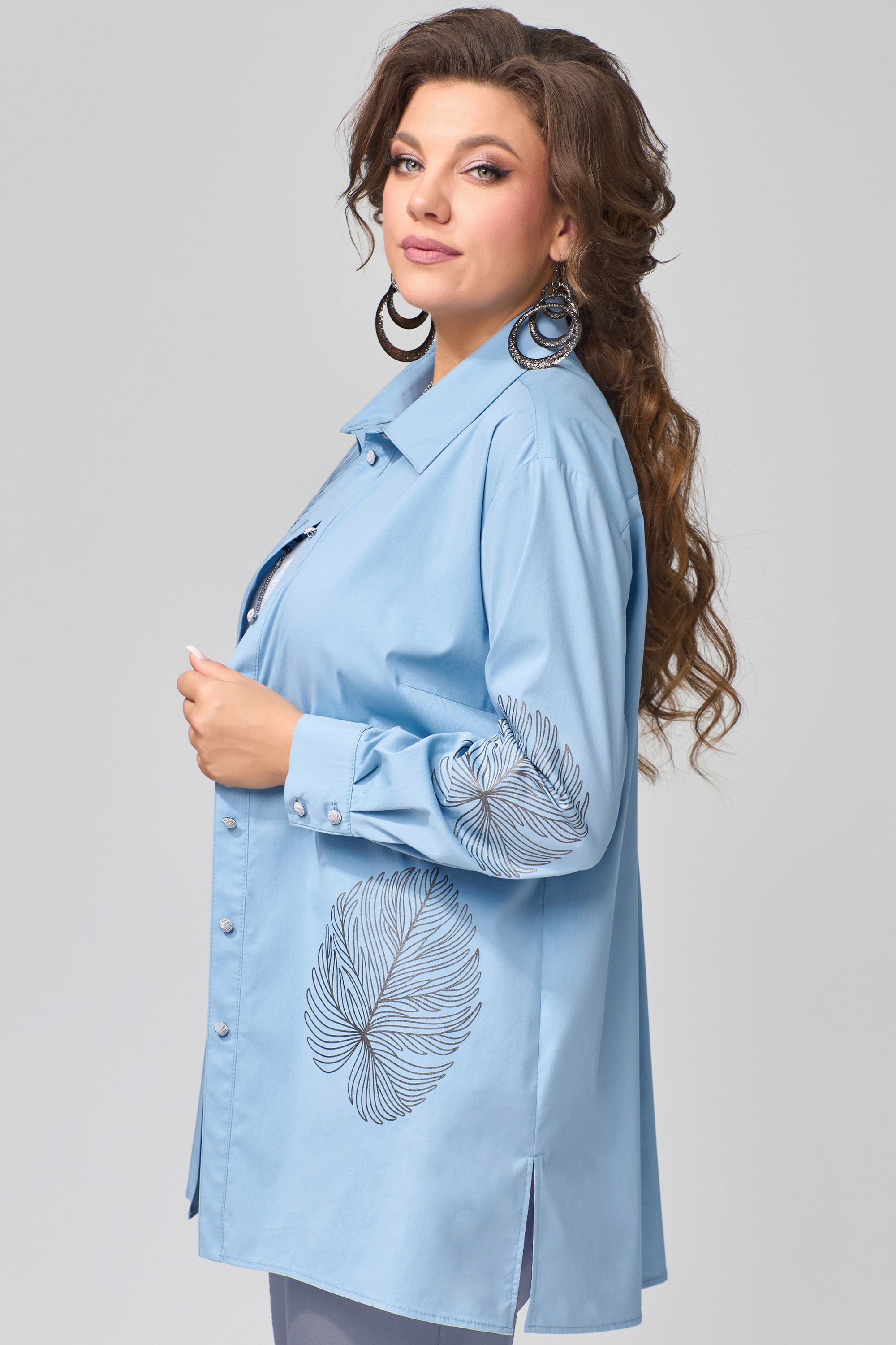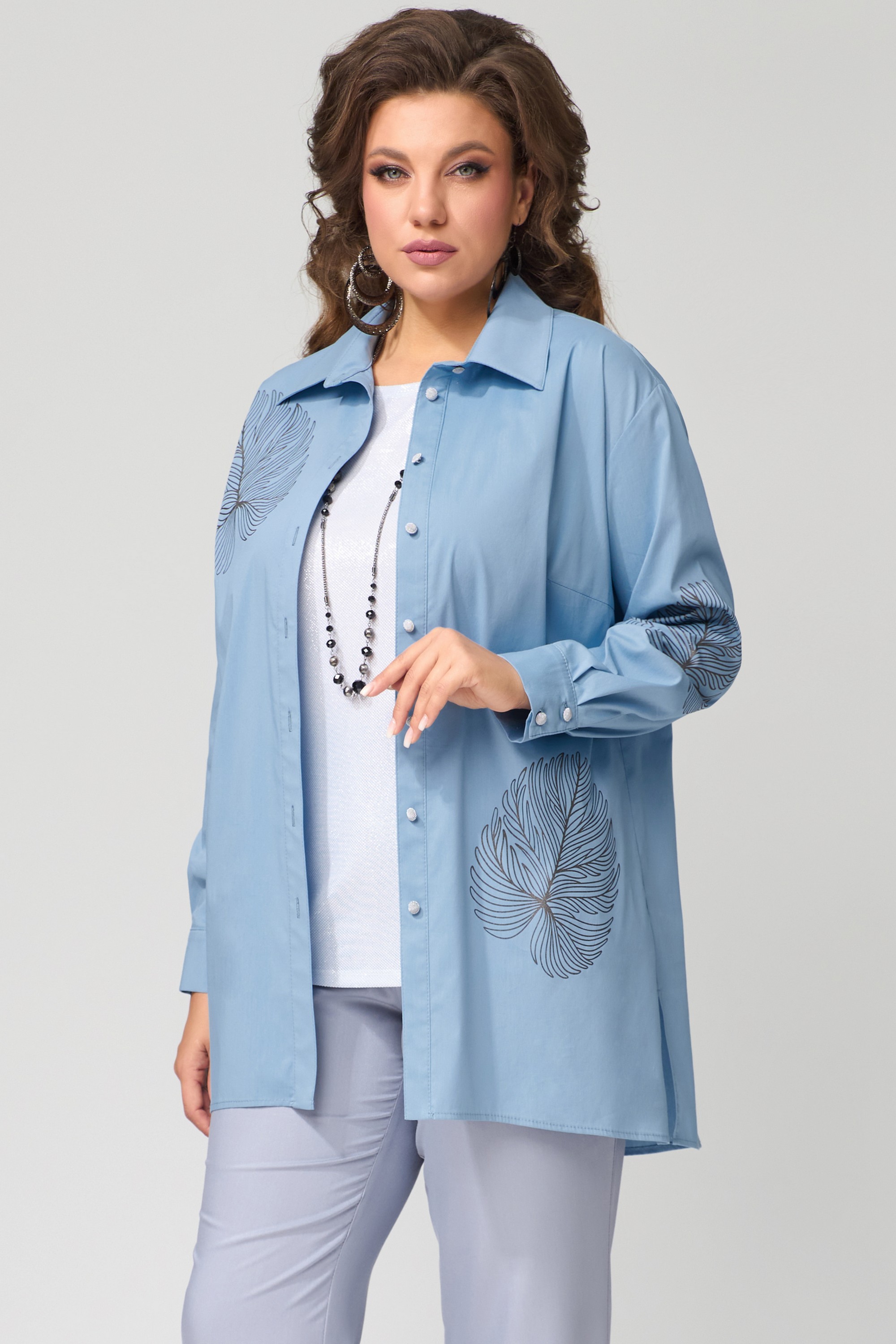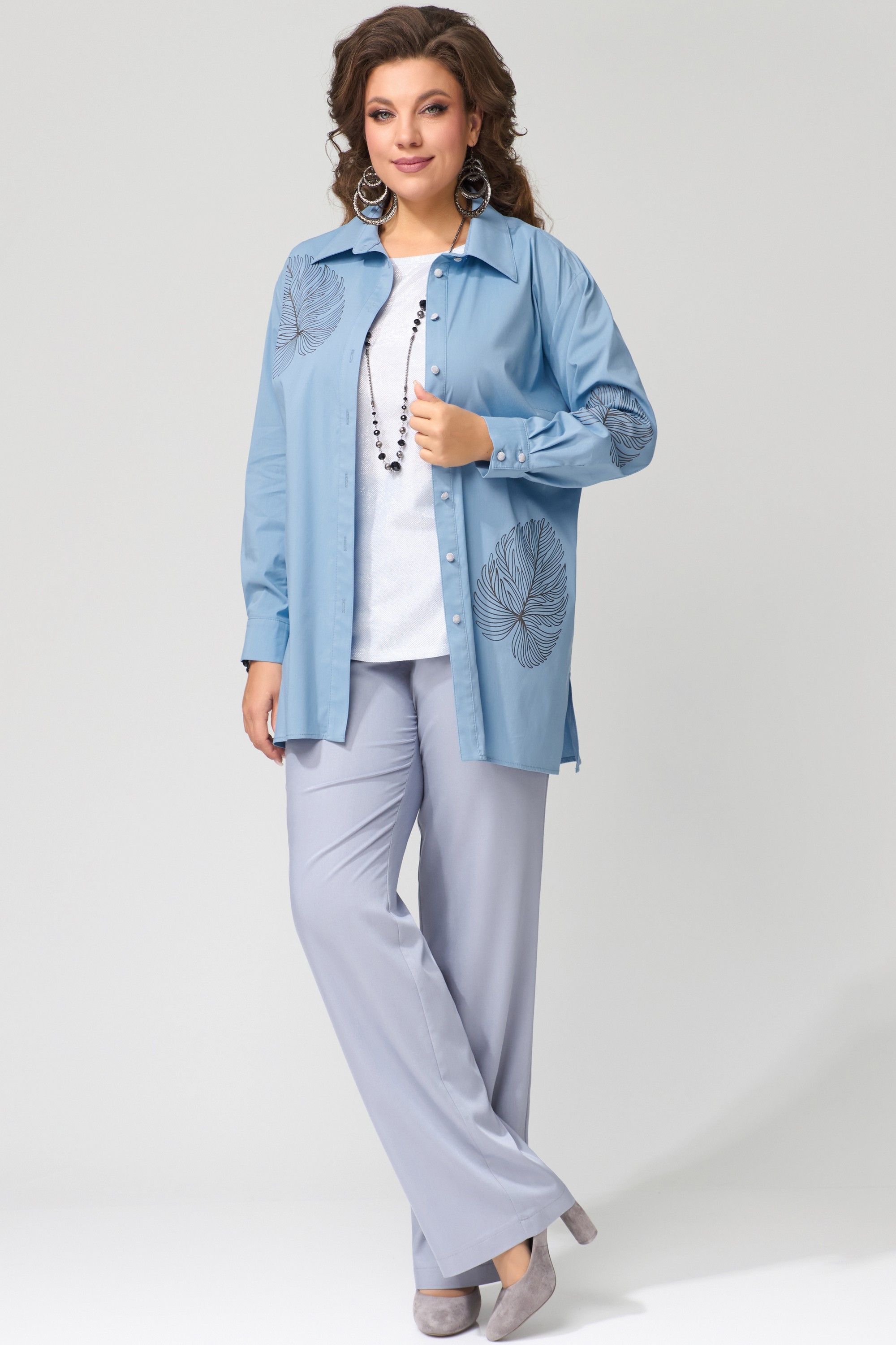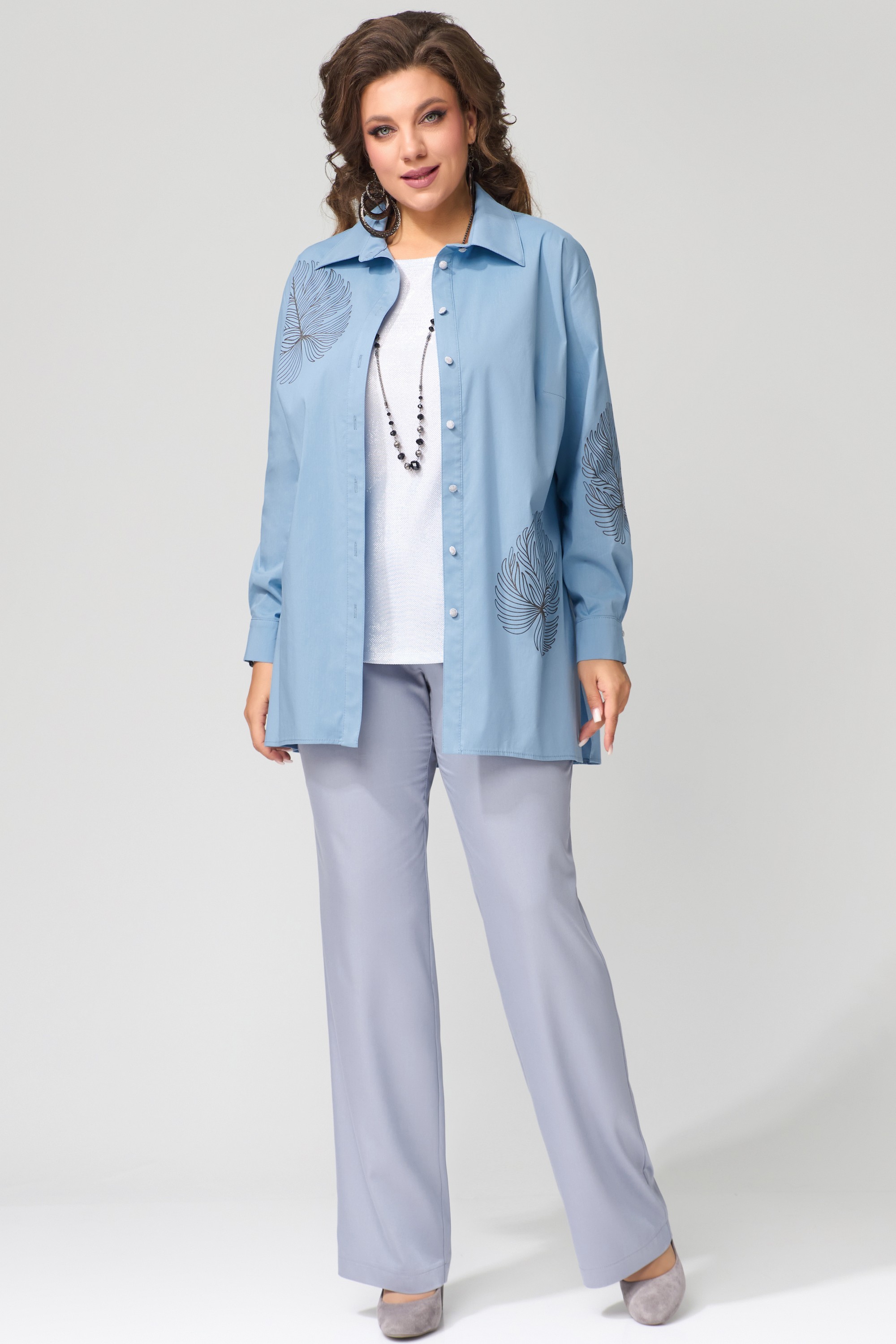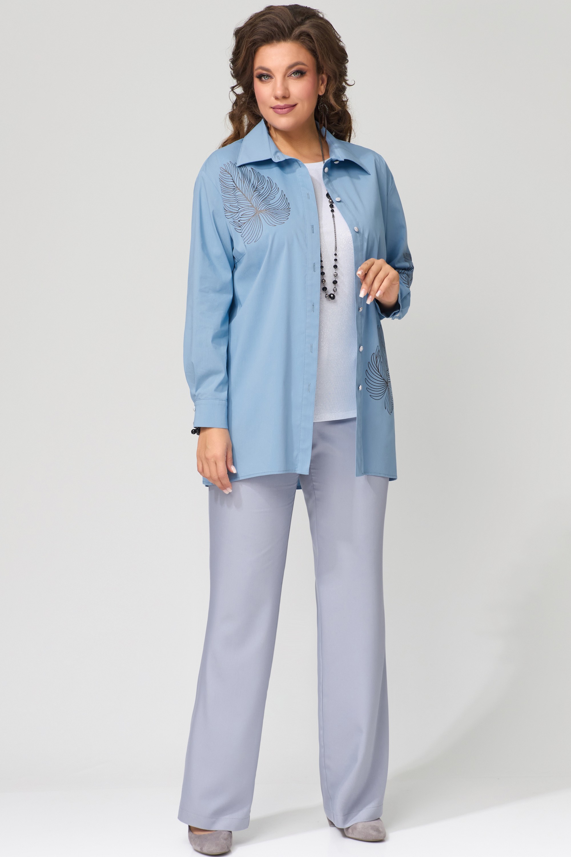 Комплект женский "Радаси" тройка. Блуза из хлопокой ткани, прямого силуэта. Рукав втачной, длина рукава не регулируется, манжет на застежку, на петли пуговицы. Воротник рубашечного типа со стойкой, край борта обработан отрезной планкой. Топ прямого силуэта с выточкой по груди. Горловина и пройма обработаны планкой, низ в подгибку.