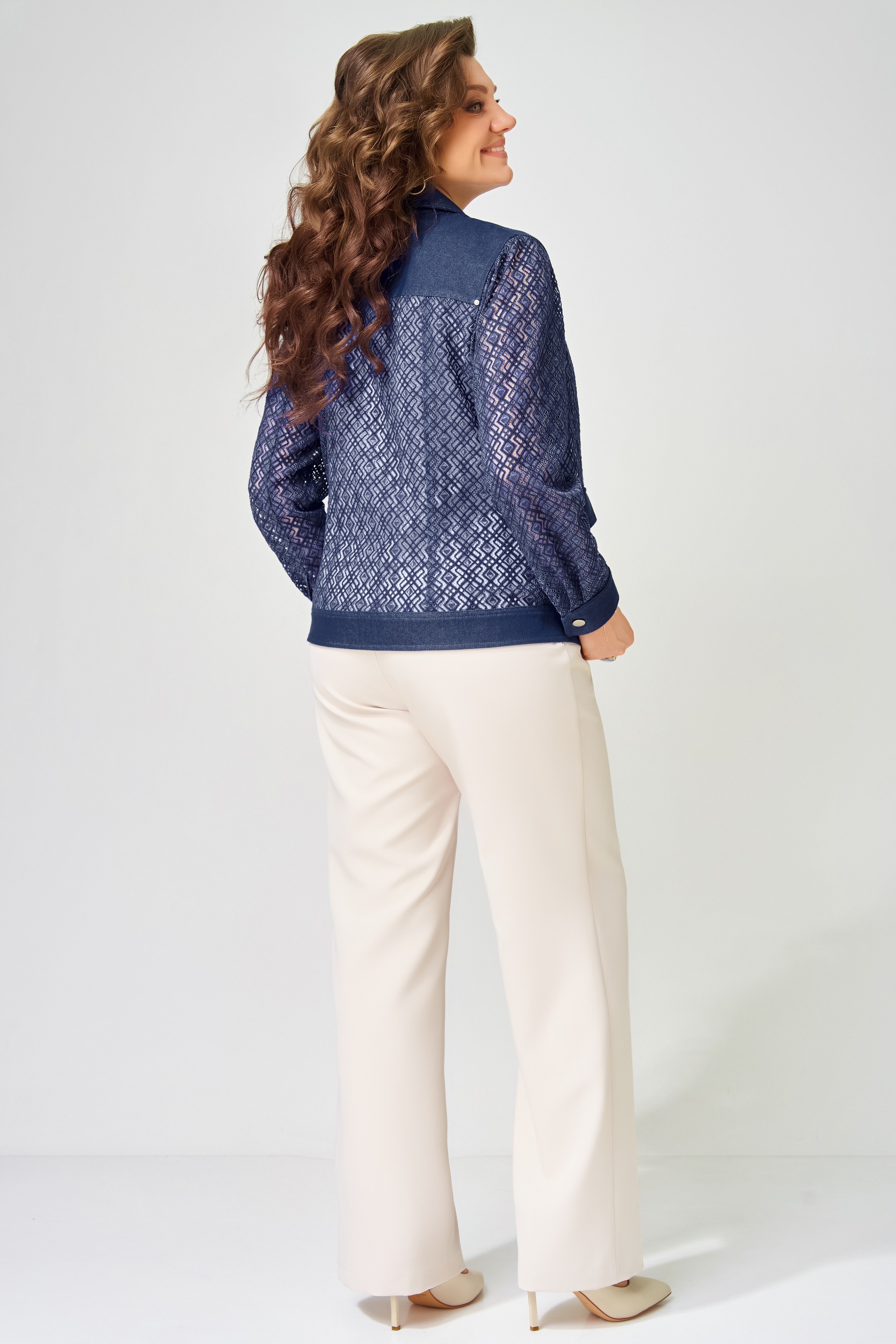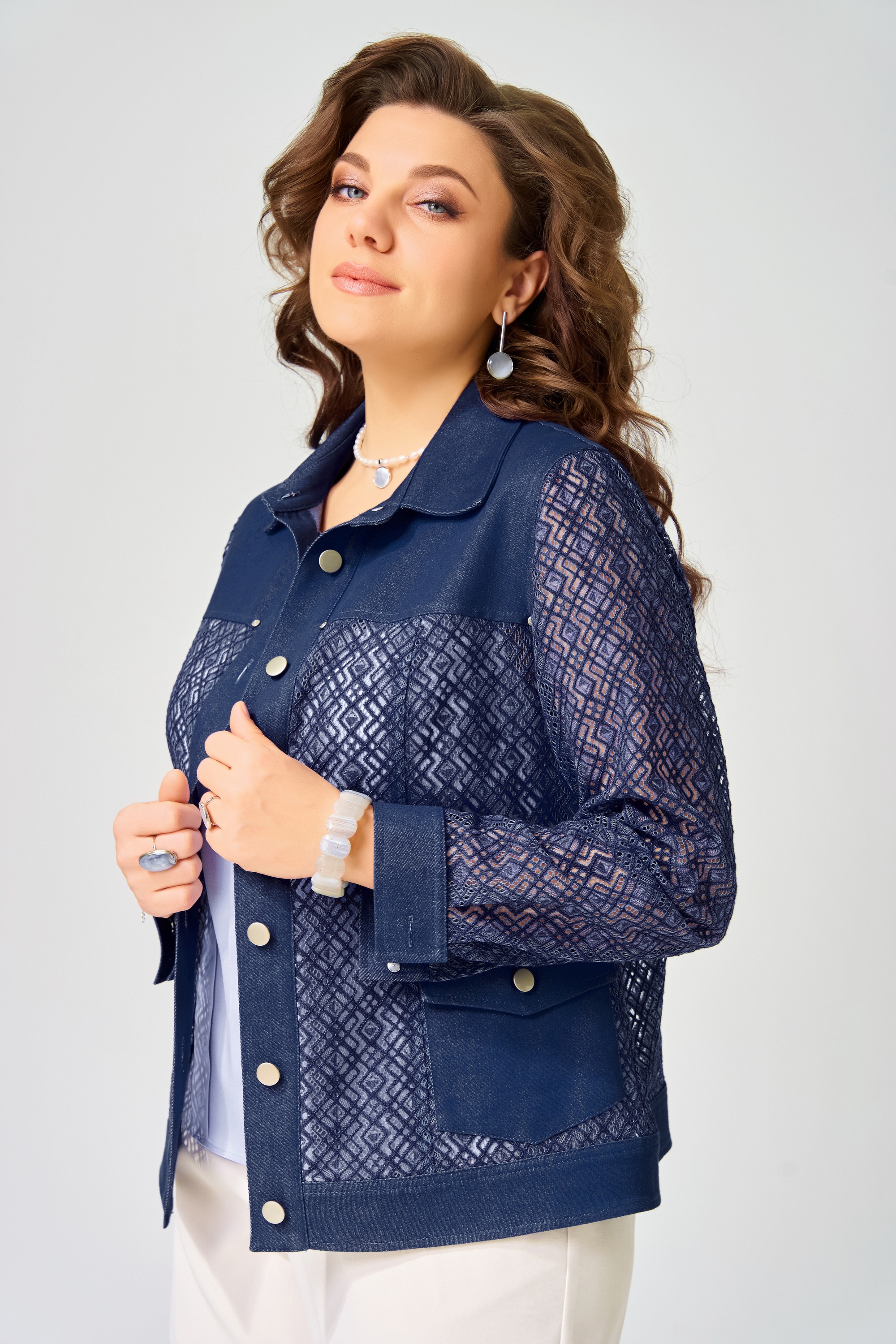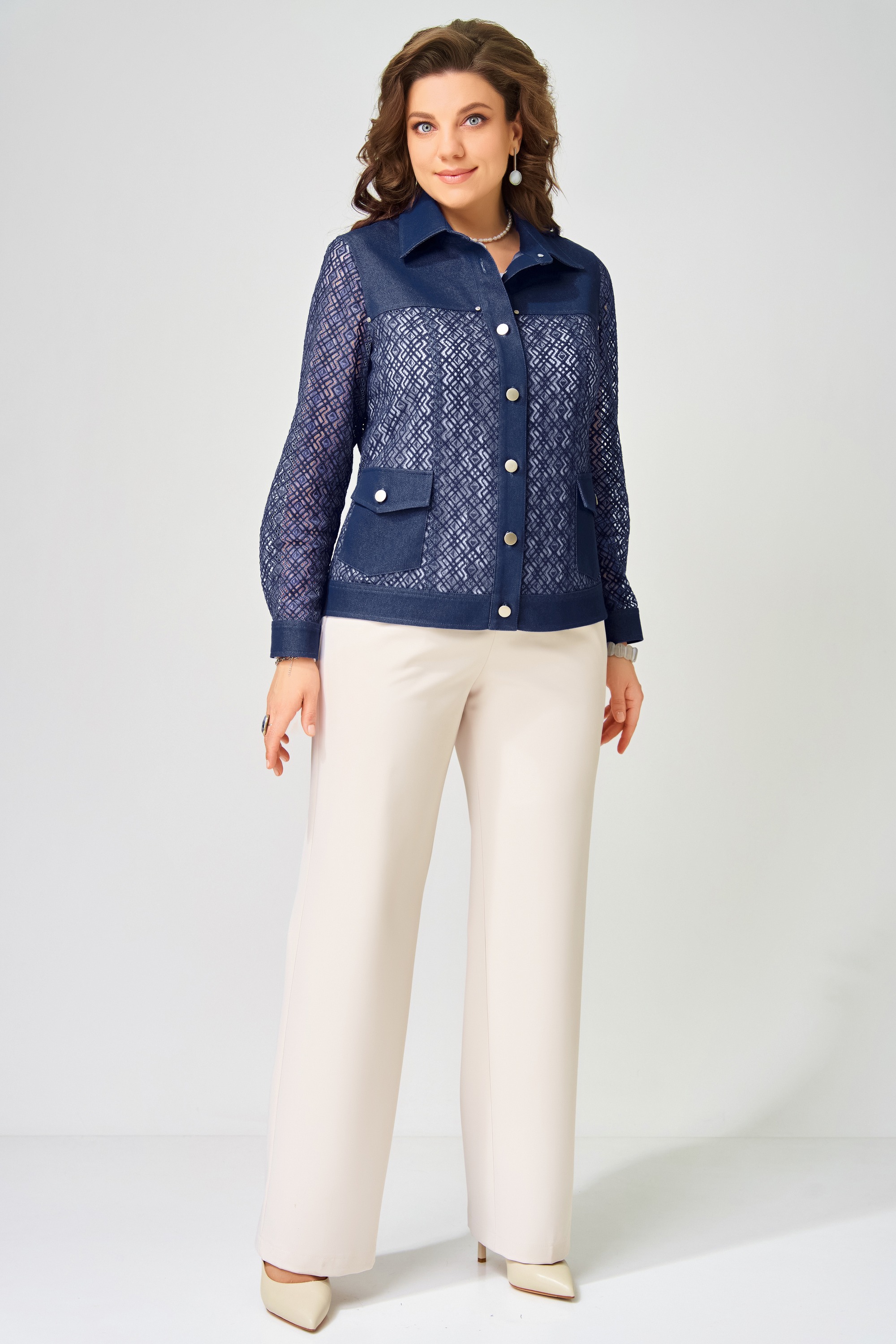 Жакет без подкладки, выполнен из кружевной и джинсовой ткани. Застежка в жакете однобортная на петли и пуговицы, планка по борту отрезная, отсроченная отделочными строчками. По полочке - кокетка и рельефы. Карманы накладные с клапаном и с застежкой на петли и пуговицы. По спинке - кокетка и рельефы. Рукава в жакете втачные двухшовные, по низу рукава - манжет с застежкой на петли и пуговицы. Воротник отложной рубашечного типа со стойкой, по низу жакета отрезной пояс, отсроченный отделочной строчкой. На кокетке полочки.
