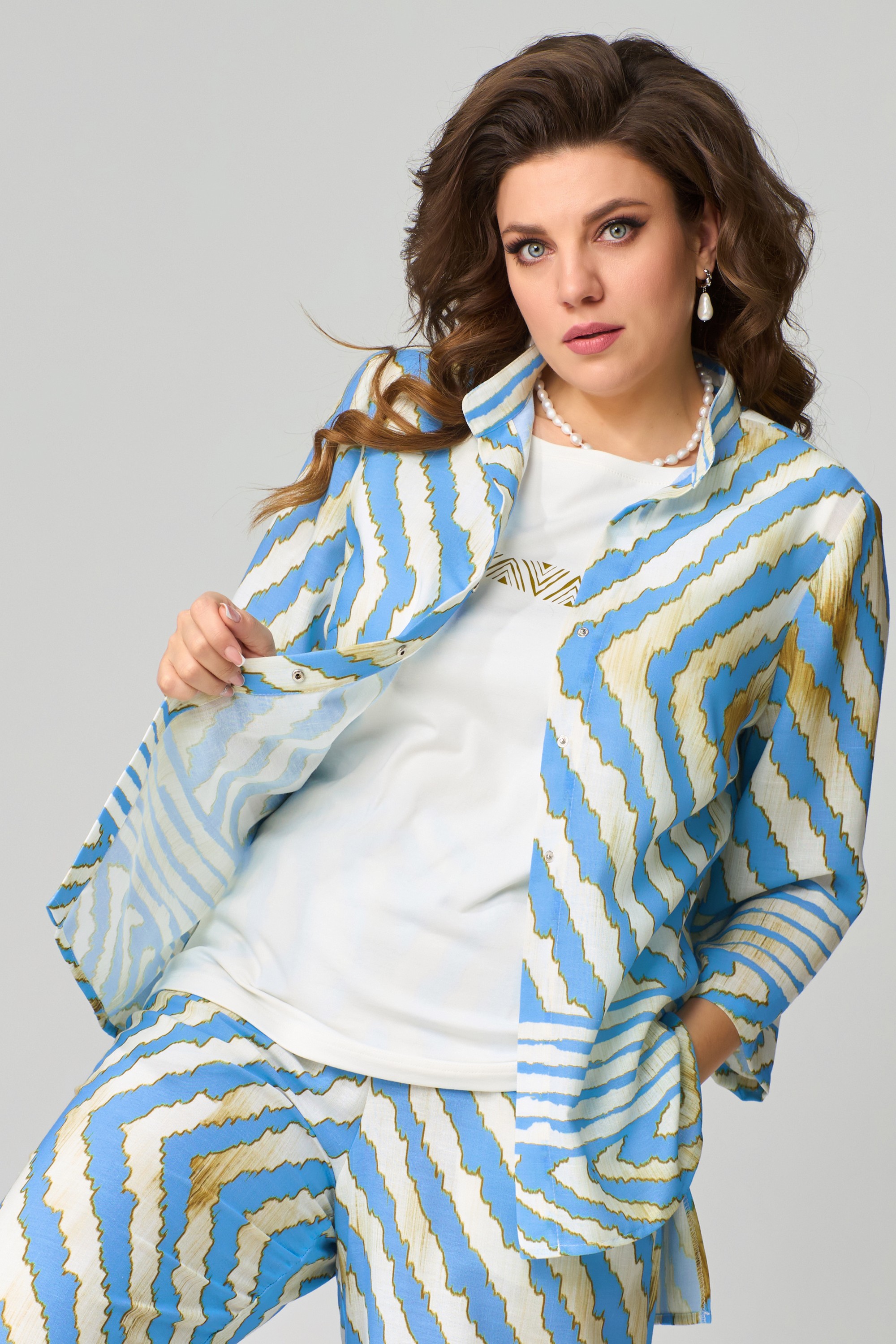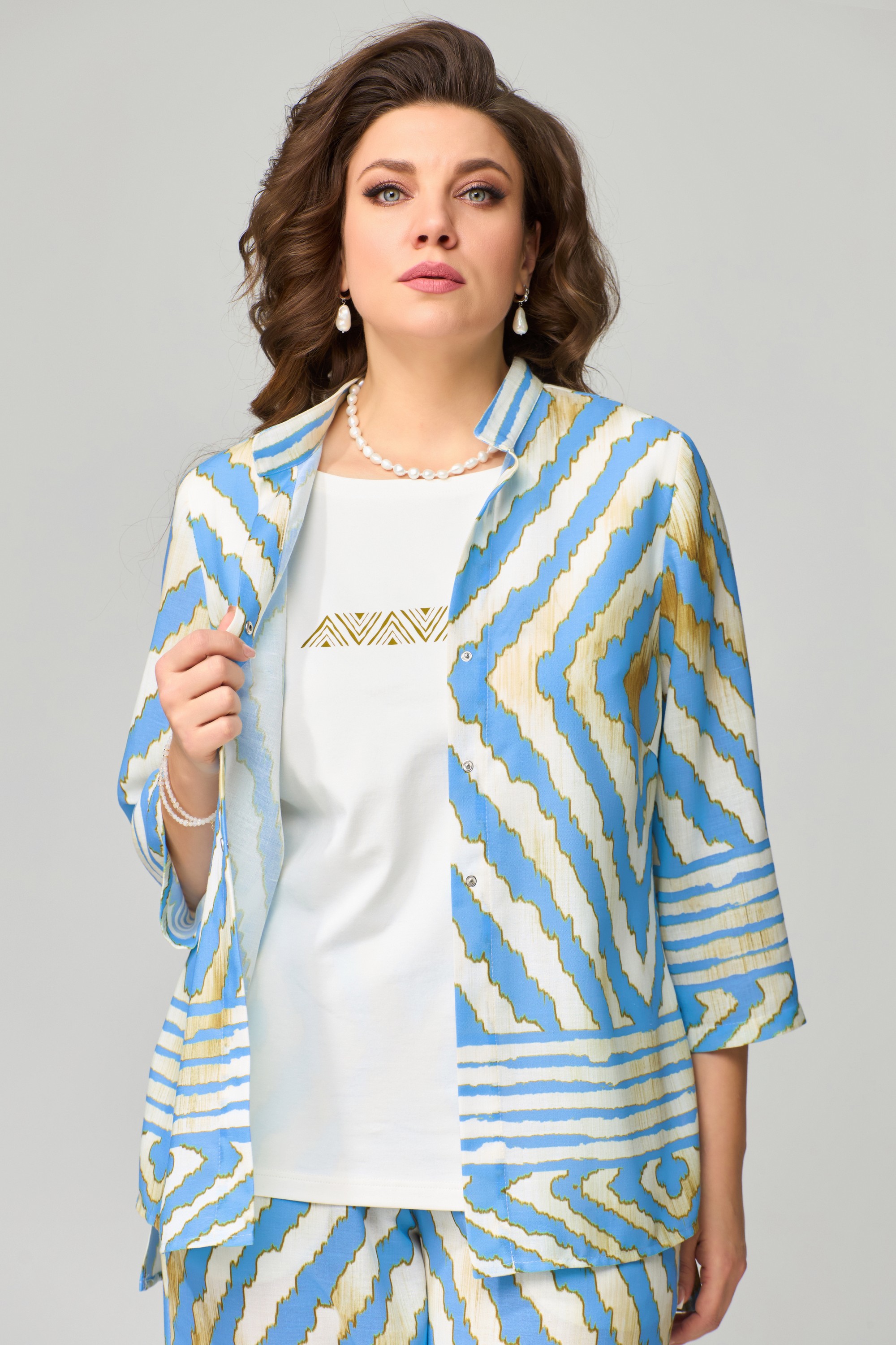 Комплект женский нарядный "Санда" летний для выхода и повседневного образа (блузка, брюки, топ). Блузка прямого силуэта, застежка однобортная, на кнопки, по горловине стойка, по полочке - нагрудная выточка. Спинка в блузке без шва, рукав одношовный 7/8. Низ блузки и рукава обработан швом в подгибку с закрытым срезом. Брюки - прямого силуэта, в боковом шве - карманы, пояс на резинке, низ брюк обработан швом в подгибку, с закрытым срезом. Топ с печатью на полочке, изготовлен топ из трикотажной ткани, полуприлегающего силуэта. По полочке топа - нагрудная выточка, проймы и горловина обработаны планкой, низ изделия обработан на распошивалке.