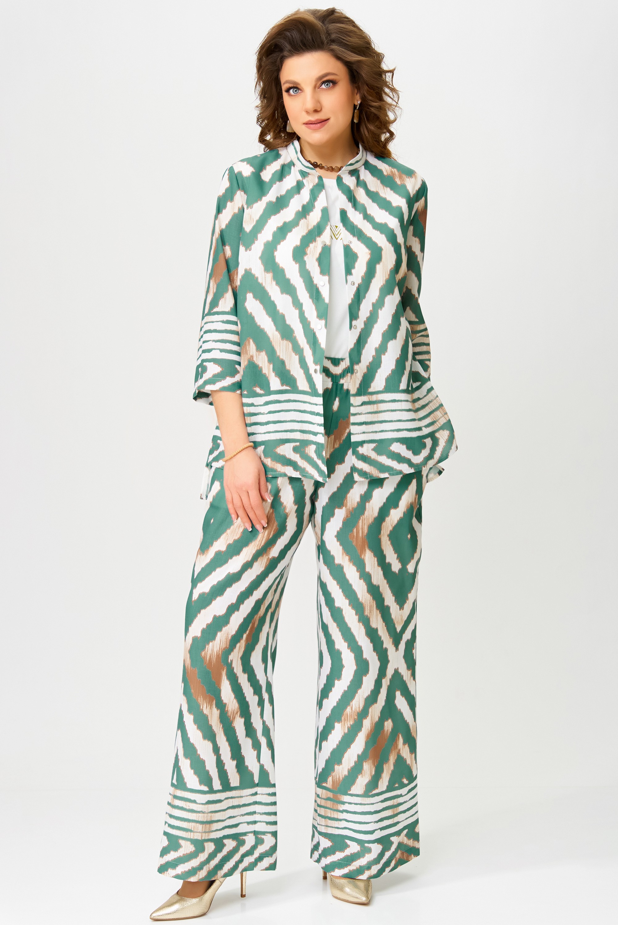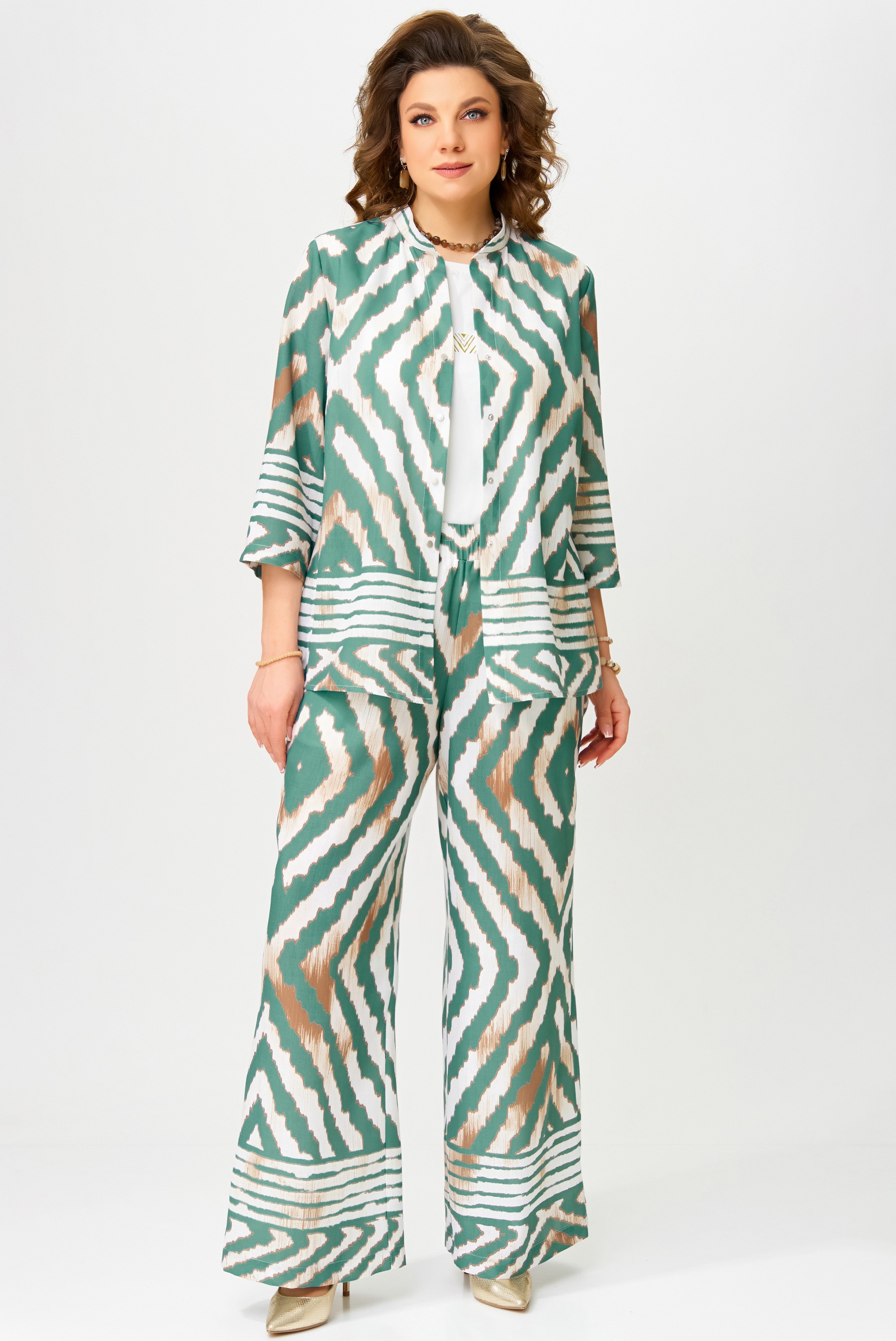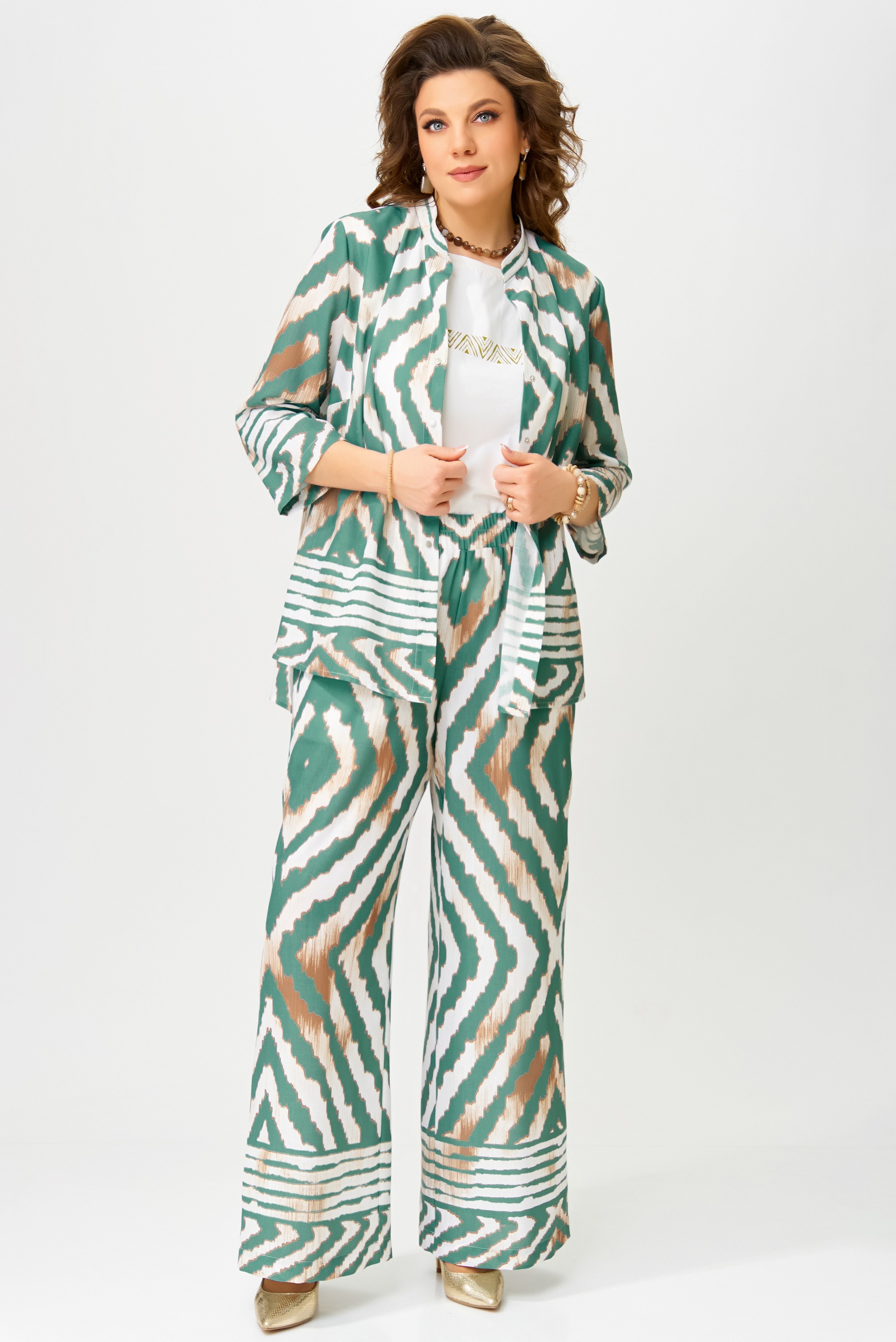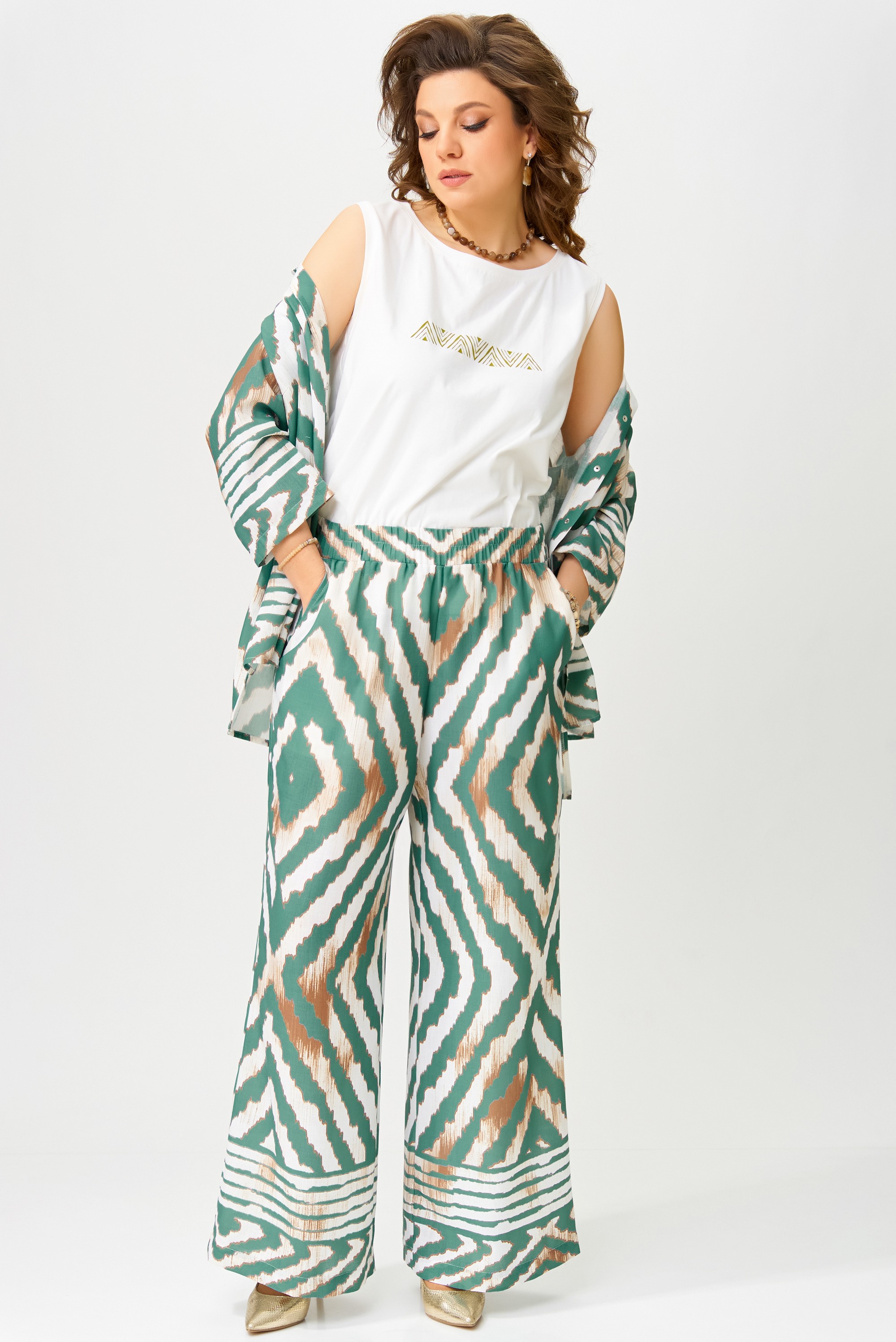 Комплект женский нарядный "Санда" летний для выхода и повседневного образа (блузка, брюки, топ). Блузка прямого силуэта, застежка однобортная, на кнопки, по горловине стойка, по полочке - нагрудная выточка. Спинка в блузке без шва, рукав одношовный 7/8. Низ блузки и рукава обработан швом в подгибку с закрытым срезом. Брюки - прямого силуэта, в боковом шве - карманы, пояс на резинке, низ брюк обработан швом в подгибку, с закрытым срезом. Топ с печатью на полочке, изготовлен топ из трикотажной ткани, полуприлегающего силуэта. По полочке топа - нагрудная выточка, проймы и горловина обработаны планкой, низ изделия обработан на распошивалке.