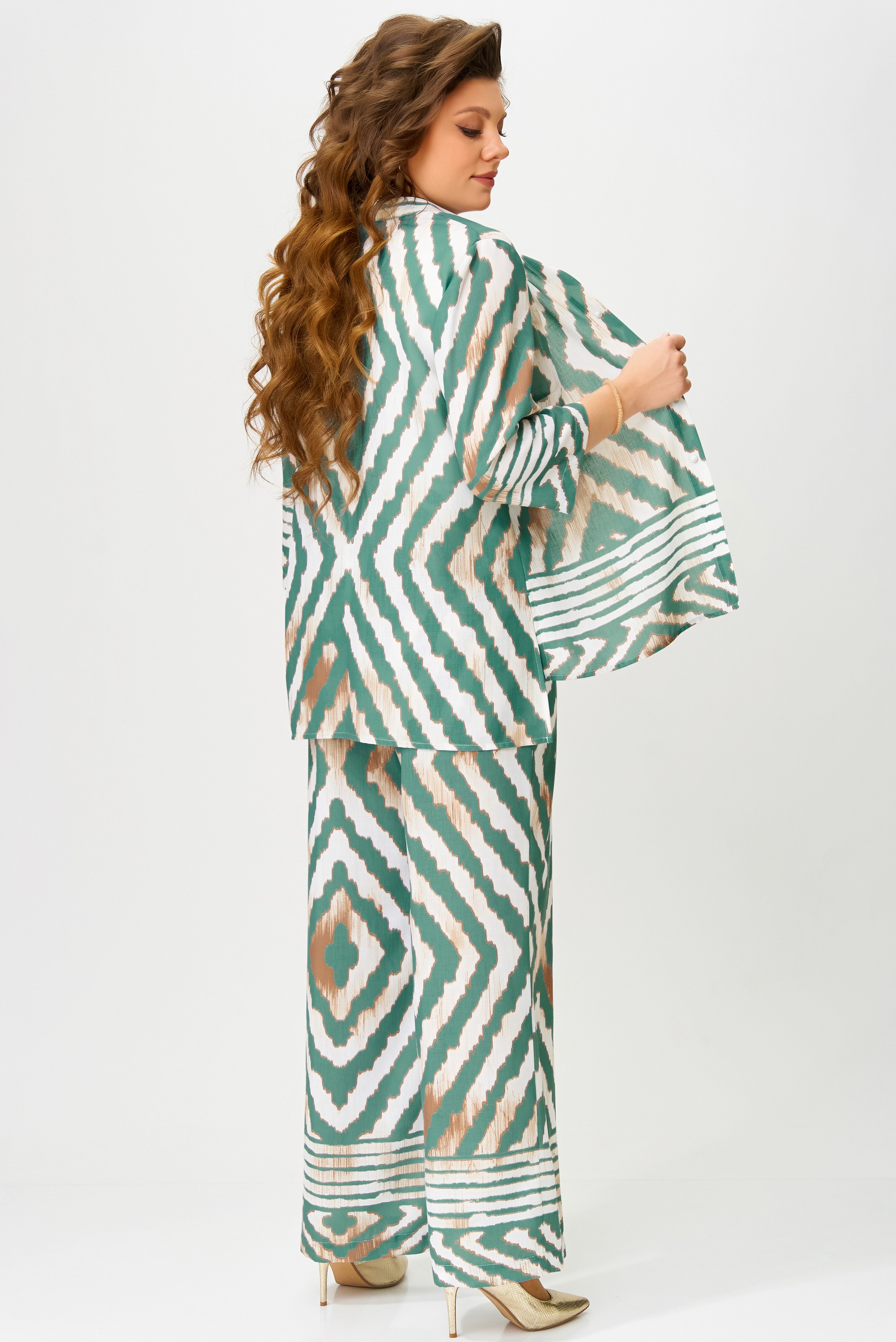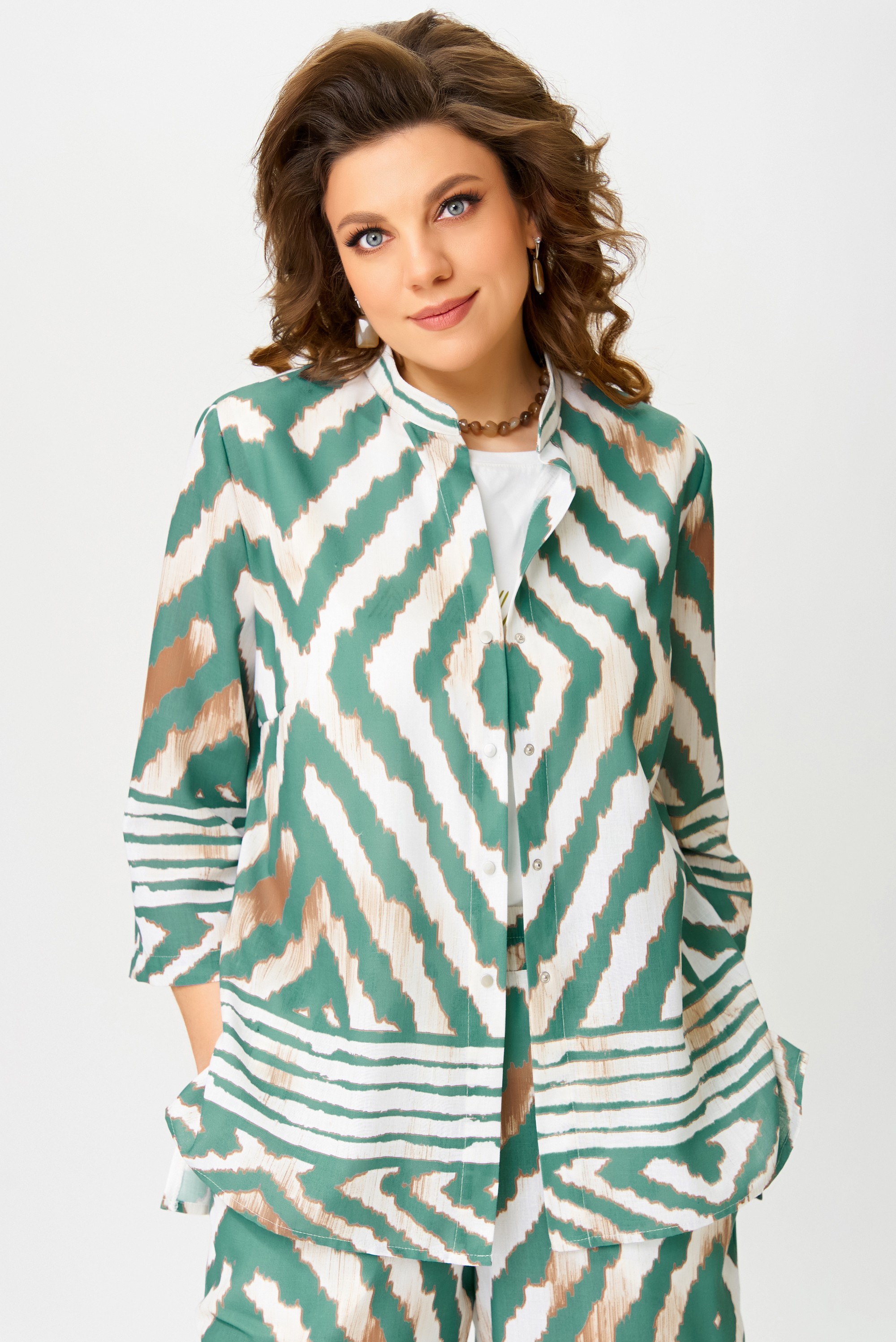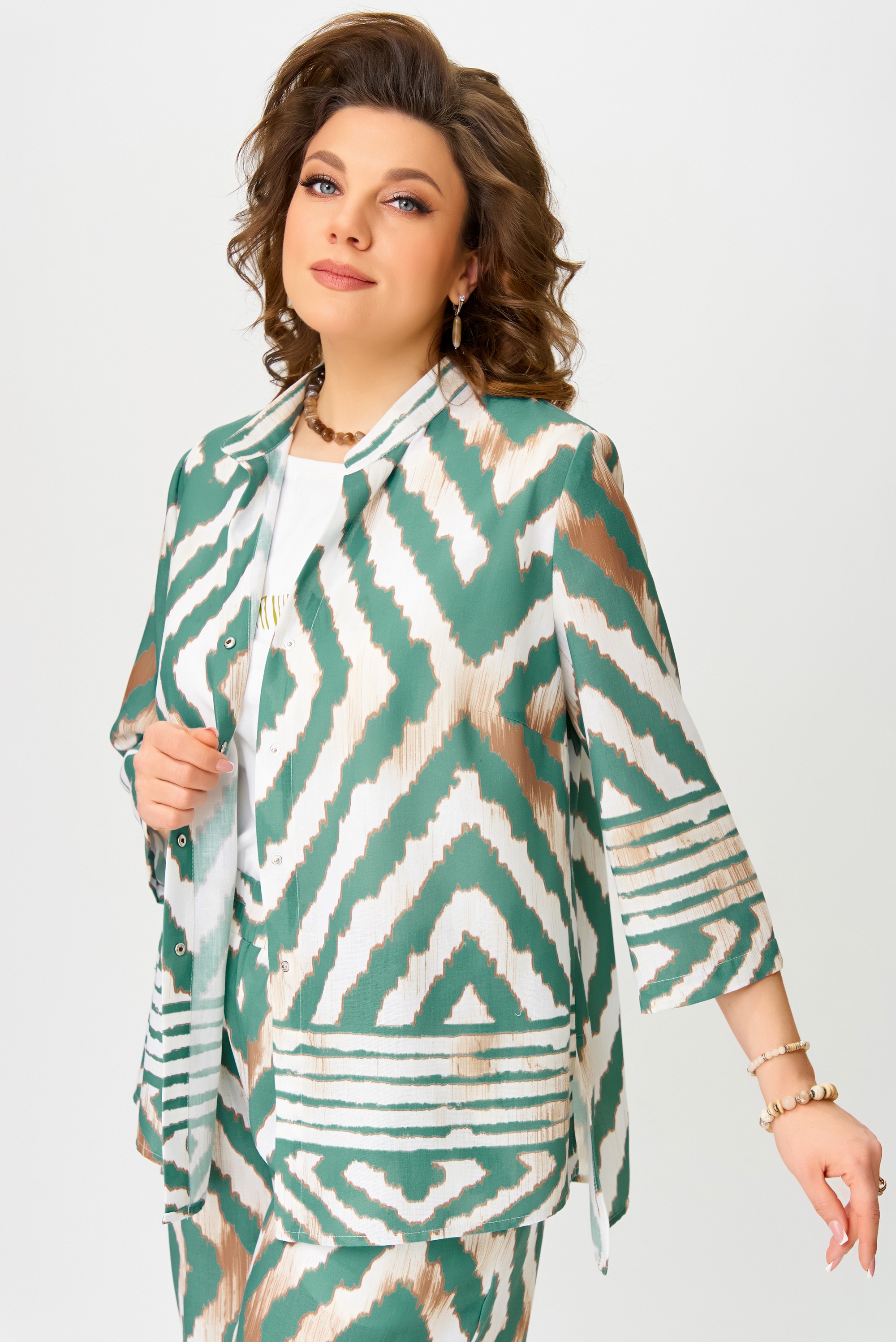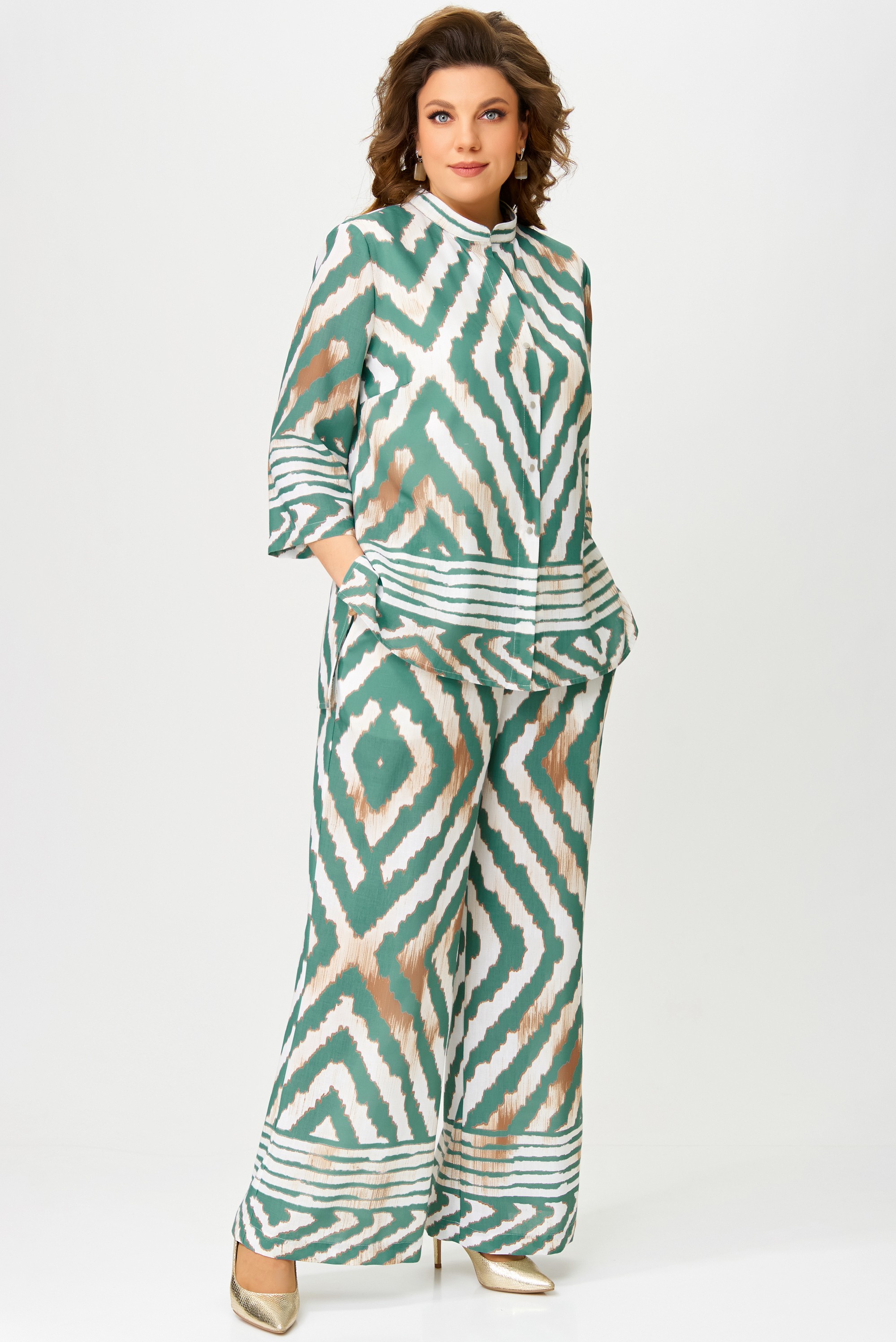 Комплект женский нарядный "Санда" летний для выхода и повседневного образа (блузка, брюки, топ). Блузка прямого силуэта, застежка однобортная, на кнопки, по горловине стойка, по полочке - нагрудная выточка. Спинка в блузке без шва, рукав одношовный 7/8. Низ блузки и рукава обработан швом в подгибку с закрытым срезом. Брюки - прямого силуэта, в боковом шве - карманы, пояс на резинке, низ брюк обработан швом в подгибку, с закрытым срезом. Топ с печатью на полочке, изготовлен топ из трикотажной ткани, полуприлегающего силуэта. По полочке топа - нагрудная выточка, проймы и горловина обработаны планкой, низ изделия обработан на распошивалке.