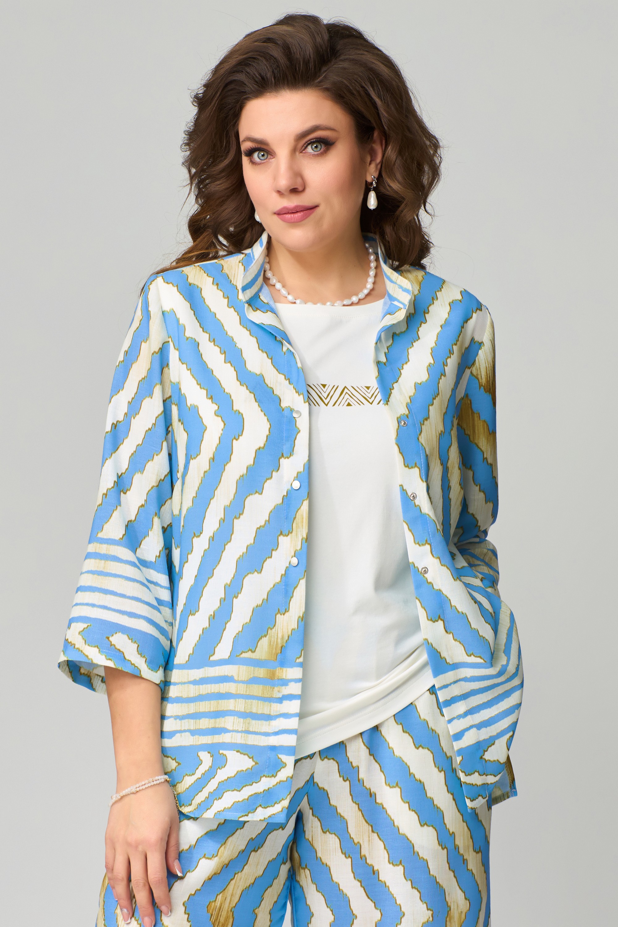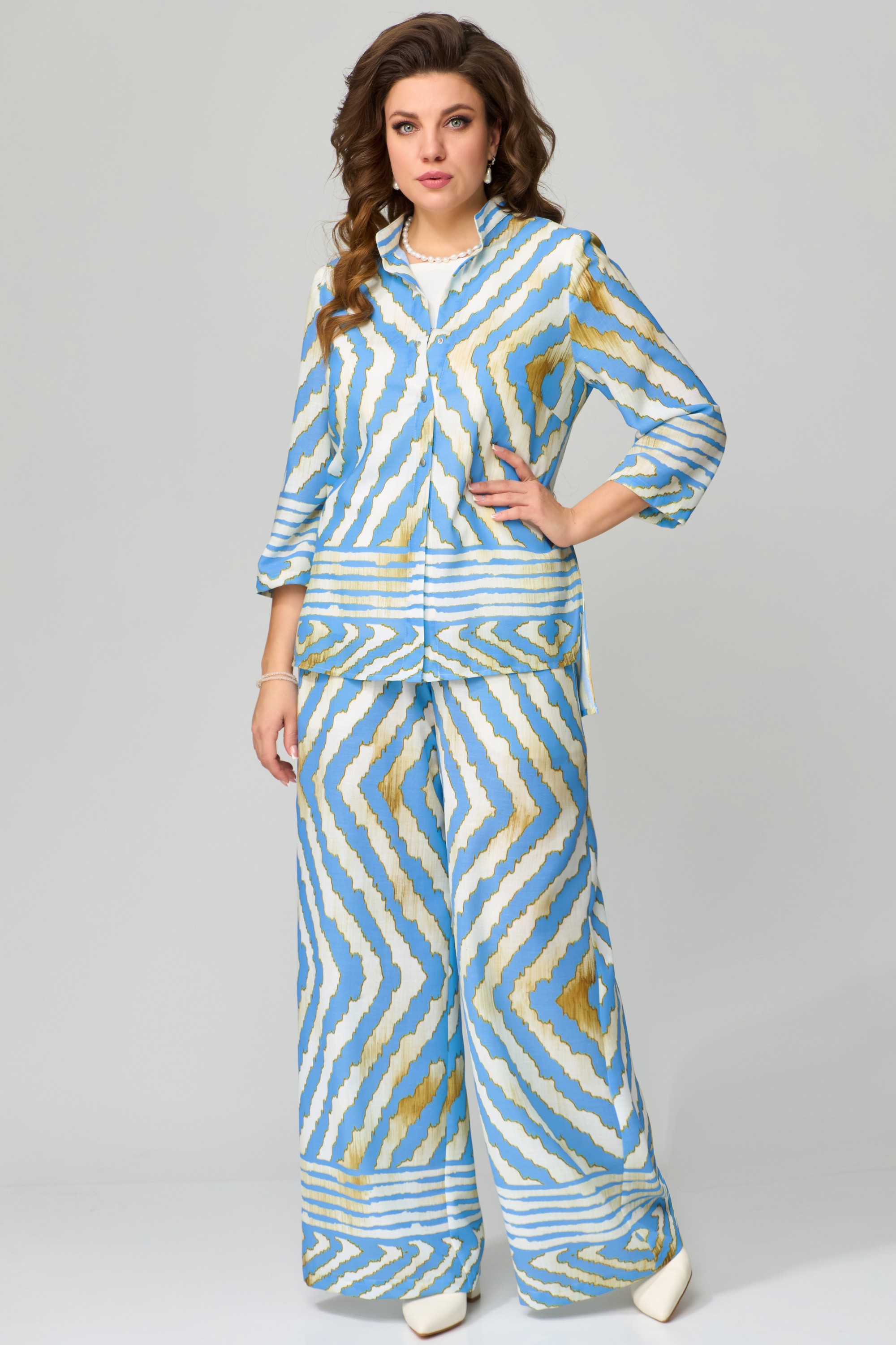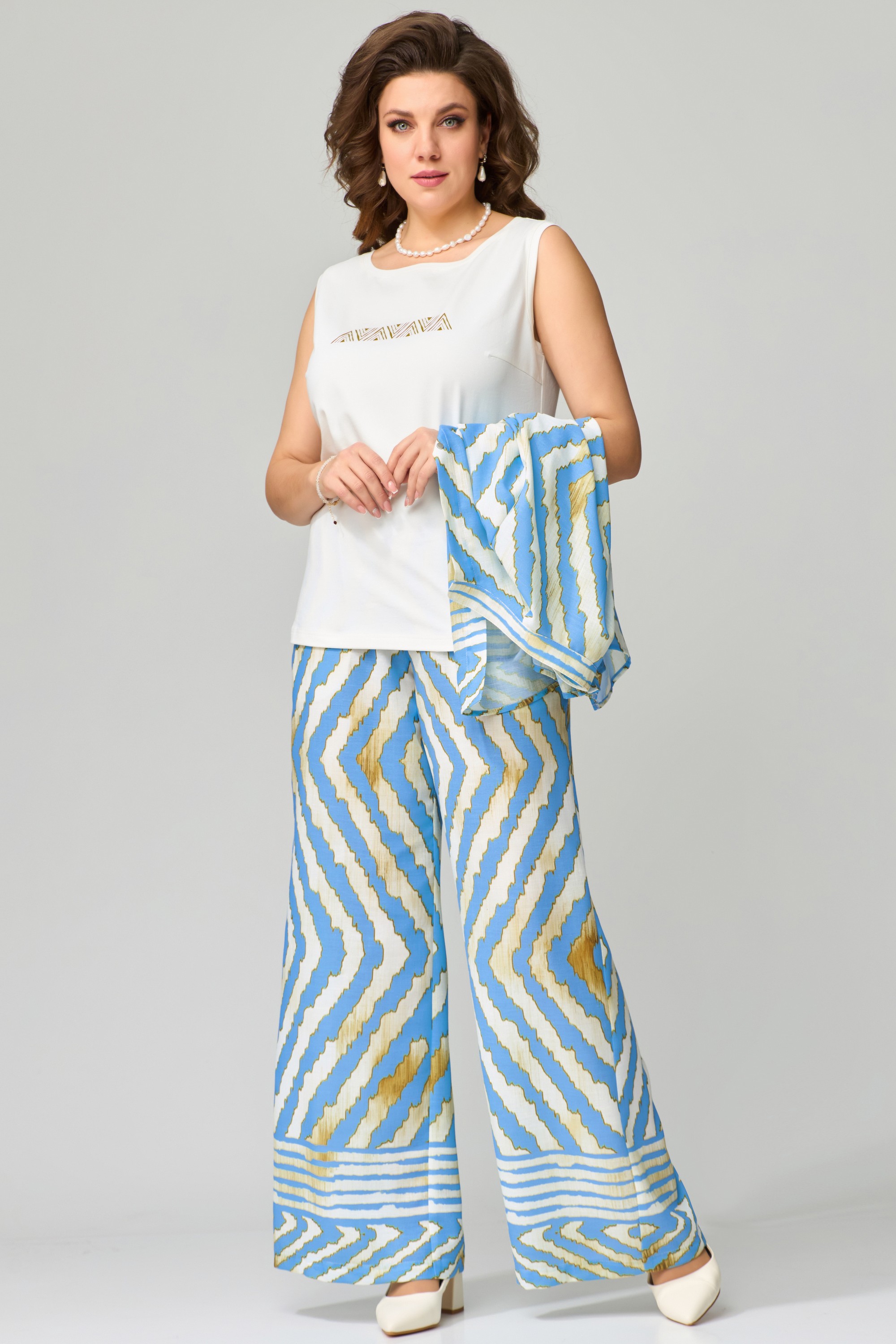 Комплект женский нарядный "Санда" летний для выхода и повседневного образа (блузка, брюки, топ). Блузка прямого силуэта, застежка однобортная, на кнопки, по горловине стойка, по полочке - нагрудная выточка. Спинка в блузке без шва, рукав одношовный 7/8. Низ блузки и рукава обработан швом в подгибку с закрытым срезом. Брюки - прямого силуэта, в боковом шве - карманы, пояс на резинке, низ брюк обработан швом в подгибку, с закрытым срезом. Топ с печатью на полочке, изготовлен топ из трикотажной ткани, полуприлегающего силуэта. По полочке топа - нагрудная выточка, проймы и горловина обработаны планкой, низ изделия обработан на распошивалке.
