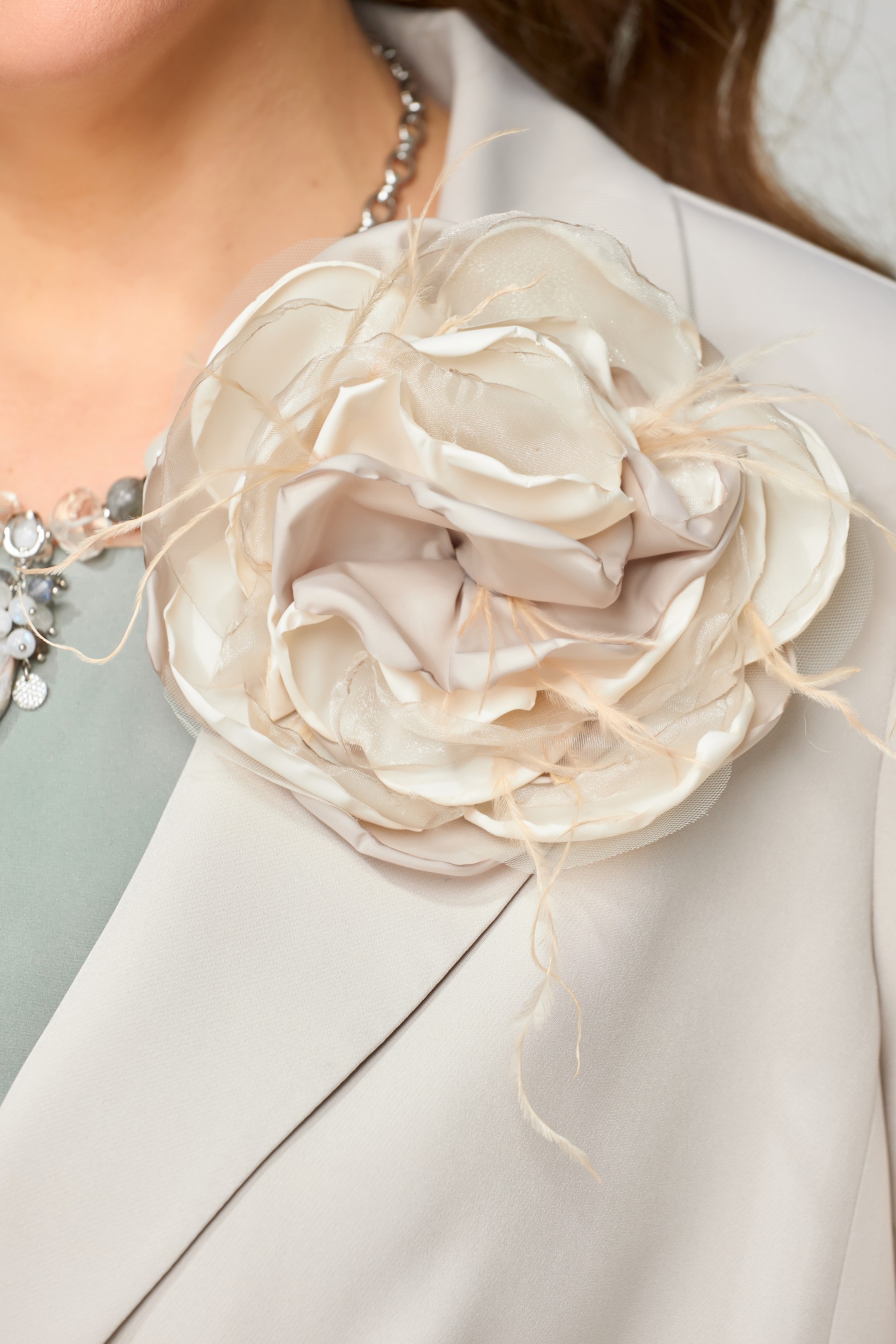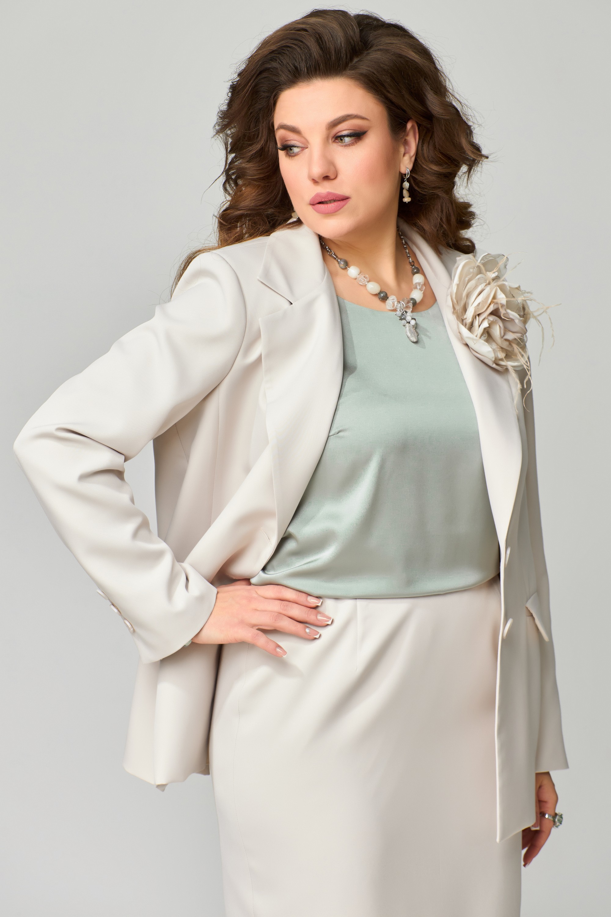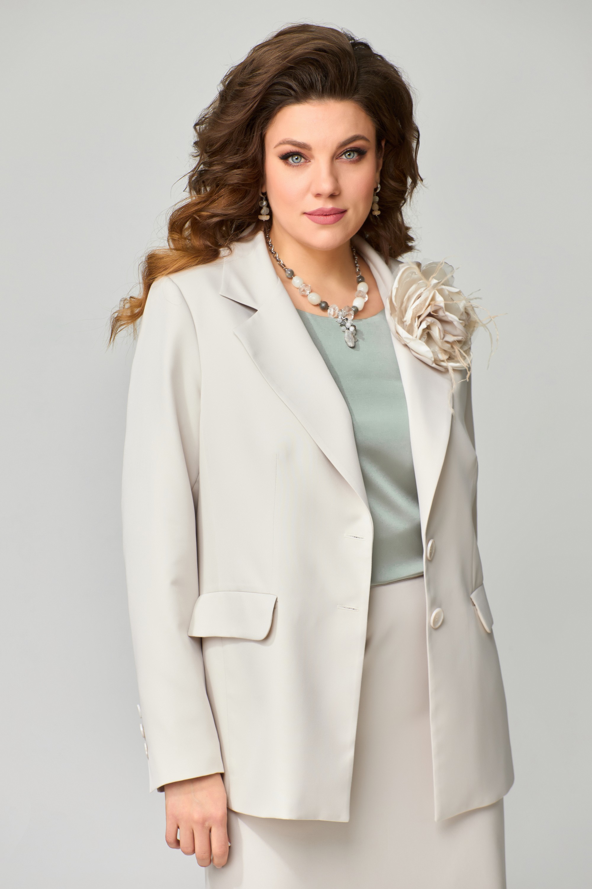 Классический юбочный костюм "Велина" прямого силуэта, жакет и юбка на подкладке. Отлично подойдет для торжественных выходов и праздников. В жакете прорезной карман с клапаном, застежка однобортная с лацканами, рукав двух шовный с закрытой шлицей и с пуговицами. По спинке изделия идет средний шов. Юбка зауженная к низу, по спинке юбки - шлица, на поясе по бокам резинка, застежка на потайную молнию и пуговицу. Блузка без рукав, с овальным вырезом по горловине, проймы и горловина обработаны обтачкой, них блузки обработан московским швом.  Цветок ручной работы .