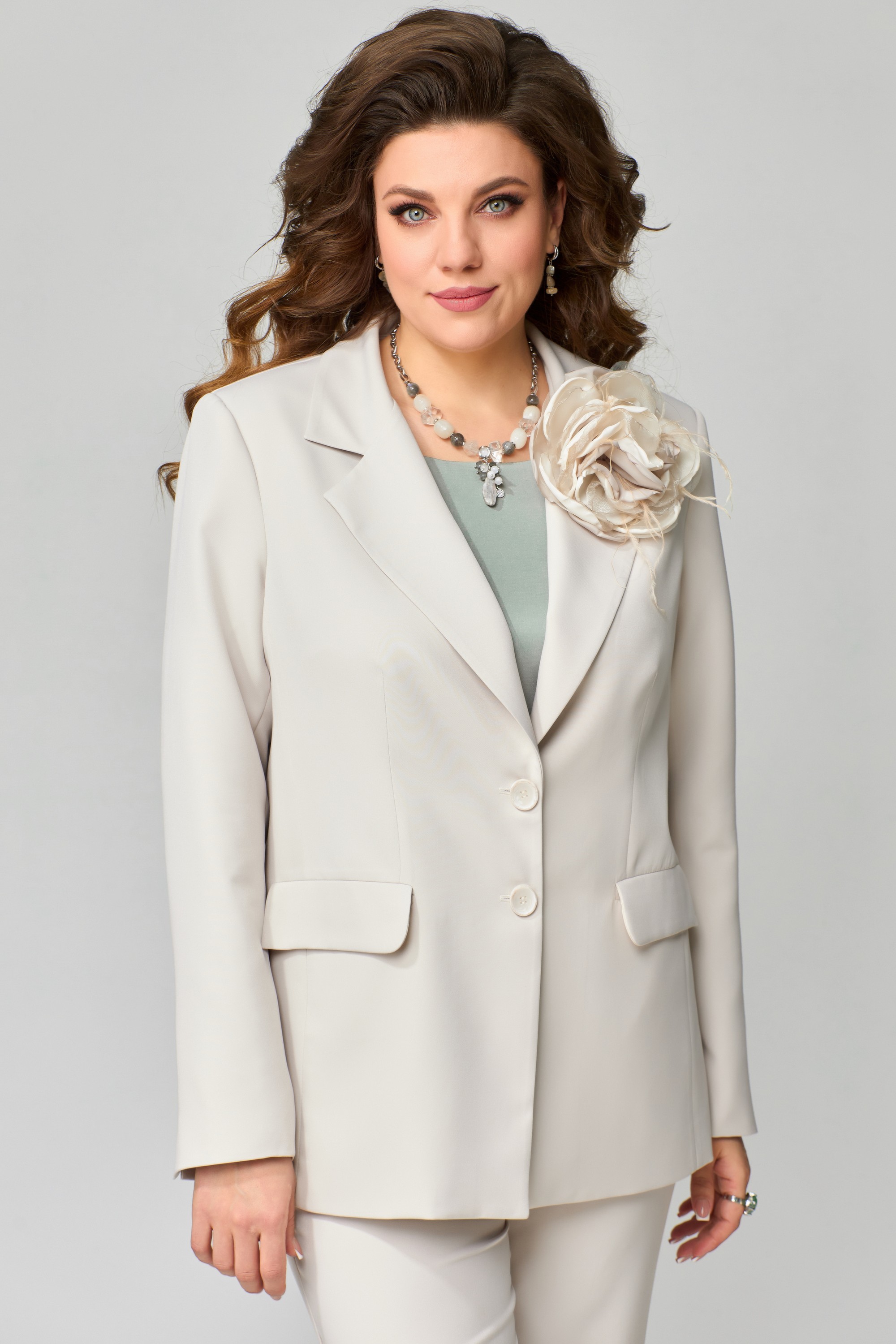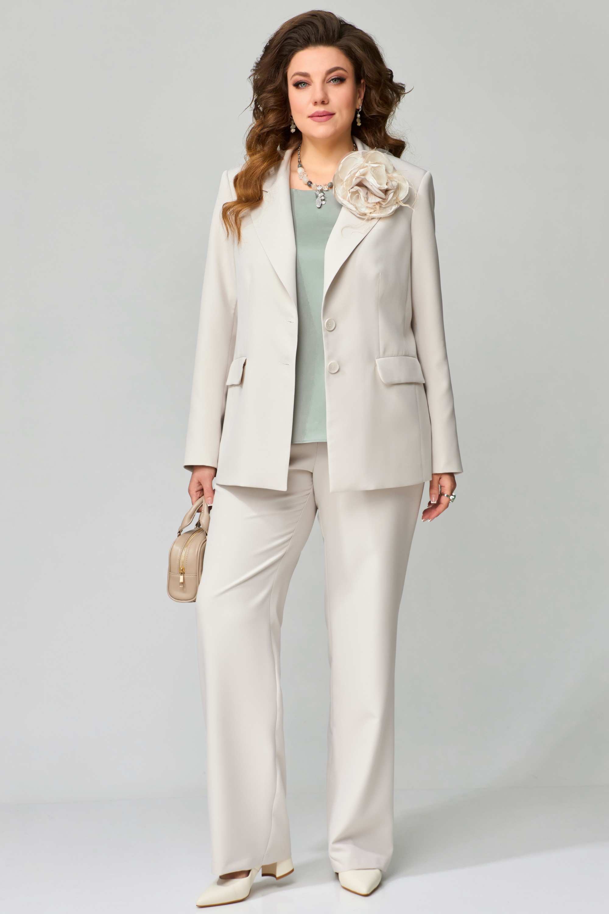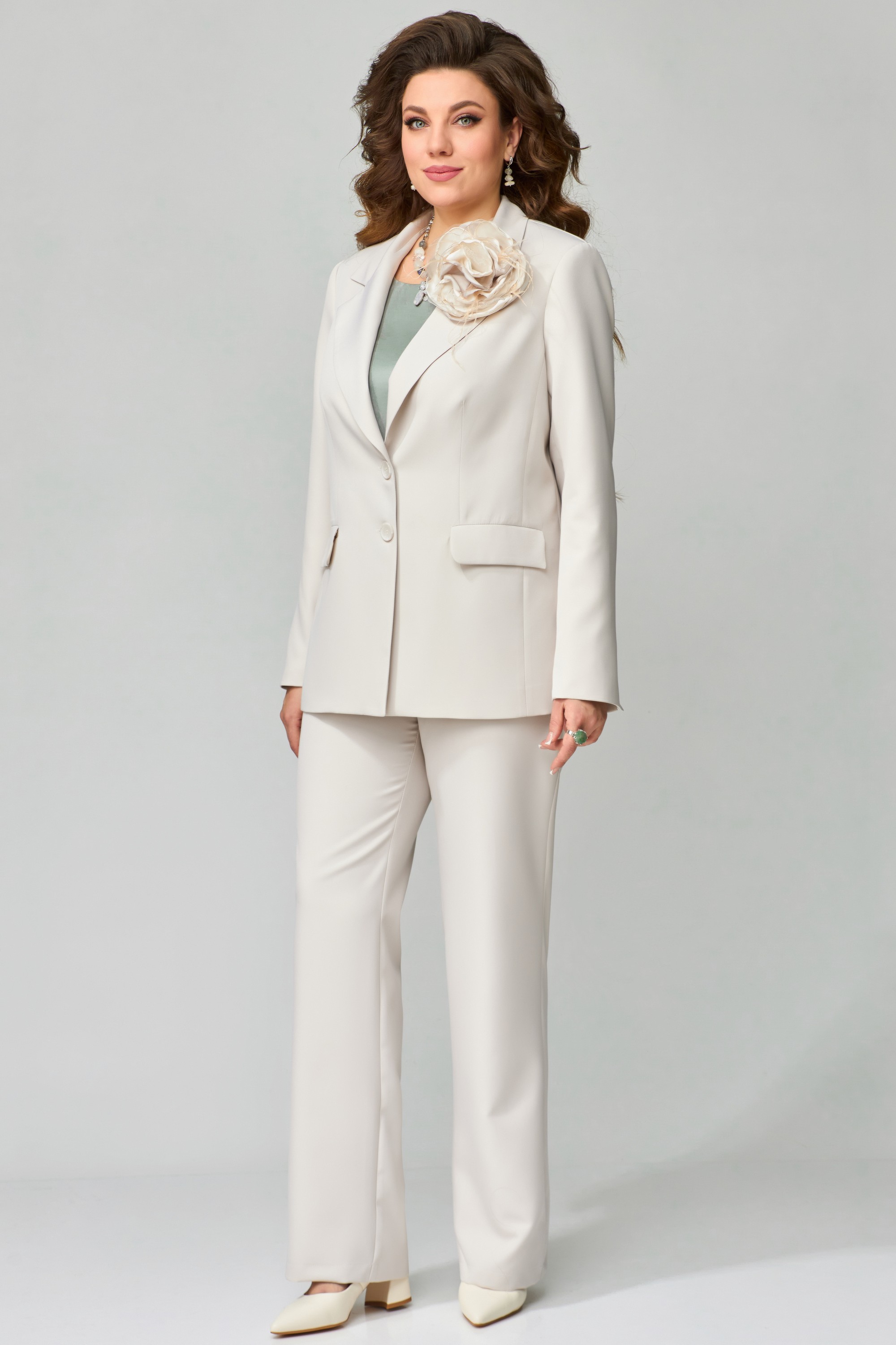 Классический брючный костюм "Велина" прямого силуэта, жакет на подкладке, брюки прямые классические. Костюм нарядный отлично подойдет для торжественных выходов и праздников. В жакете прорезной карман с клапаном, застежка однобортная с лацканами, рукав двух шовный с закрытой шлицей и с пуговицами. По спинке изделия идет средний шов. Брюки прямые, карманы в боковом шве, по спинке пояс на резинке, застежка на потайную молнию и пуговицу. Блузка без рукав, с овальным вырезом по горловине, проймы и горловина обработаны обтачкой, них блузки обработан московским швом. Цветок ручной работы .