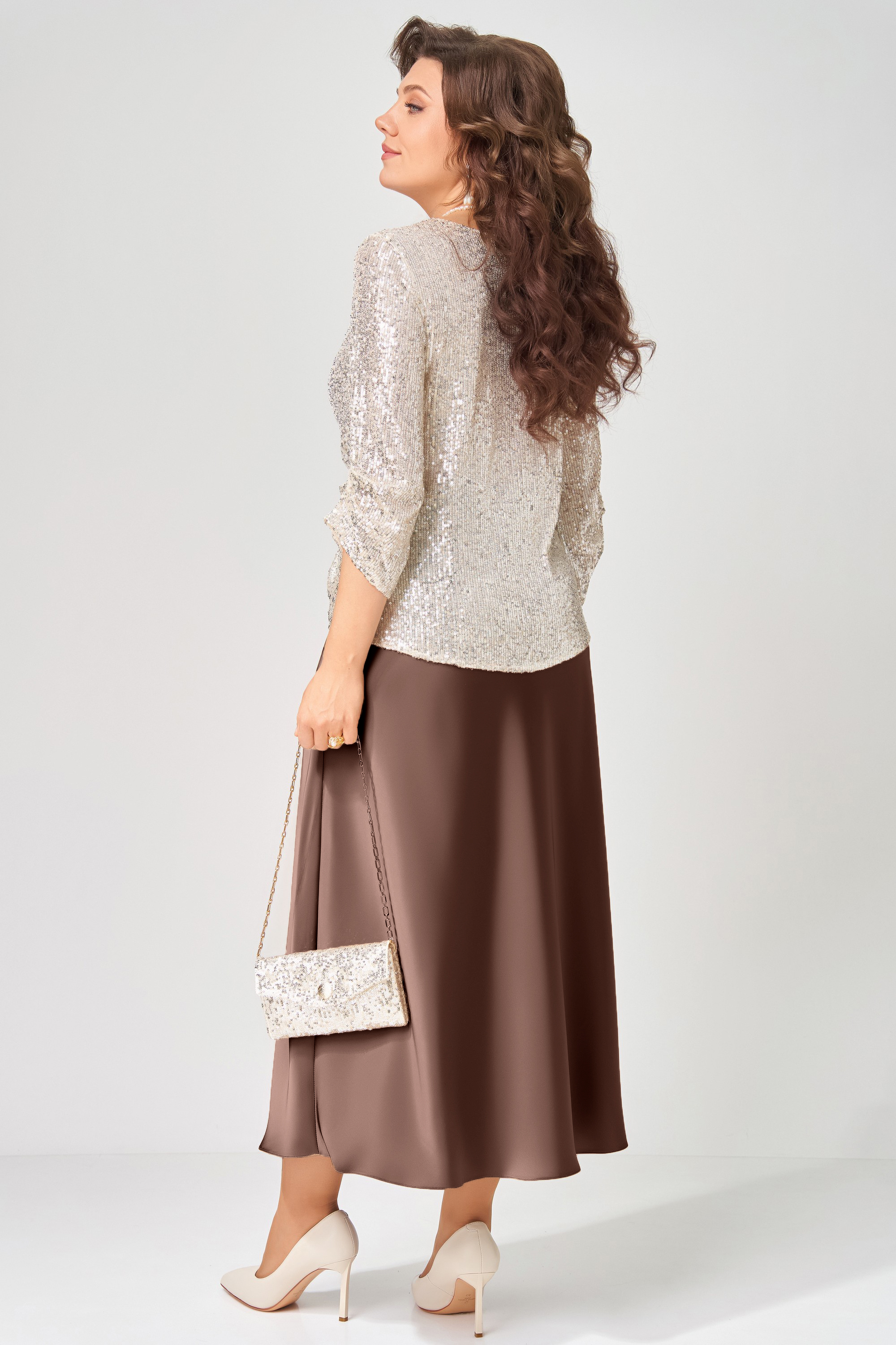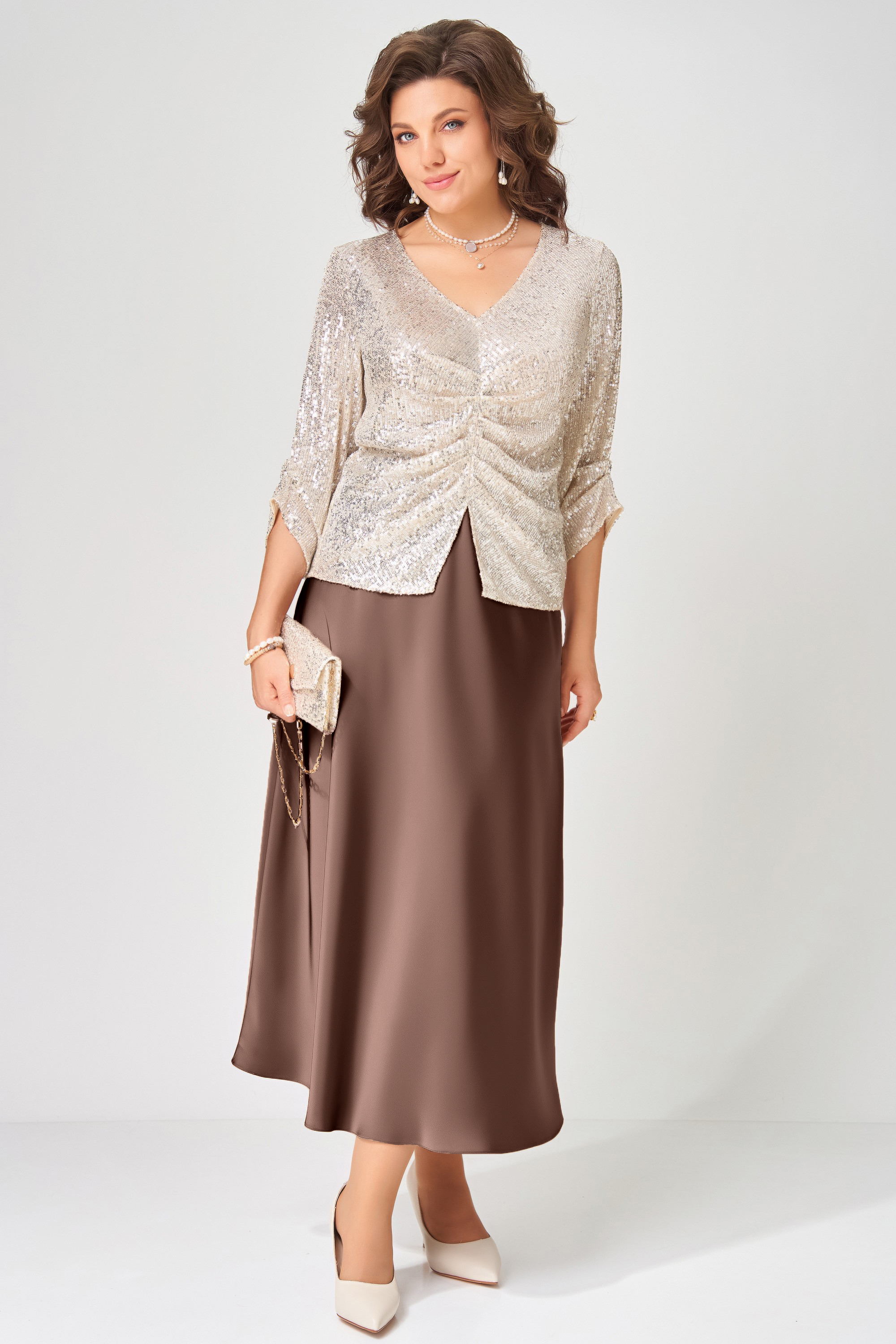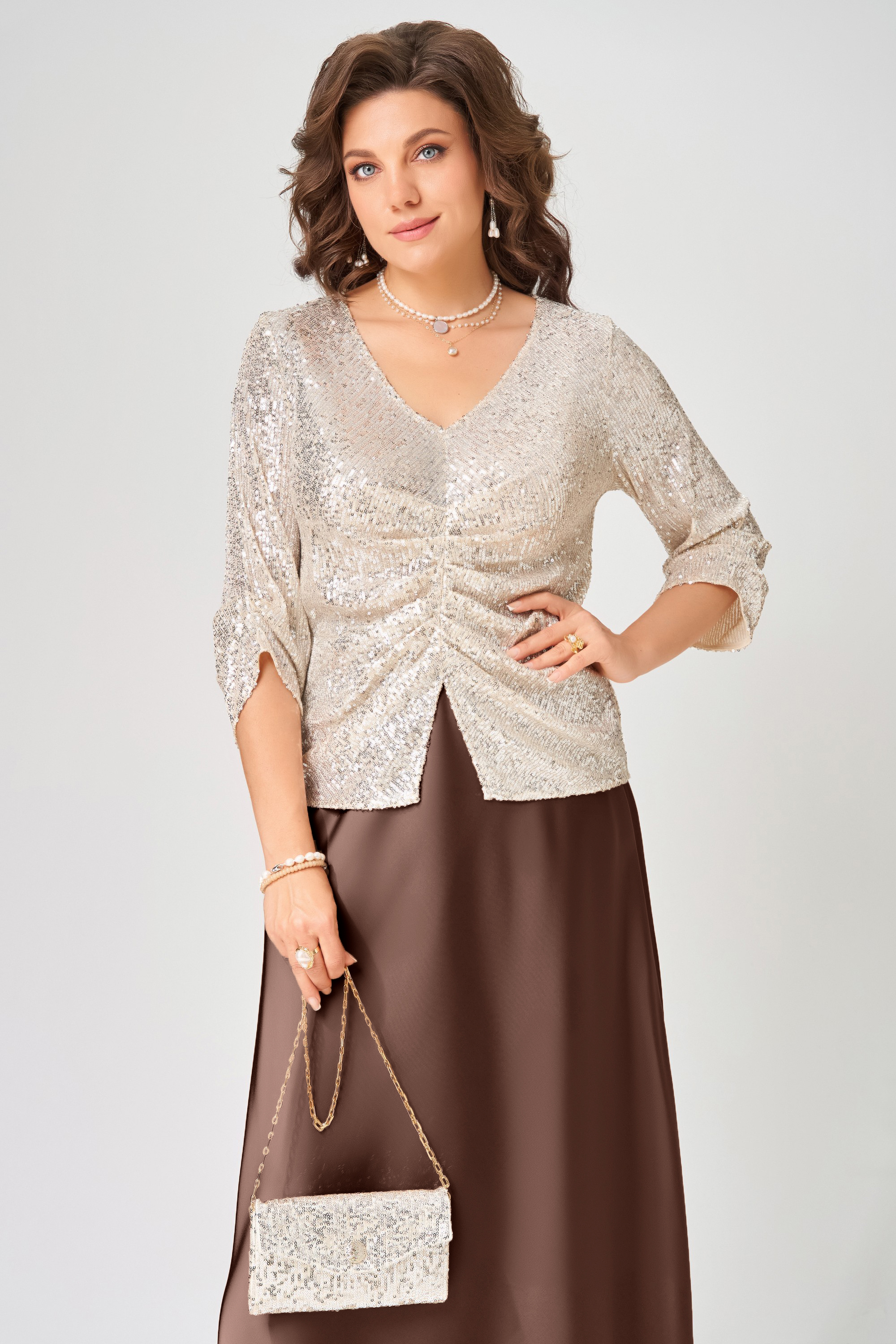 "Зария" — сияющий акцент вашего новогоднего образа. Блузка, расшитая пайетками, ловит свет при каждом движении, а сатиновая юбка добавляет торжественности и утончённости. Идеальный дуэт для праздников, когда хочется блистать. Сумка-клатч "Зария" — это не просто аксессуар, а настоящее украшение вашего образа.