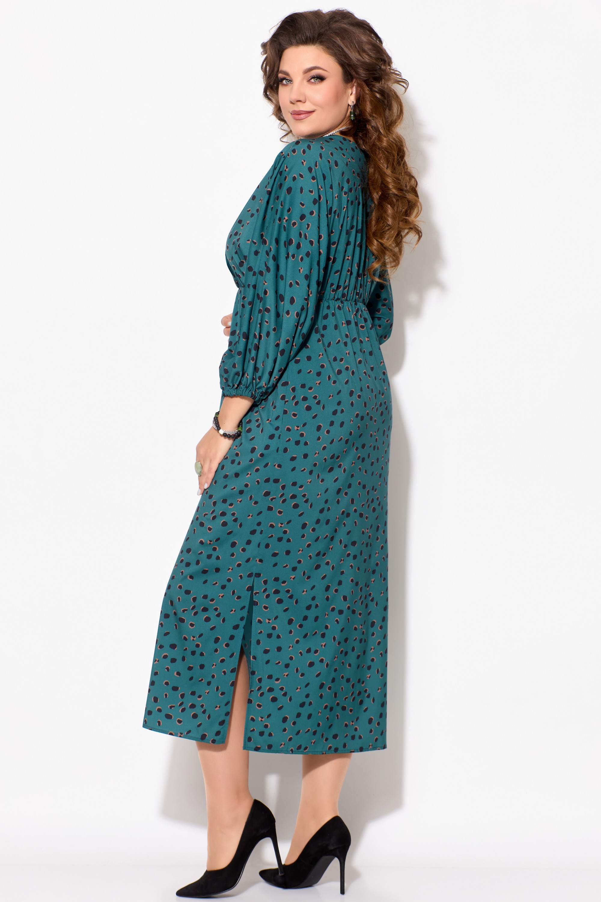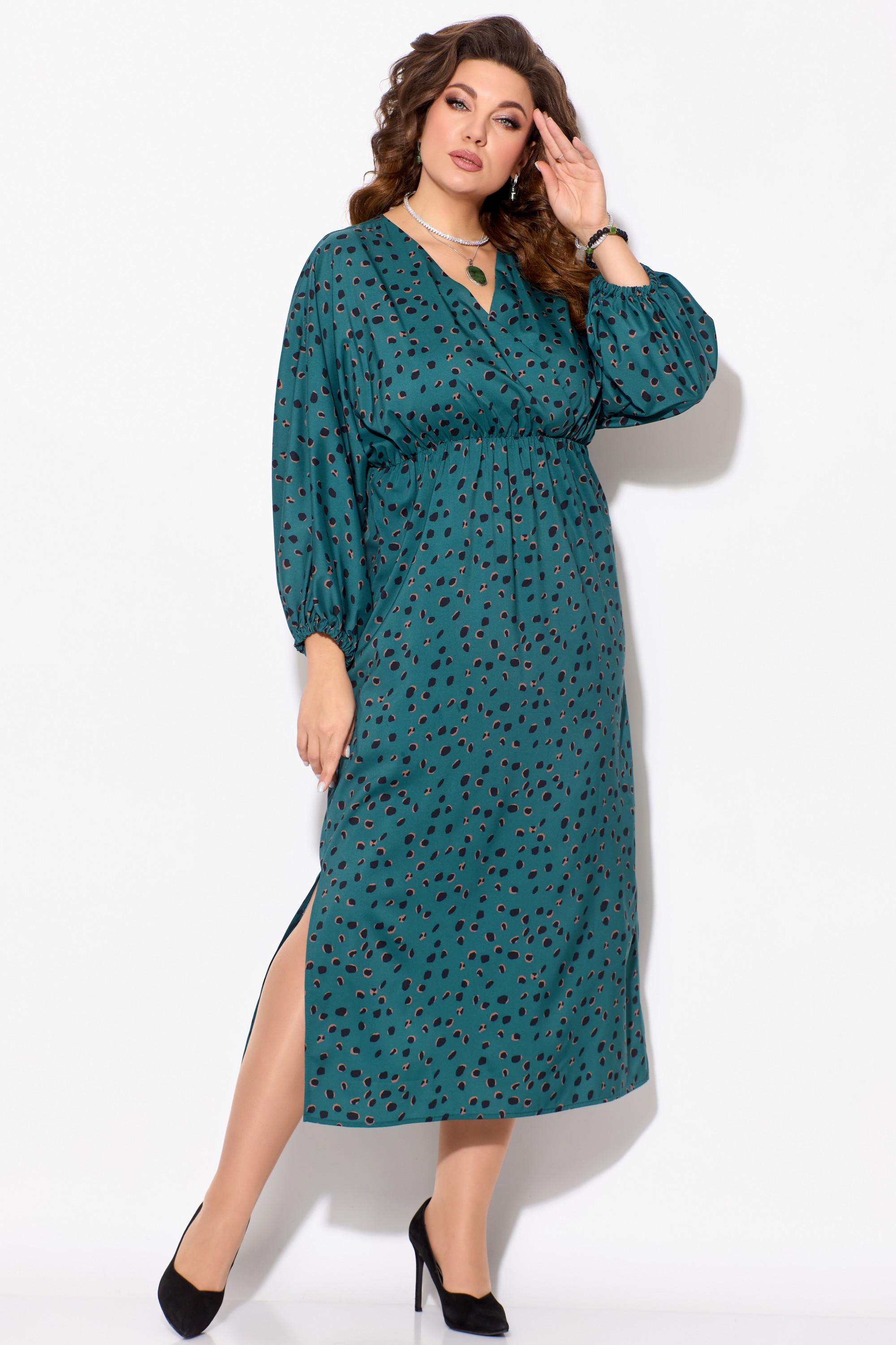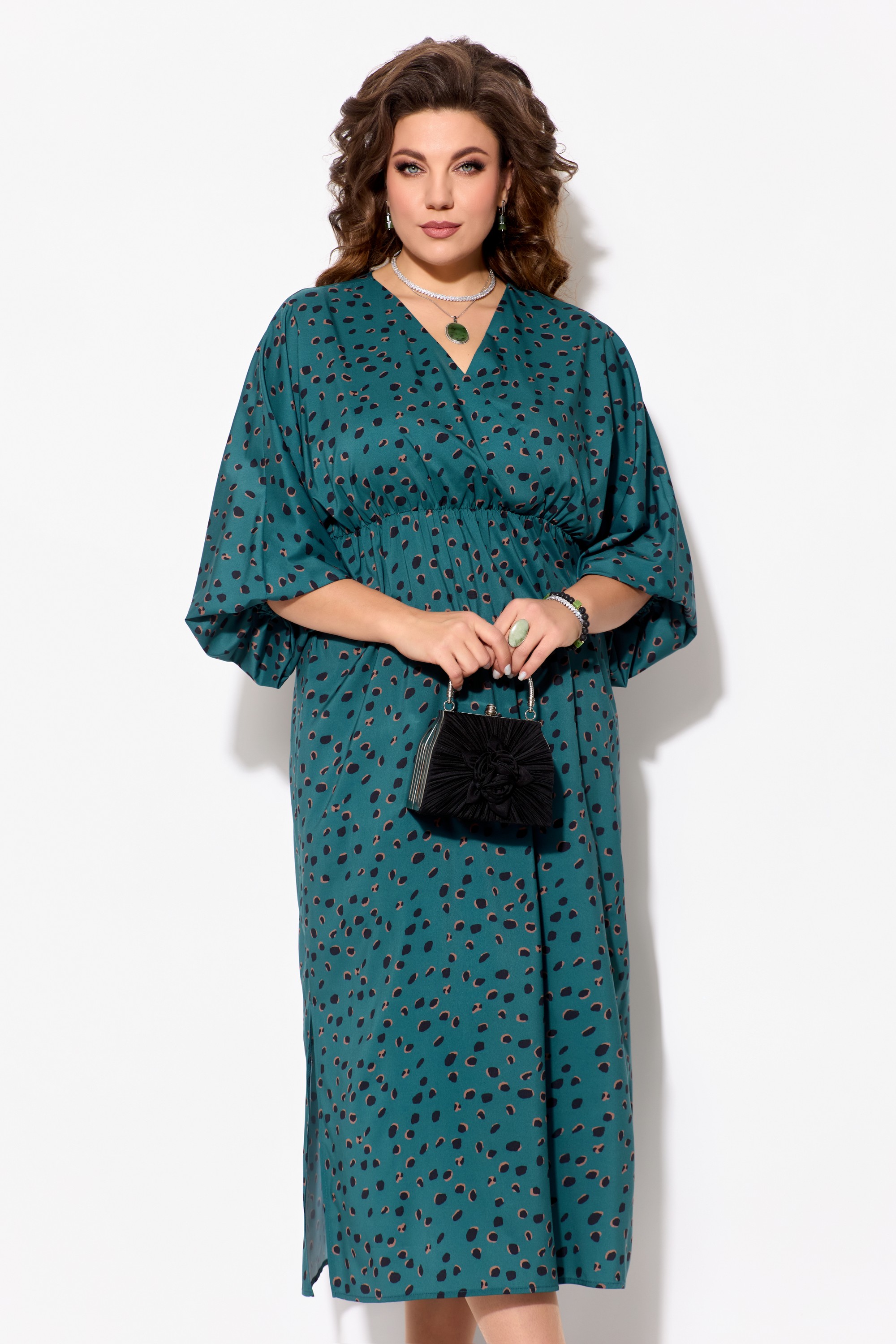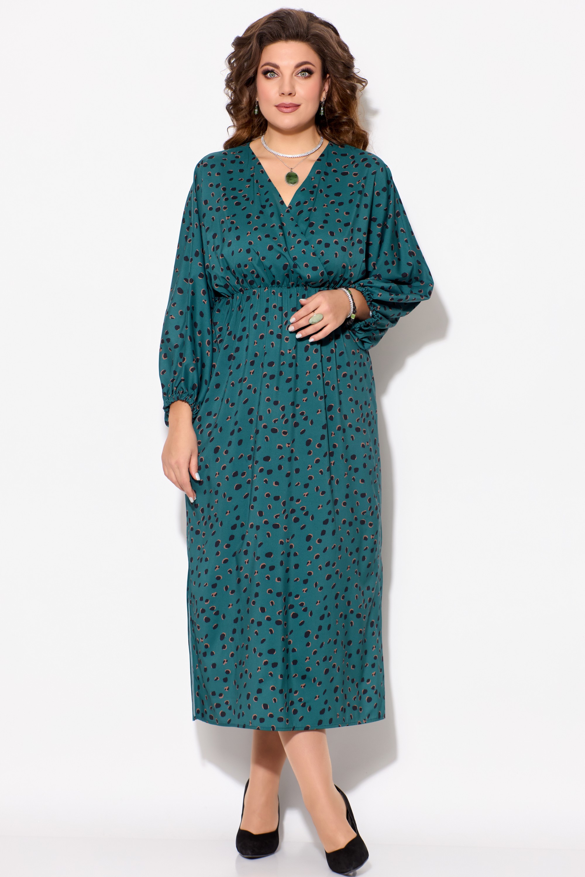 Элегантное женское платье ЛЮТИЦА, длина "миди". Прямого силуэта. Горловина V-образной формы, на "запах". Выше линии талии обработан подрез. Верхняя часть платья собрана на резинку. Рукав цельнокроеный, длинный, расширенный к низу. Низ рукава собран на резинку. В боковых швах обработаны разрезы.