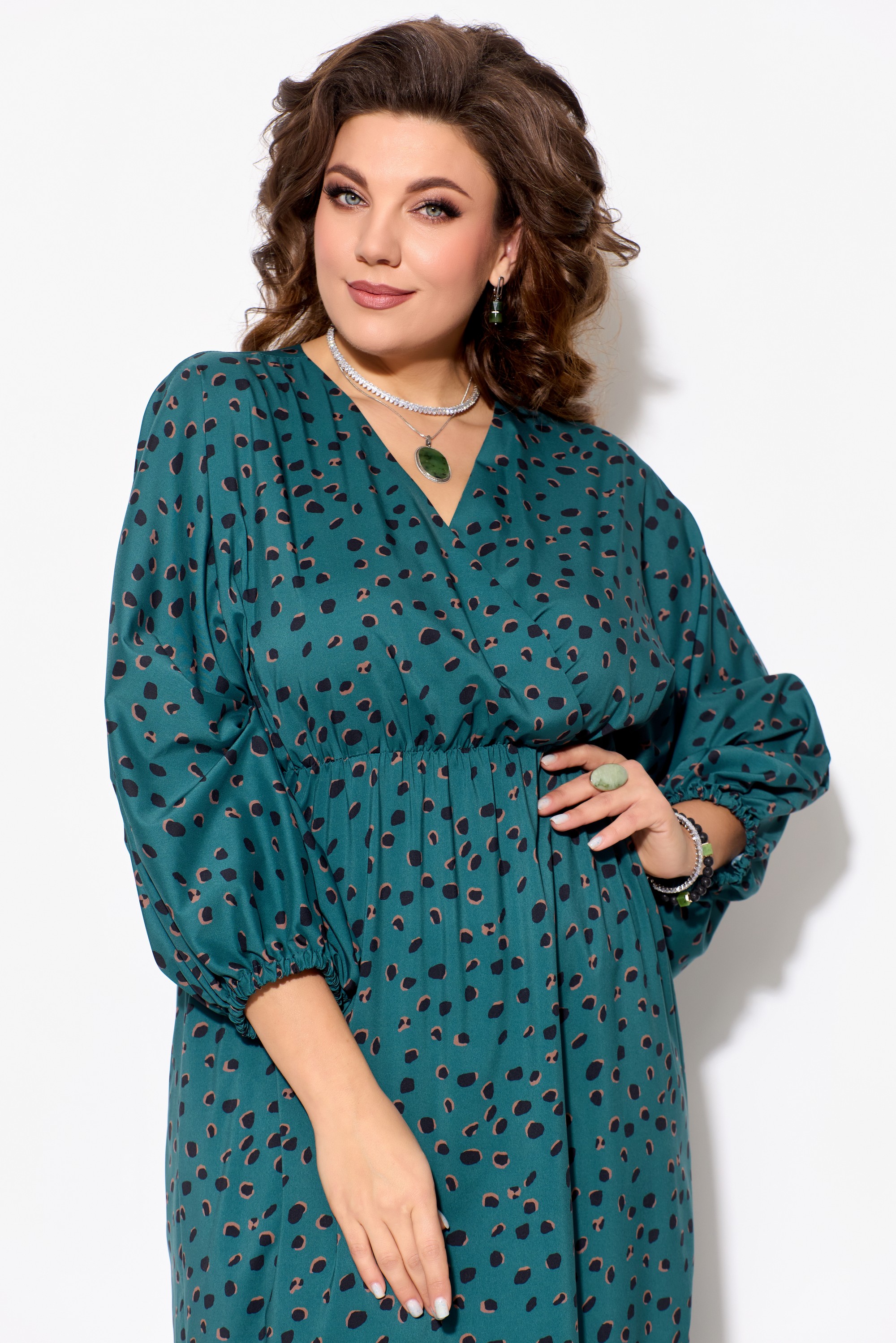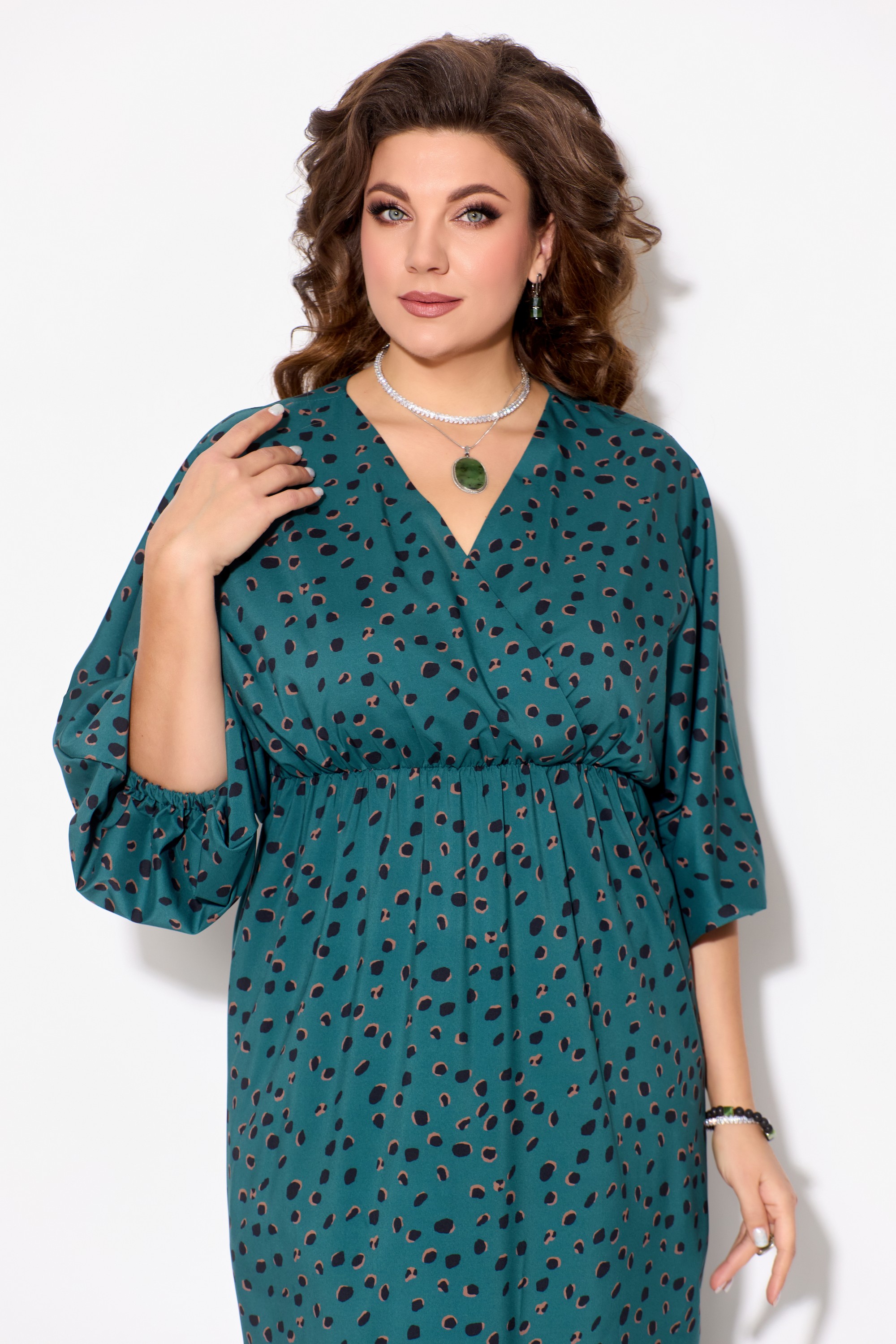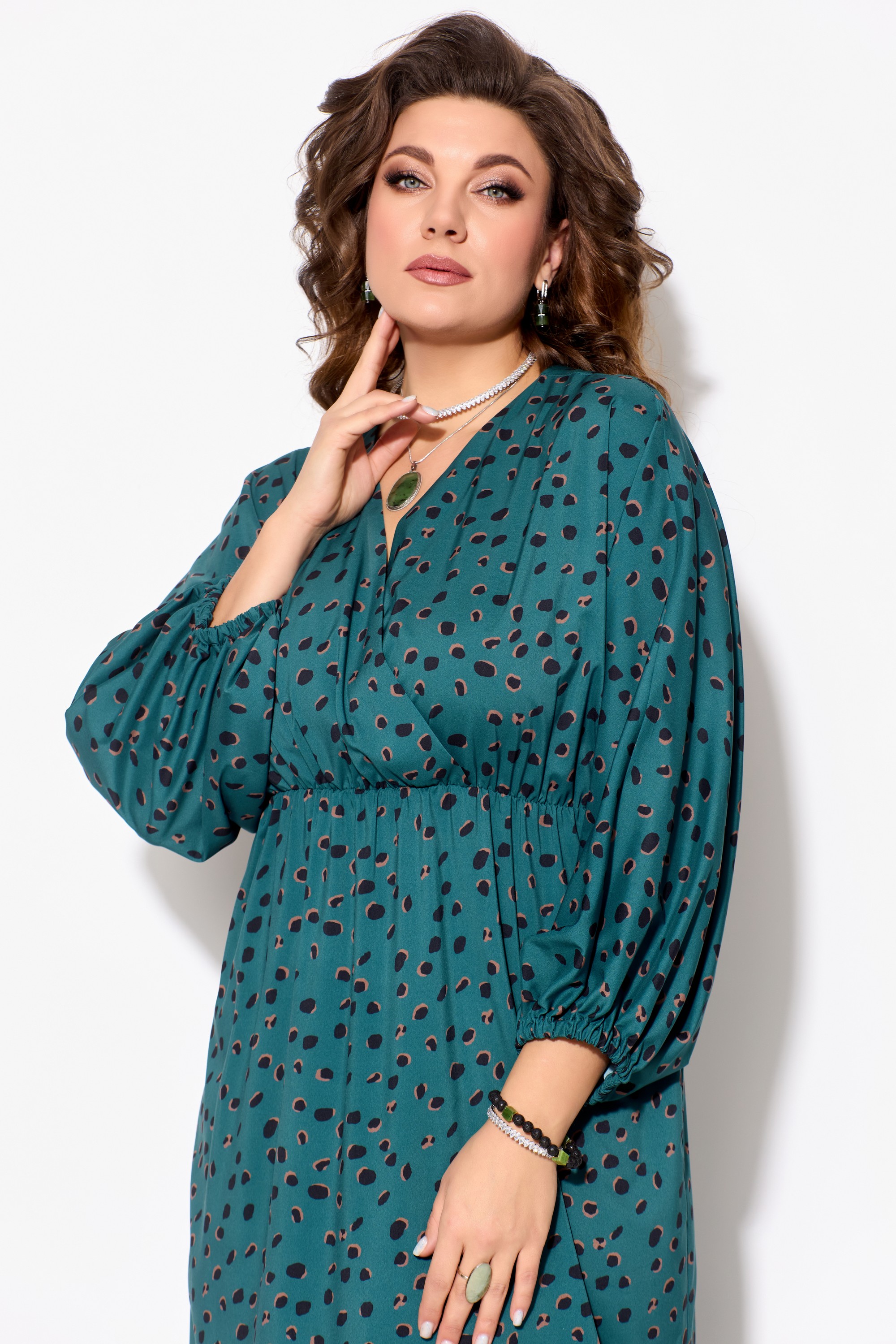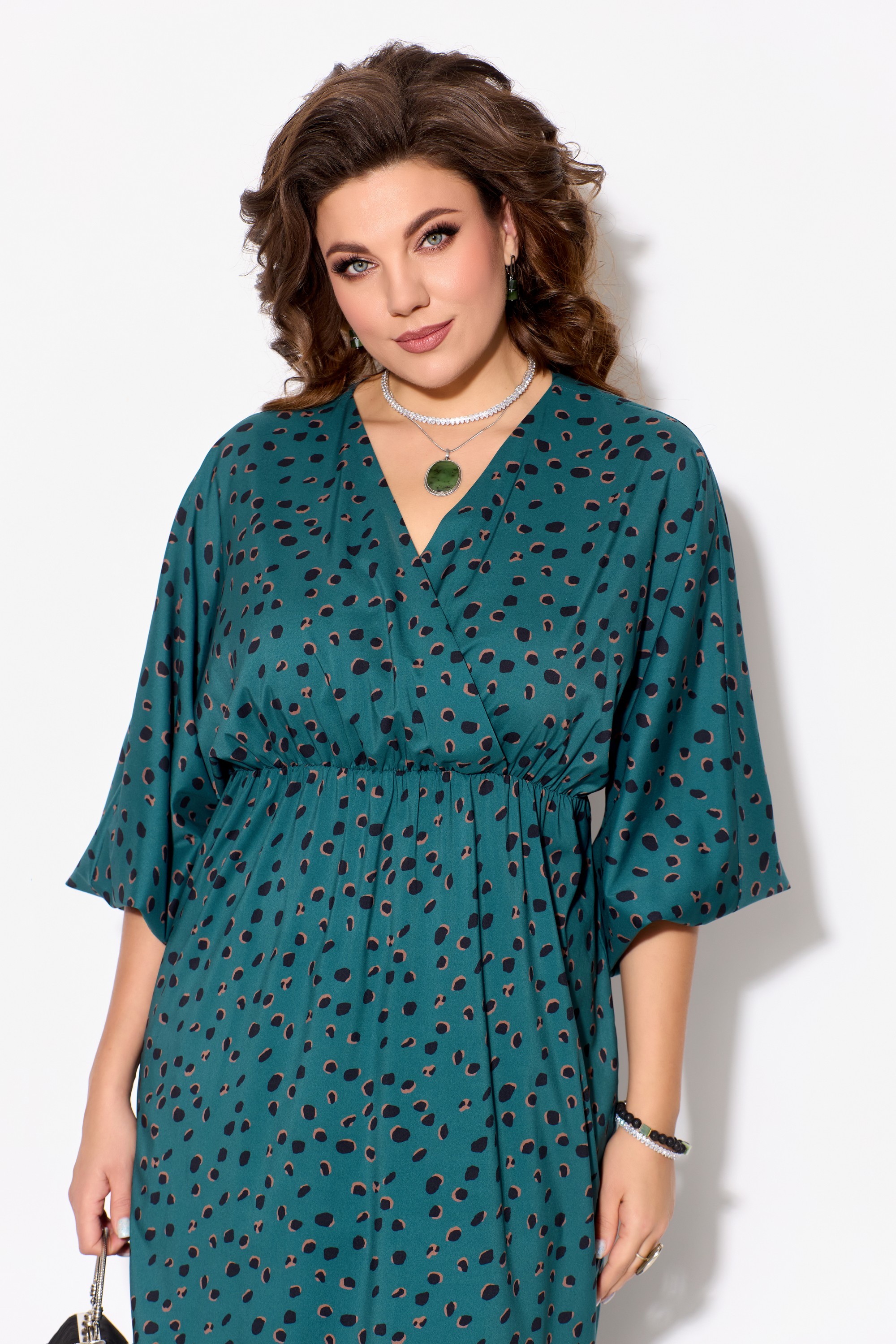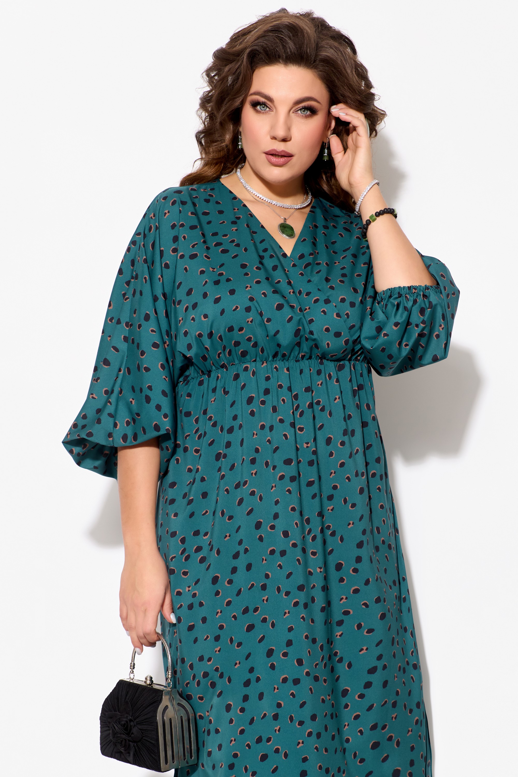 Элегантное женское платье ЛЮТИЦА, длина "миди". Прямого силуэта. Горловина V-образной формы, на "запах". Выше линии талии обработан подрез. Верхняя часть платья собрана на резинку. Рукав цельнокроеный, длинный, расширенный к низу. Низ рукава собран на резинку. В боковых швах обработаны разрезы.