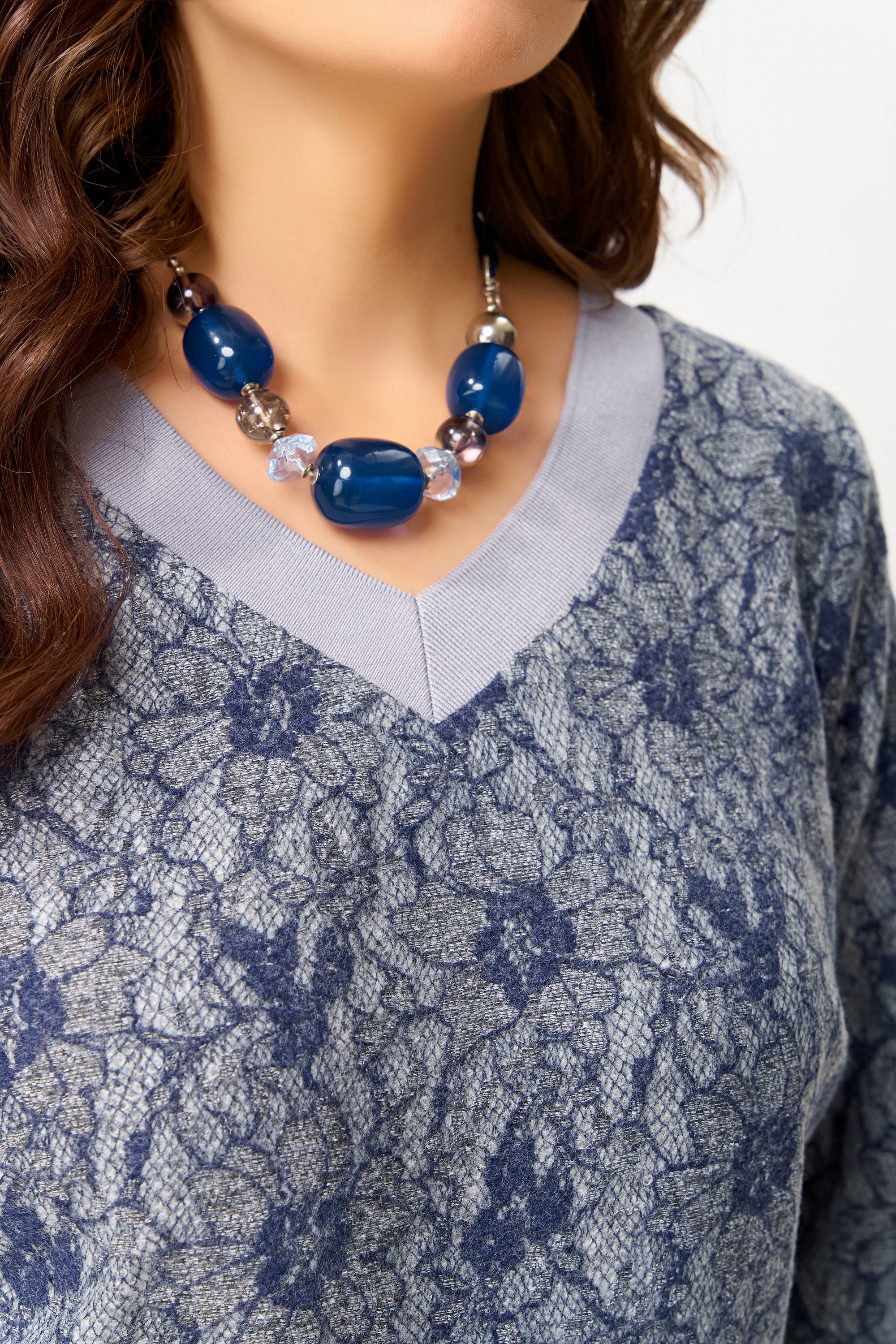 Горловина, обработанная декоративным довязом, напоминает тонкий кант на старинной книге — деталь, которая делает образ завершённым. Низ платья аккуратно подогнут и закрыт, словно граница между реальностью и мечтой, между шагом и полётом.