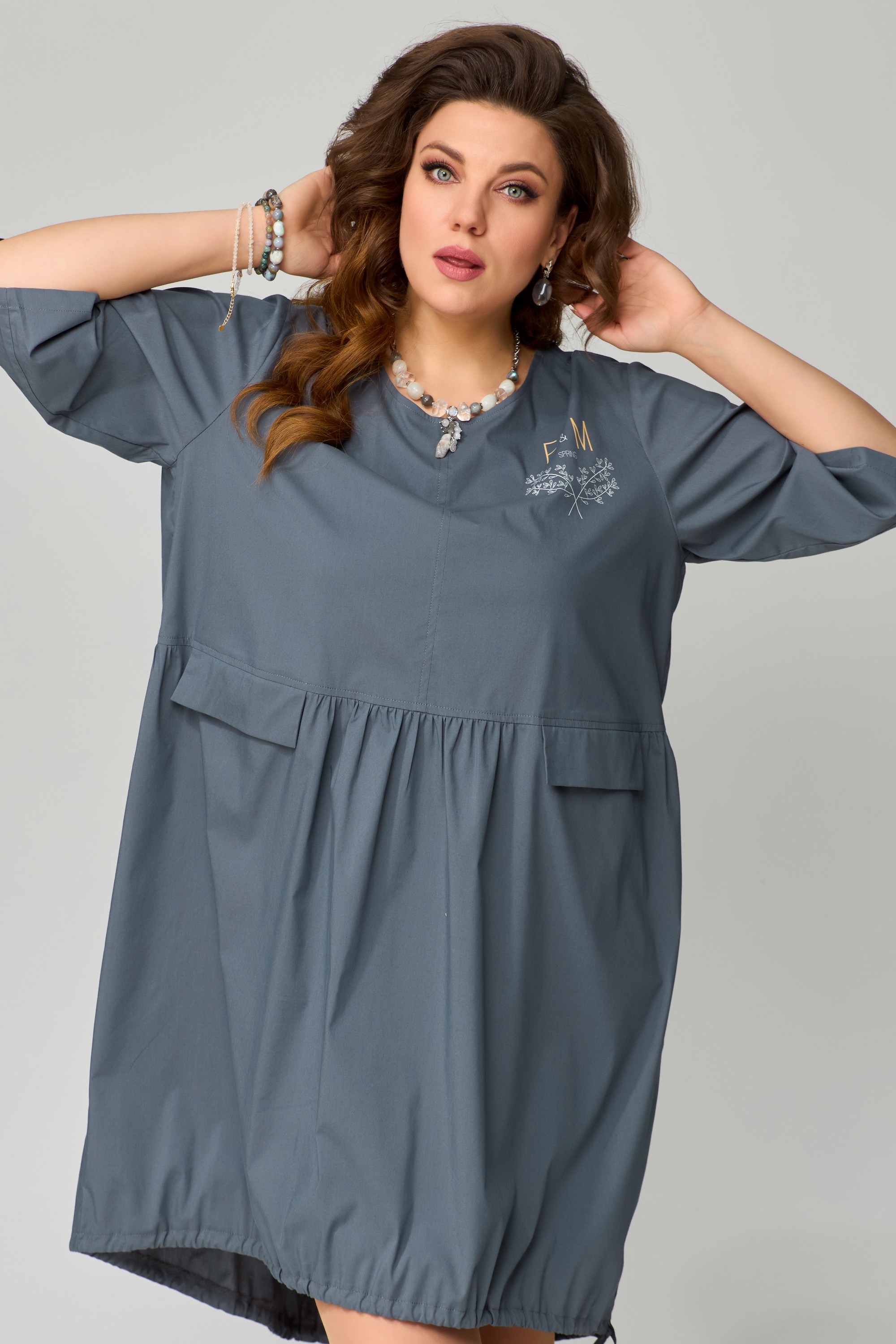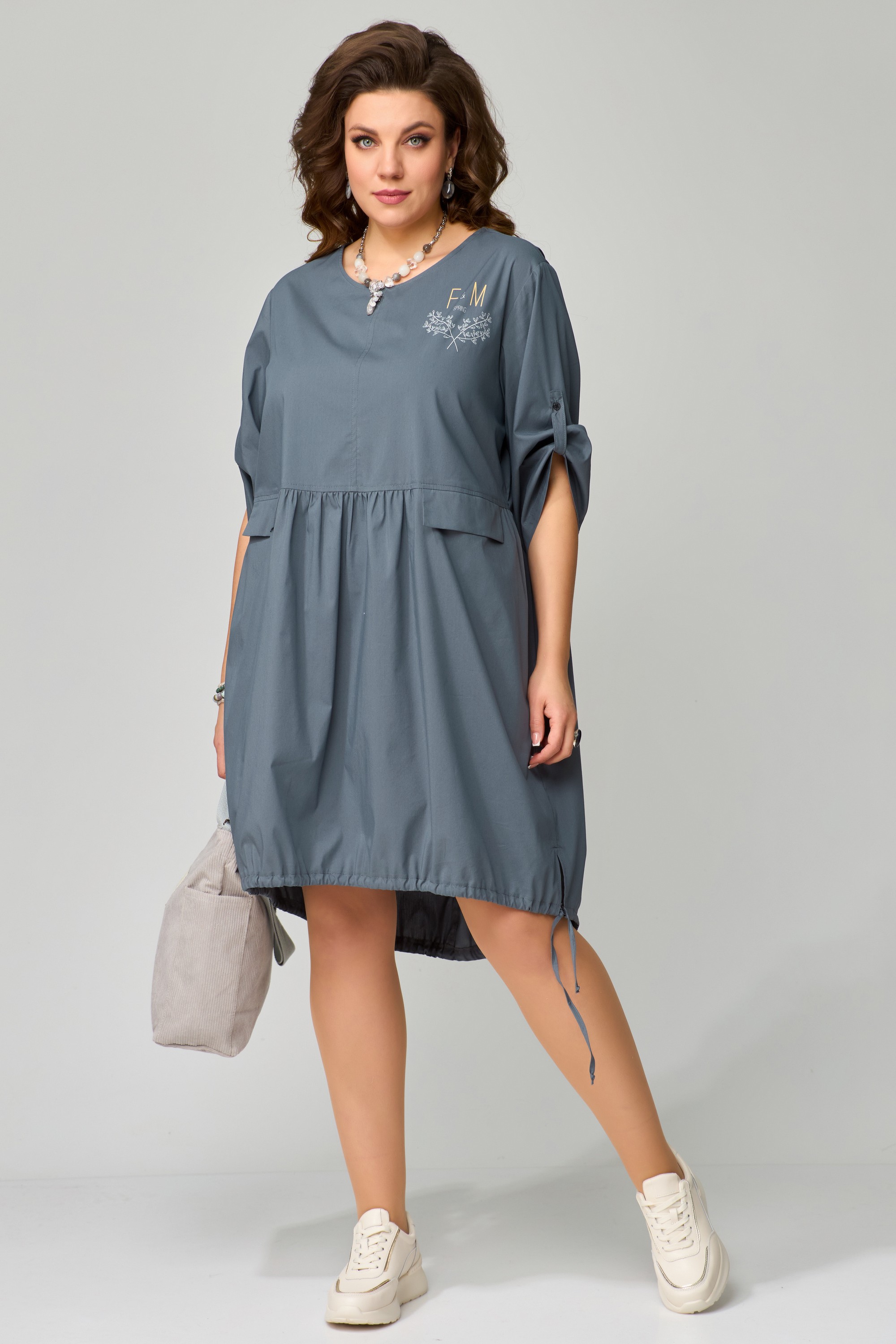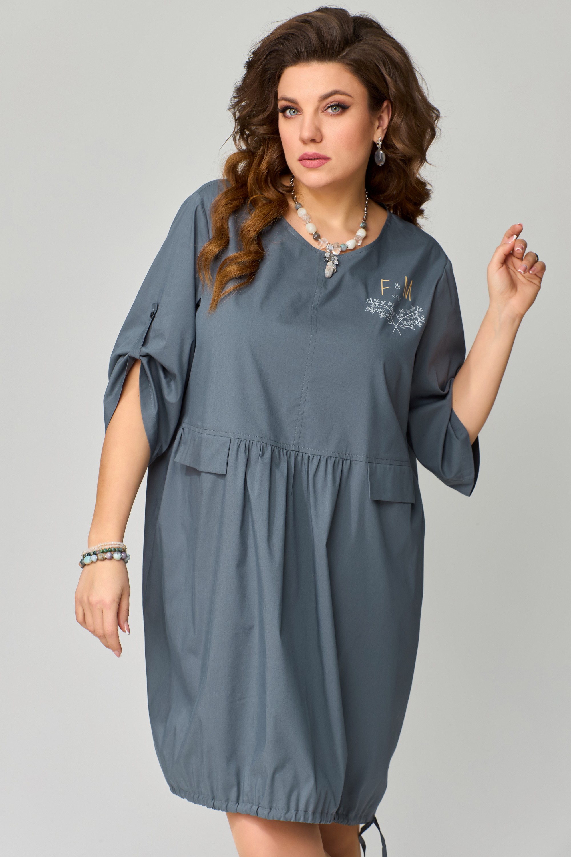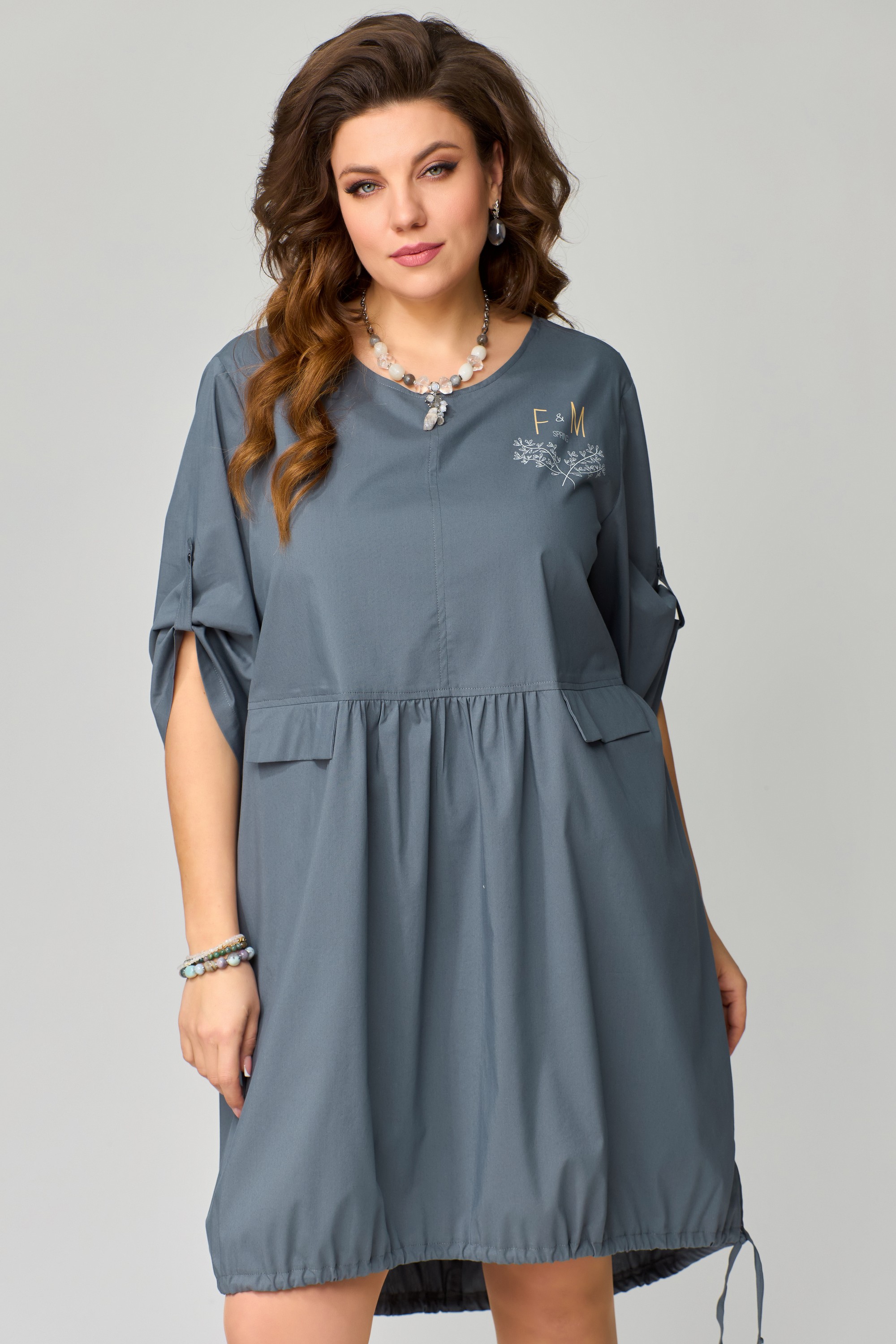 Платье женское "Саедана", оверсайз. Длина по переду выше колена, спинка удлиненная. Низ собран на кулису. По талии подрез со сборкой, в котором обработаны карманы с клапанами. Рукав втачной, длина 3/4. Длина рукава регулируется патой. Линия плеча спущена. Горловина круглая, обработана притачной бейлой. Украшение в комплект не входит.