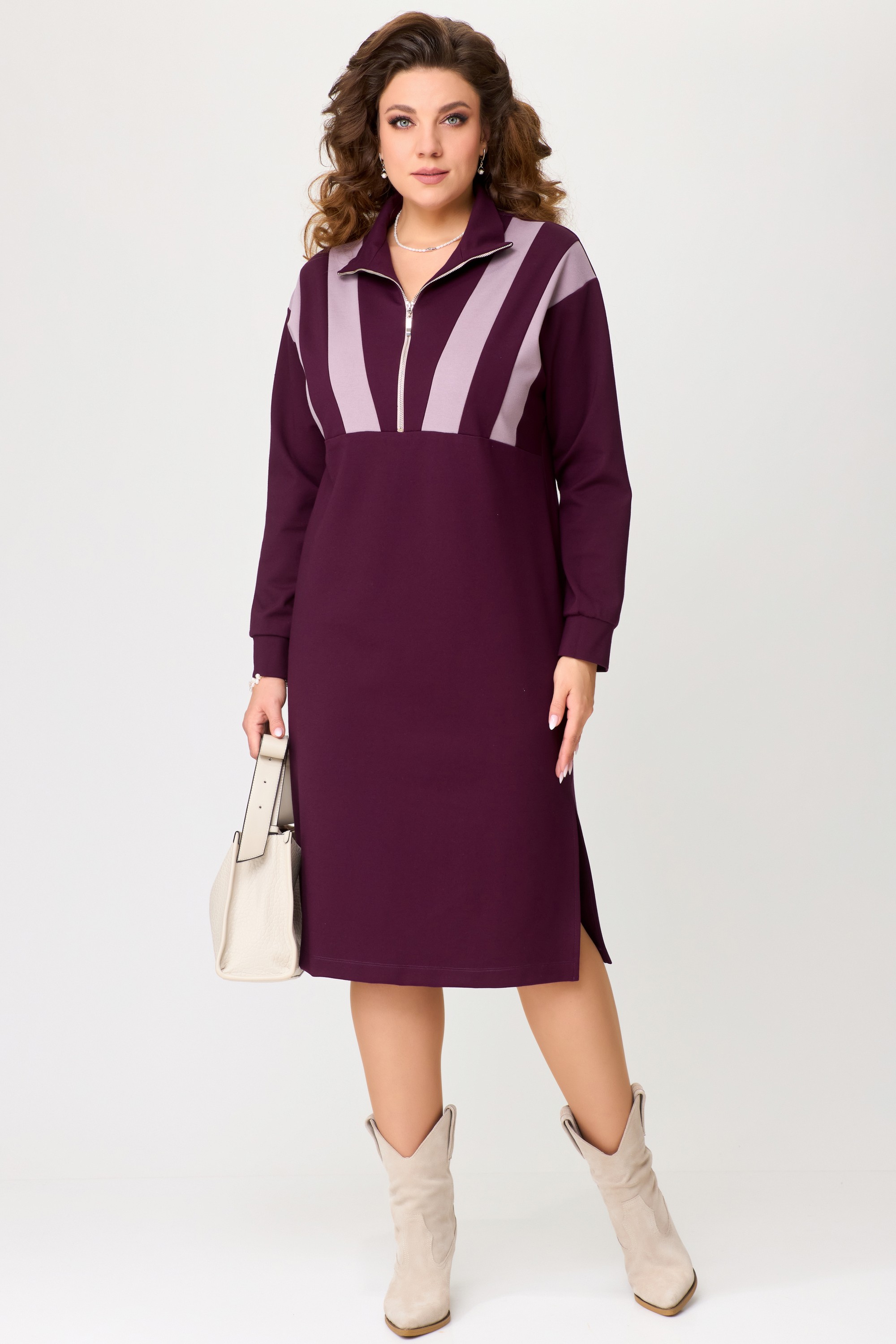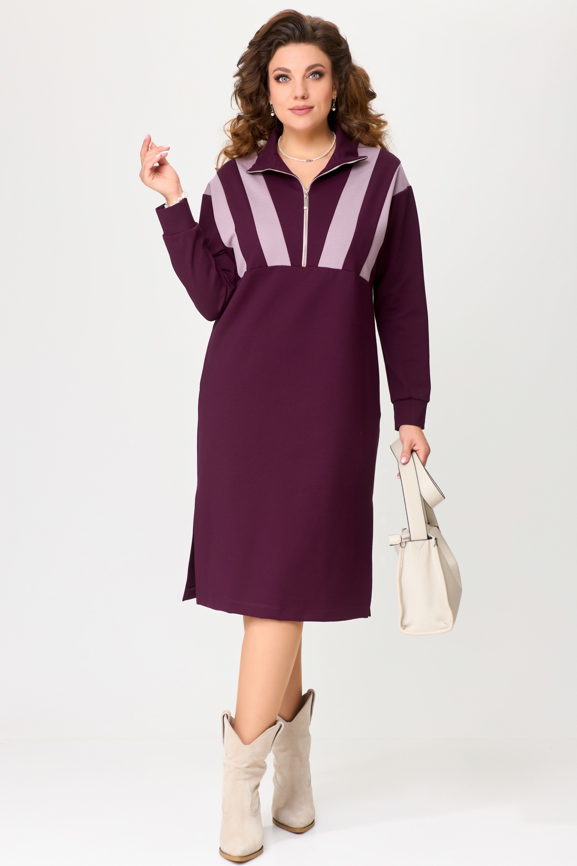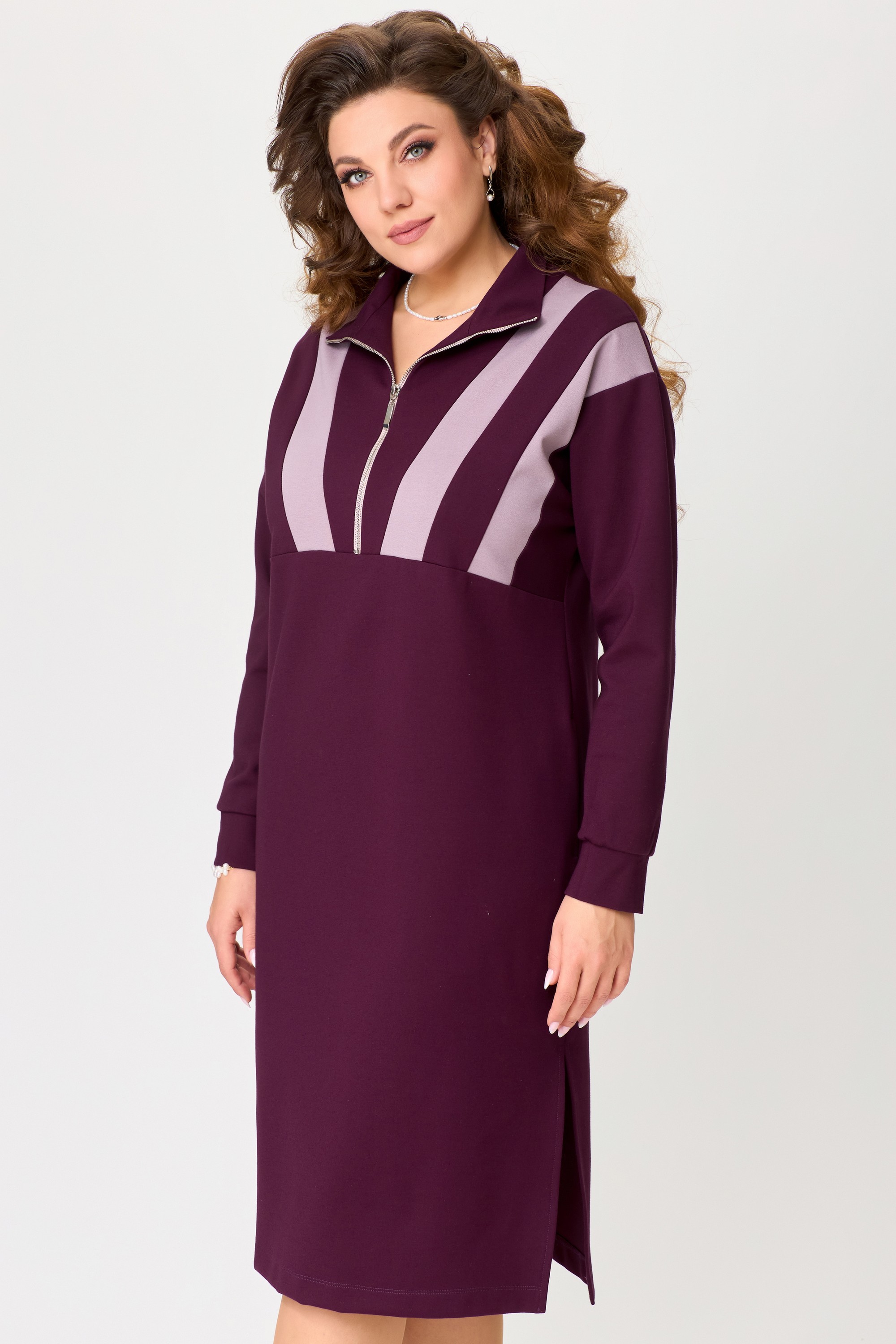 Женское трикотажное платье "Ванесса" выполнено из высококачественного турецкого трикотажного полотна. Ткань не скатывается, очень практичная в носке, мягкая и эластичная. Платье из трикотажа имеет хороший стрейч, что делает очень удобным и стильным в спорт-шик стиле. Платье прямого силуэта, со спущенным рукавом, по полочке нижу груди декоративный подрез. В платье застежка на молнию и на груди декоративные трикотажные вставки. Воротник - стойка, по низу рукава манжет, в боковых швах разрезы, низ изделия обработан на распошивалку. Элегантное трикотажное платье отлично подойдет для выхода в город, на прогулку и для повседневной носки дома.