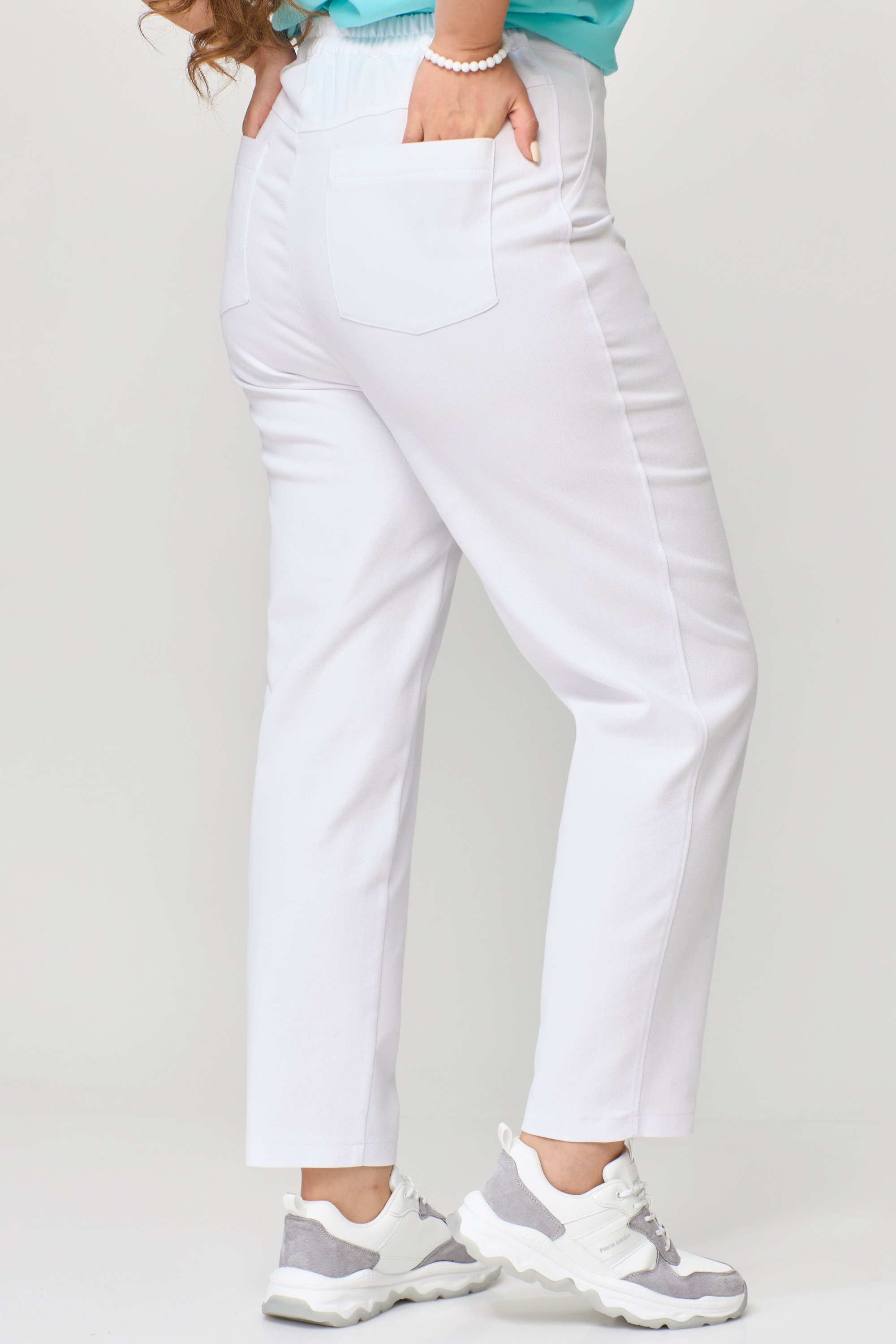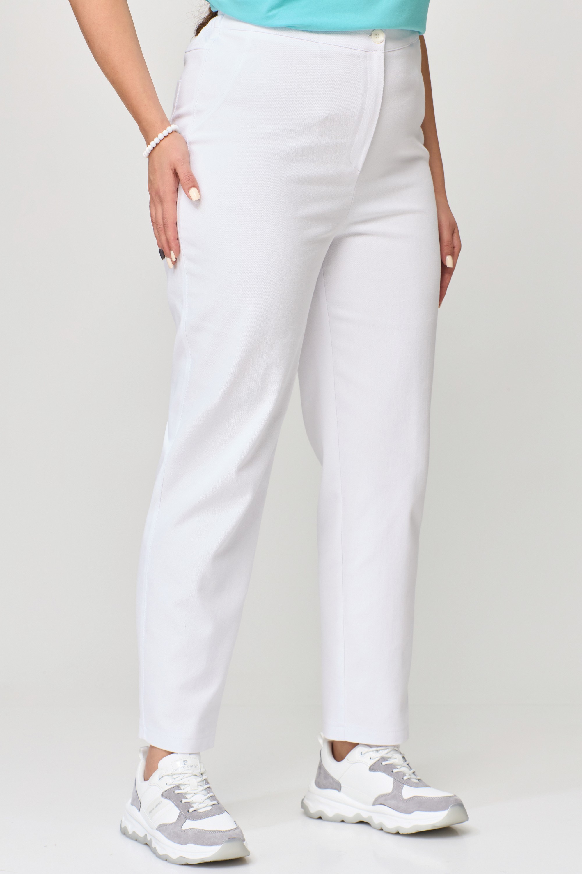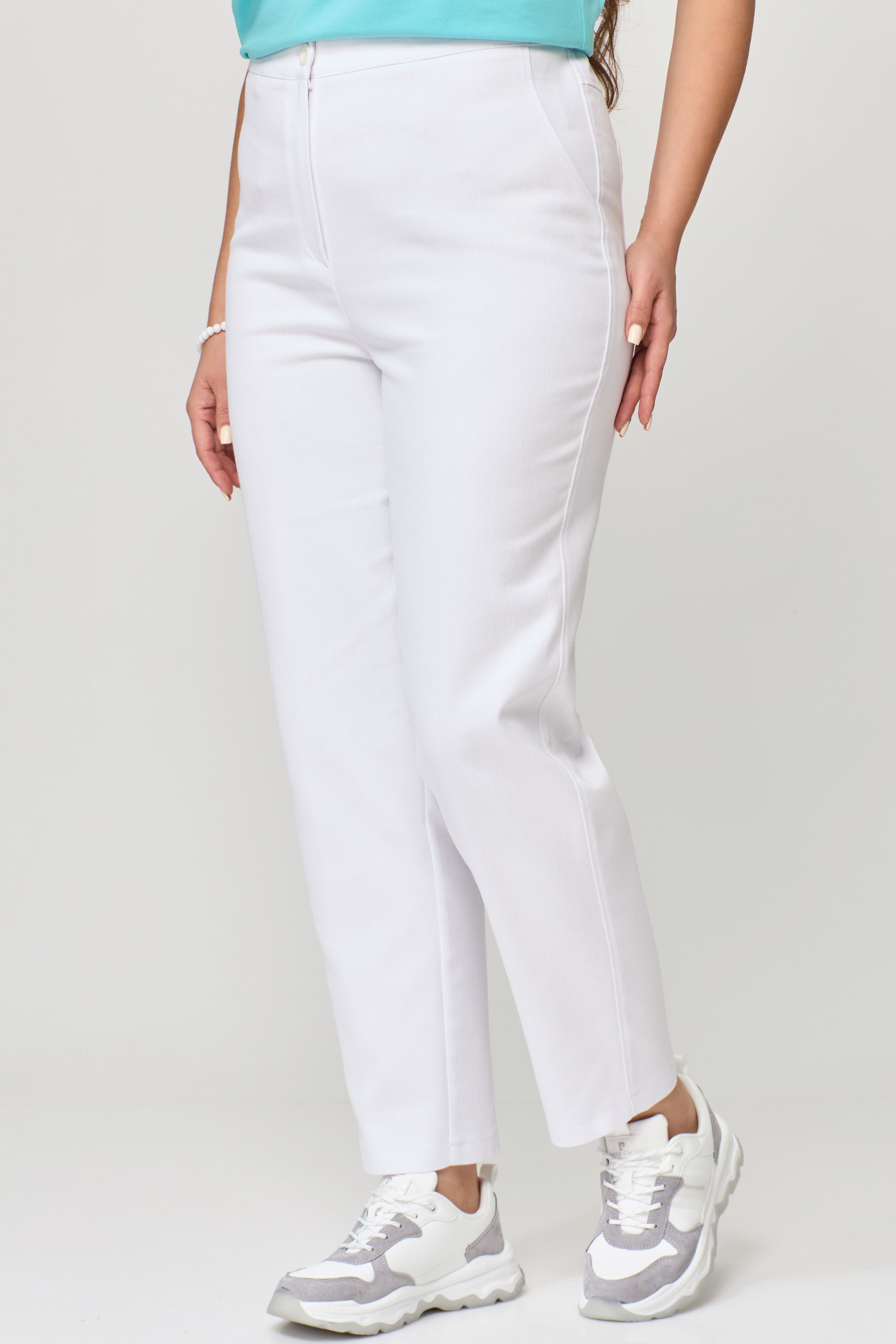 Женские брюки выполнены из качественной текстильной ткани с добавлением шерсти. Брюки прямого силуэта с застежкой на молнию и пуговицу. По переду брюк карманы, верх брюк обработан поясом, по спинке резинка. Низ обработан в подгибку. <br />