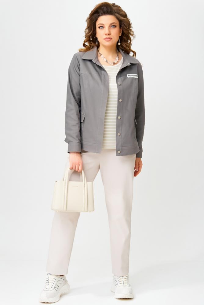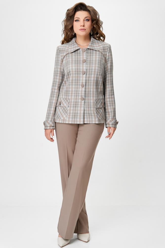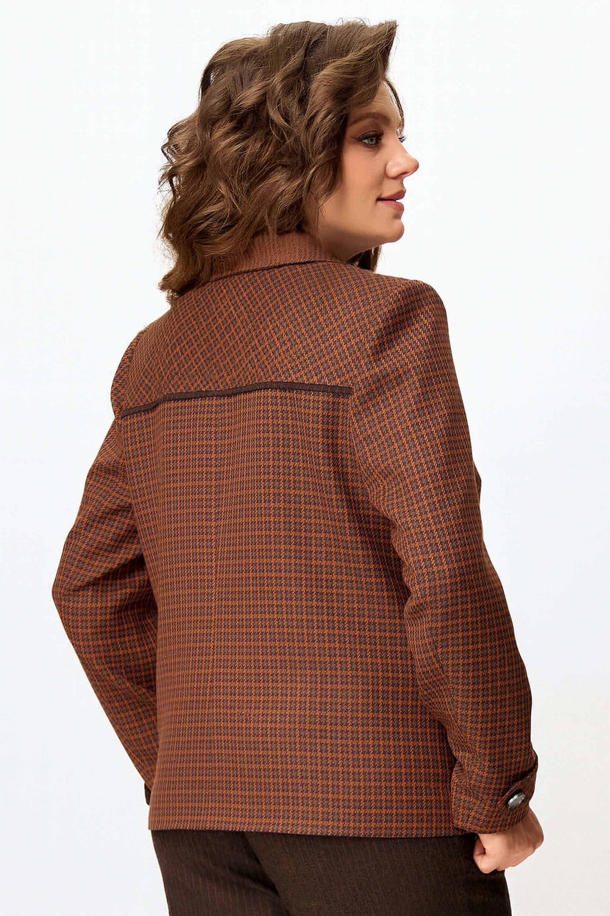 Женский стильный жакет "Венциана" из клетчатого текстиля, полностью на подкладке, с элегантным полуприлегающим силуэтом. Его дизайн отличает однобортная застежка на пуговицы и классический отложной воротник. Передняя часть изделия искусно оформлена нагрудными вытачками и отрезными бочками, а верхняя часть полочки украшена кокеткой с вшитым декоративным кантом. Функциональные накладные карманы с клапанами также застегиваются на пуговицы. Спинка имеет средний шов и отрезную кокетку сверху, также с декоративным кантом. Двухшовные втачные рукава завершаются декоративными патами на пуговицах.