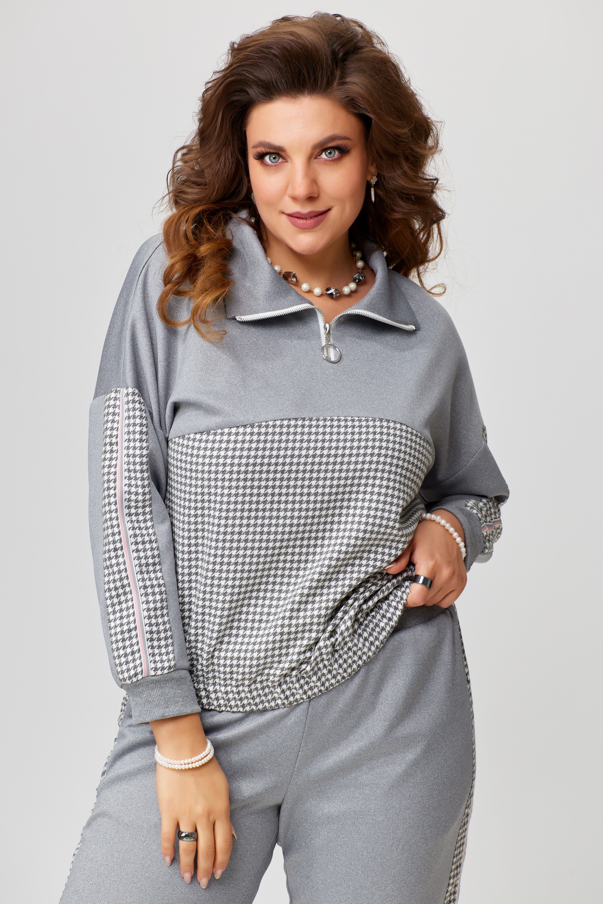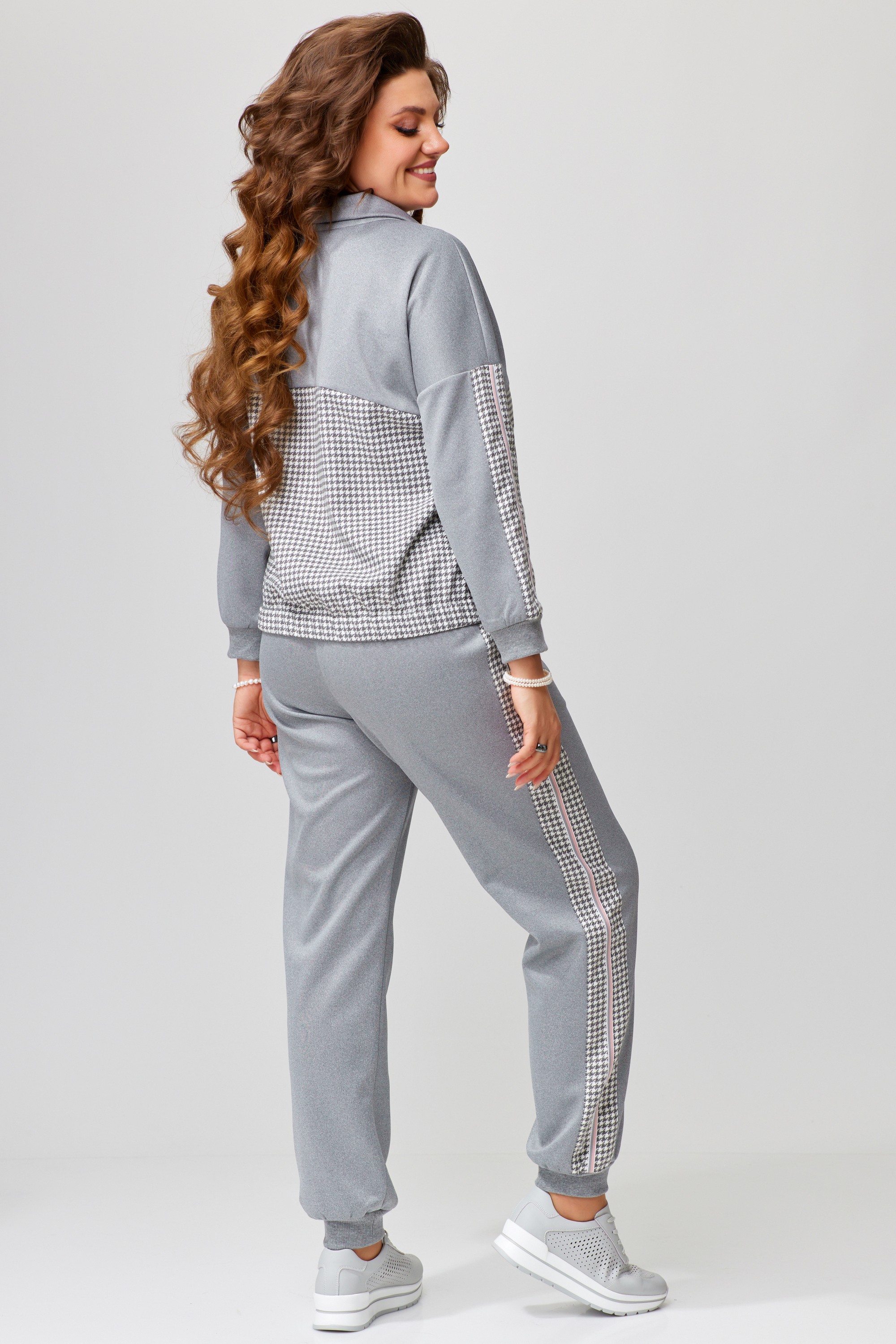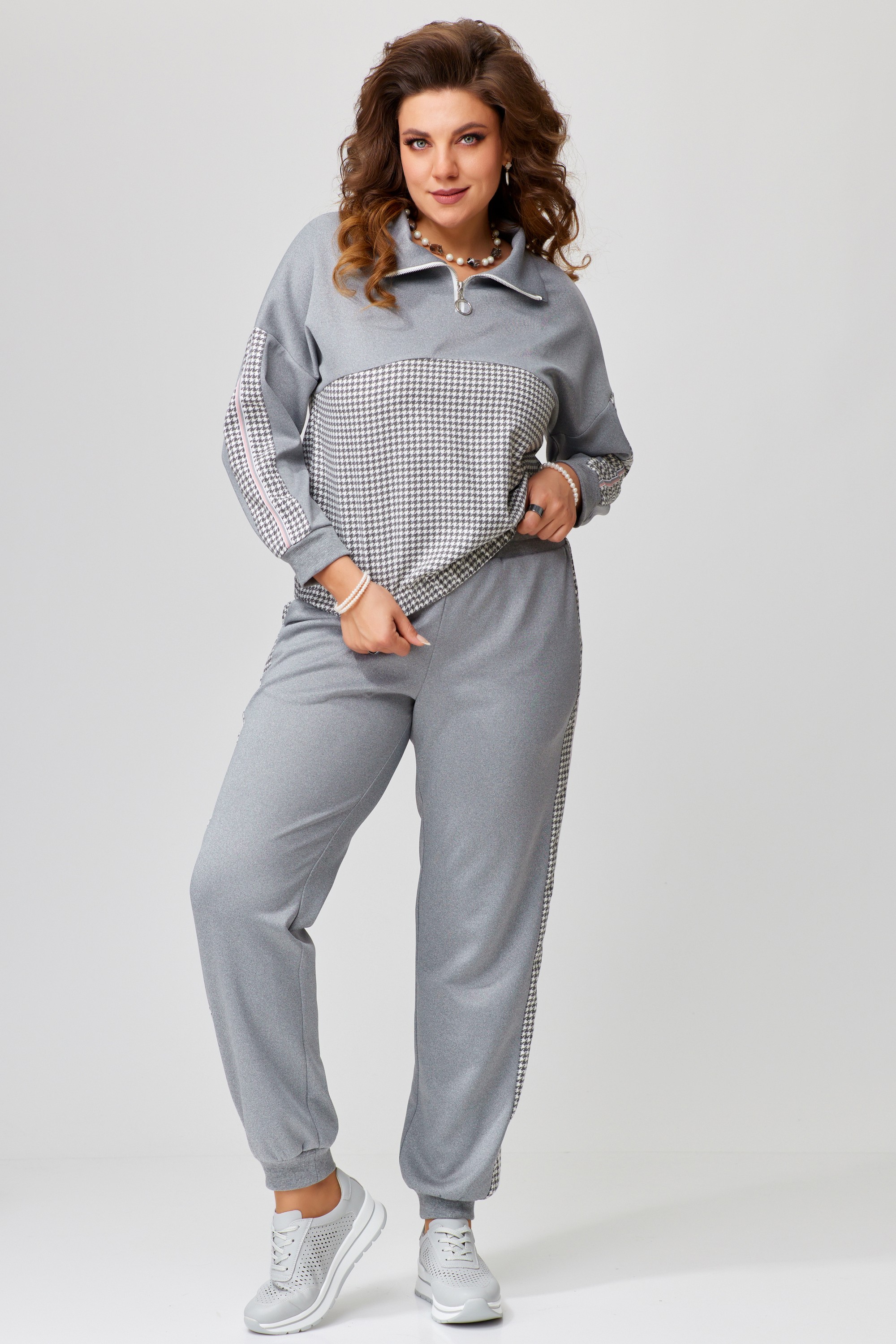 Женский спортивный комплект "Васса" состоит из джемпера и спортивных брюк. Джемпер без подкладки, свободного покроя со спущенным рукавом. Воротник-стойка с застежкой на молнии, по спинке и полочке кокетка из трикотажной ткани, подрезы по спинке и полочке из текстильной ткани с рисунком гусиной лапки. По рукаву вставка из текстильной ткани с настроченной декоративной тесьмой. По низу джемпера резинка, по низу рукава - манжет.