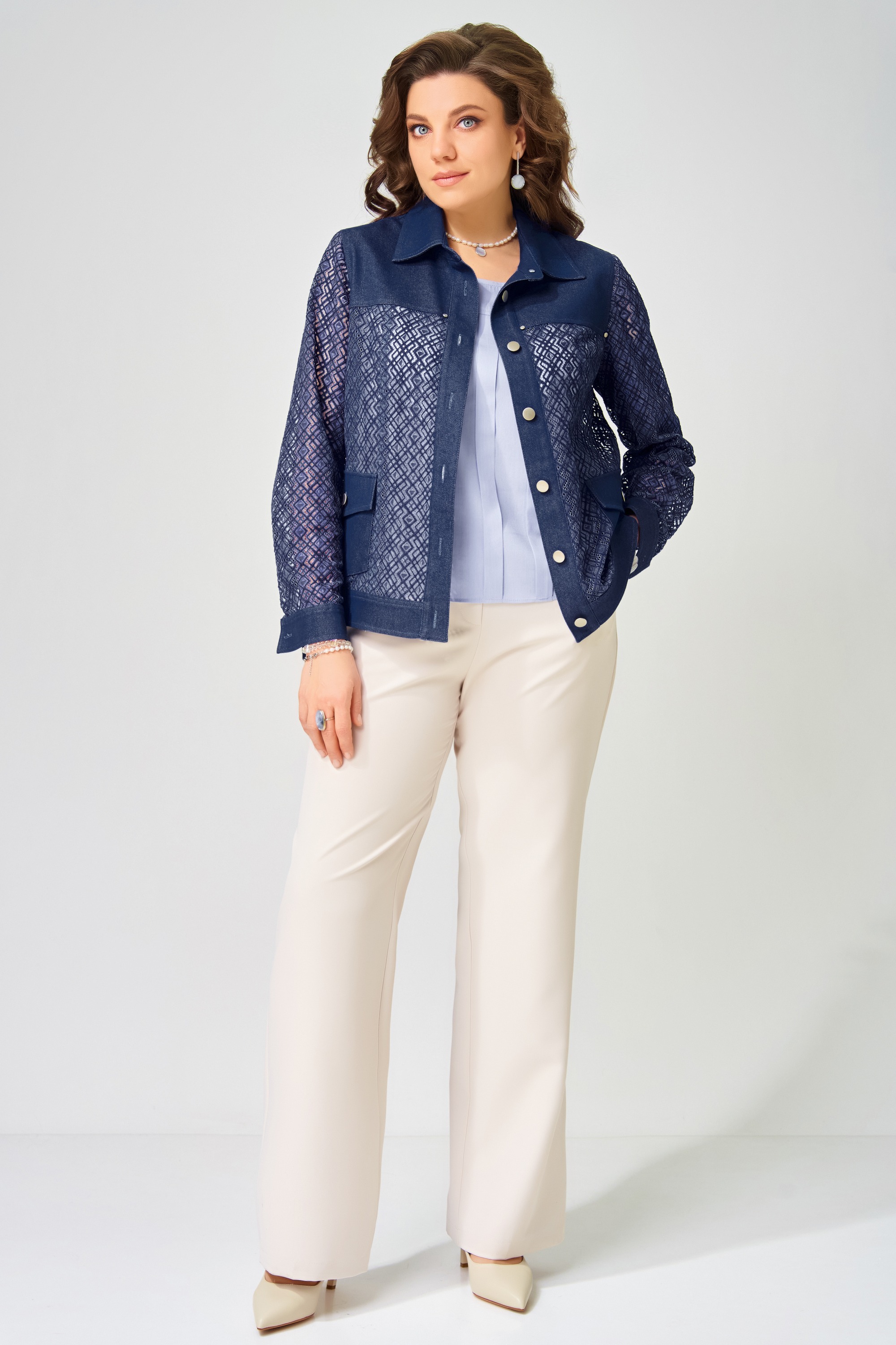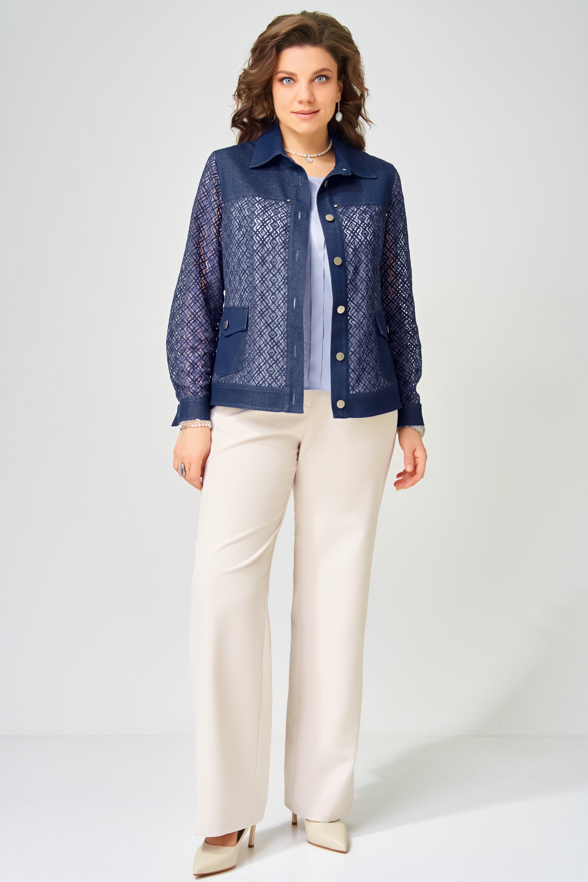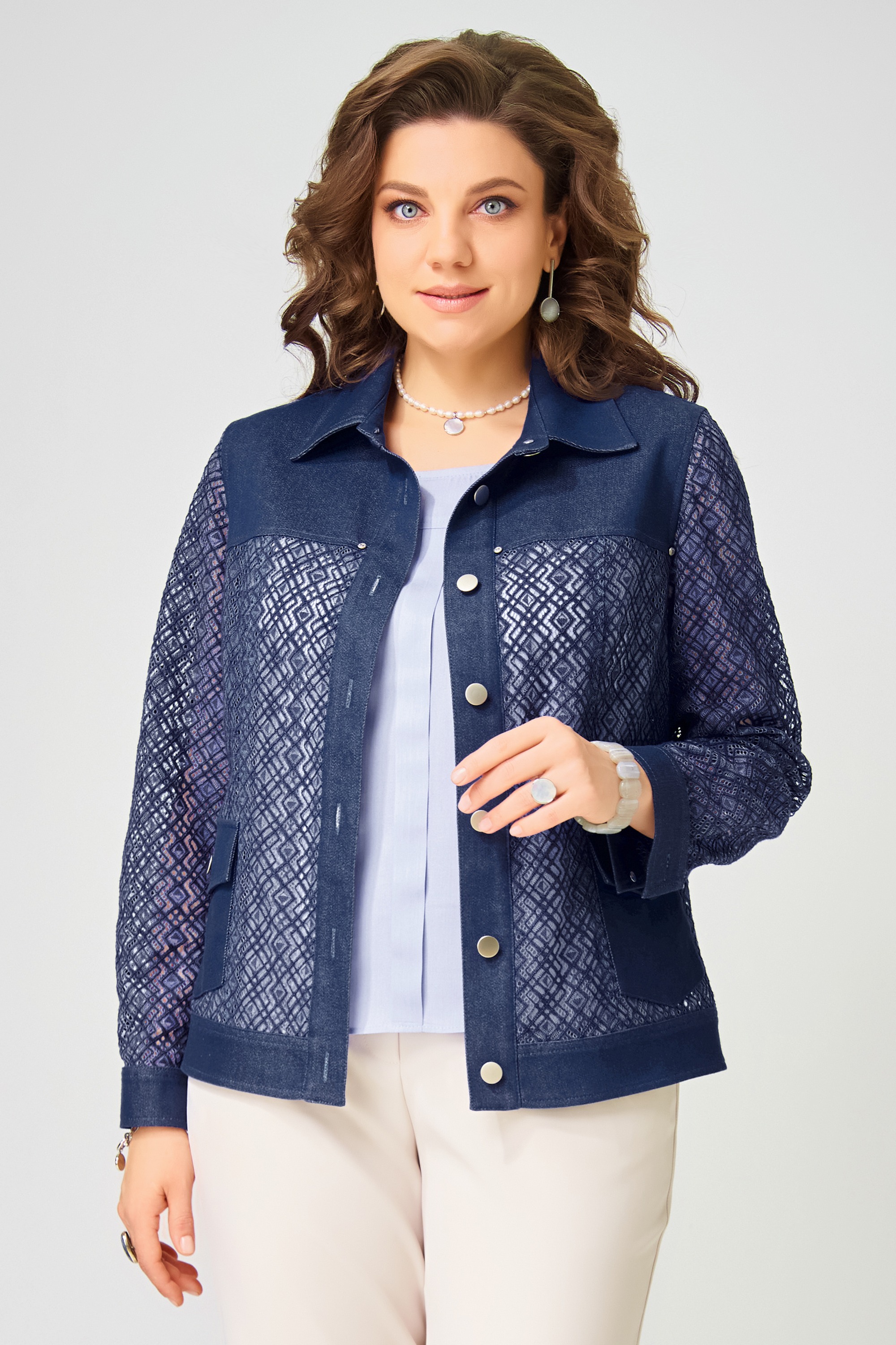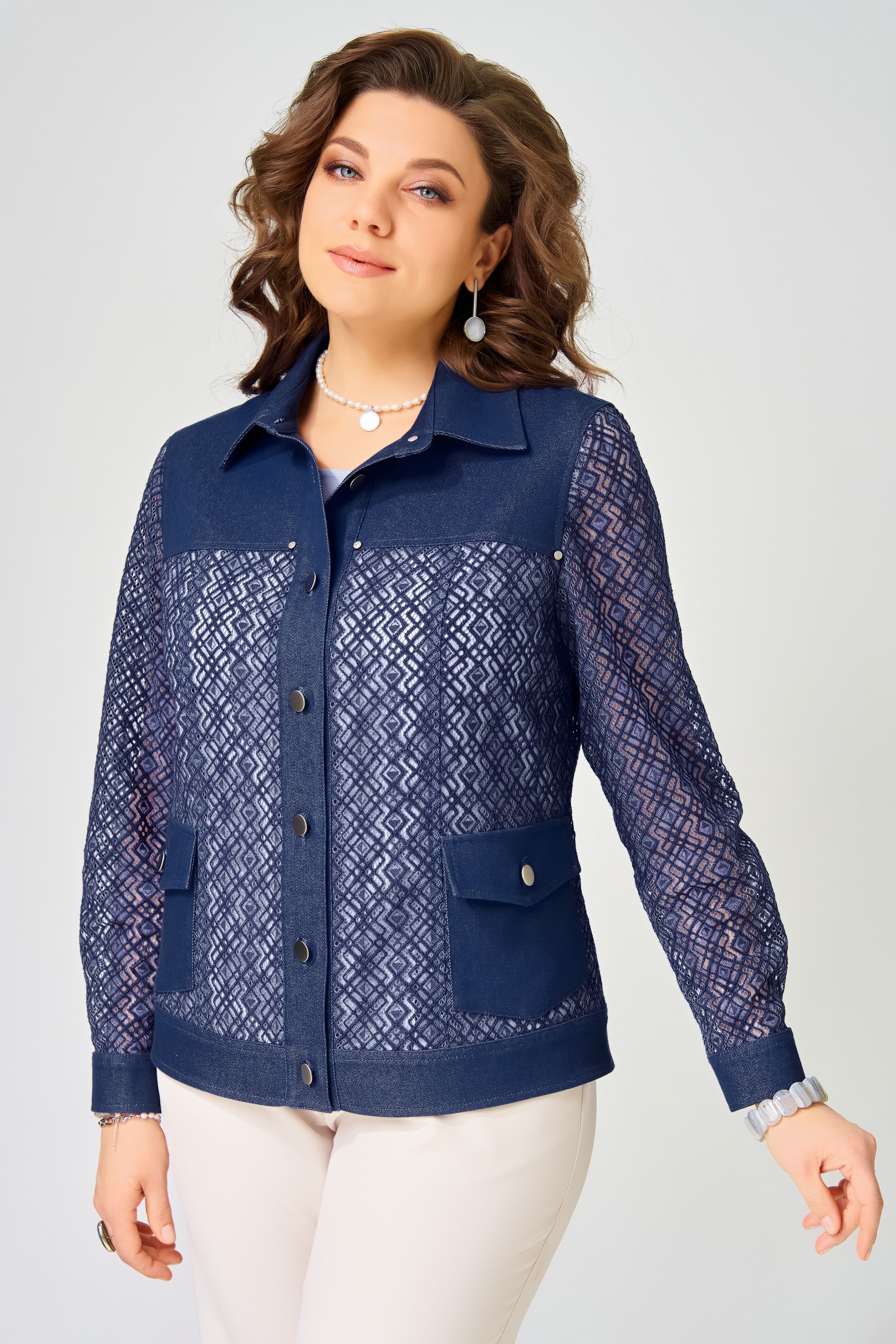 Жакет без подкладки, выполнен из кружевной и джинсовой ткани. Застежка в жакете однобортная на петли и пуговицы, планка по борту отрезная, отсроченная отделочными строчками. По полочке - кокетка и рельефы. Карманы накладные с клапаном и с застежкой на петли и пуговицы. По спинке - кокетка и рельефы. Рукава в жакете втачные двухшовные, по низу рукава - манжет с застежкой на петли и пуговицы. Воротник отложной рубашечного типа со стойкой, по низу жакета отрезной пояс, отсроченный отделочной строчкой. На кокетке полочки.